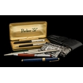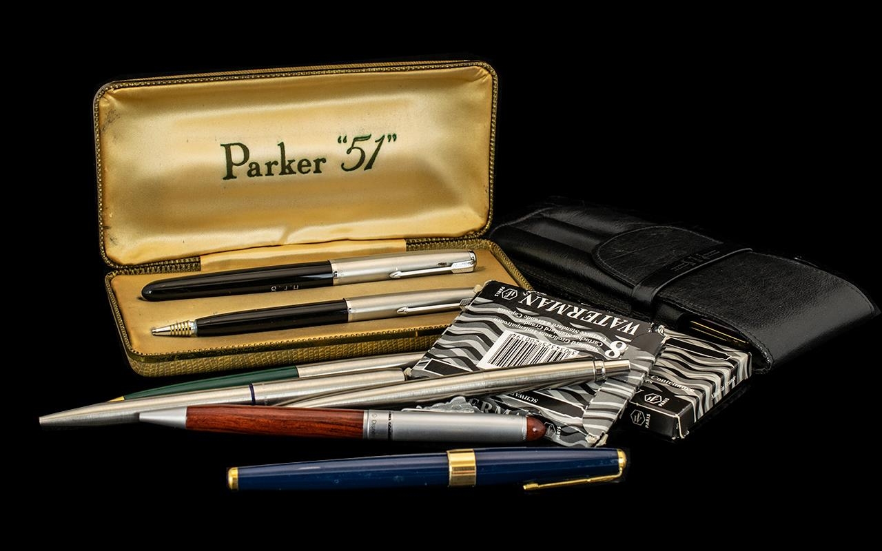Collection of Pens to include vintage Parker '51' set of fountain pen and pencil in original box; Parker navy fountain pen; set by Waterman of Paris comprising fountain pen, biro and pencil in burgundy with gilt trim, all in black soft case; Winnie-the-Pooh biro; a stainless steel Parker biro; and two other pens. Please see images.