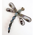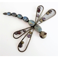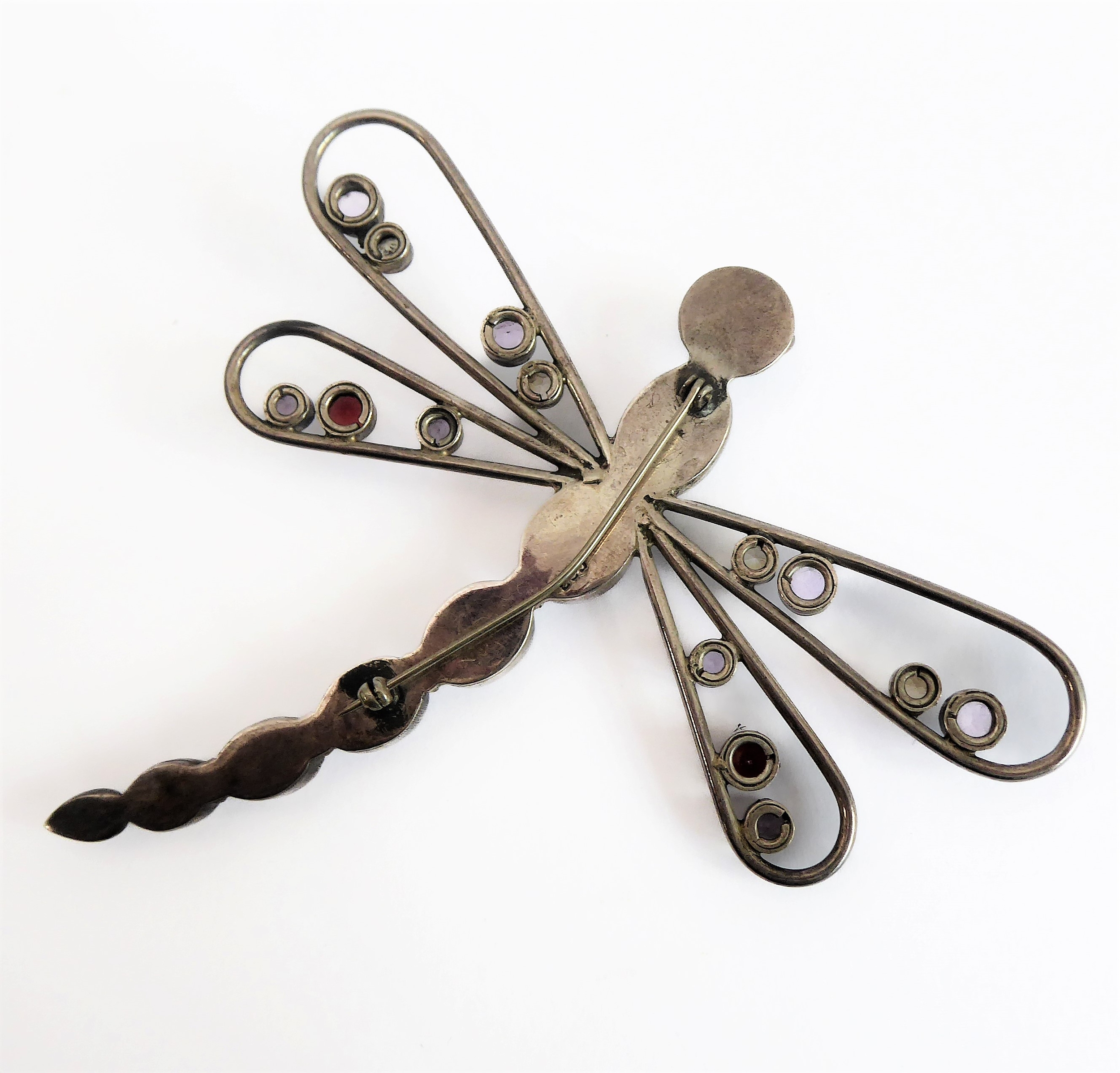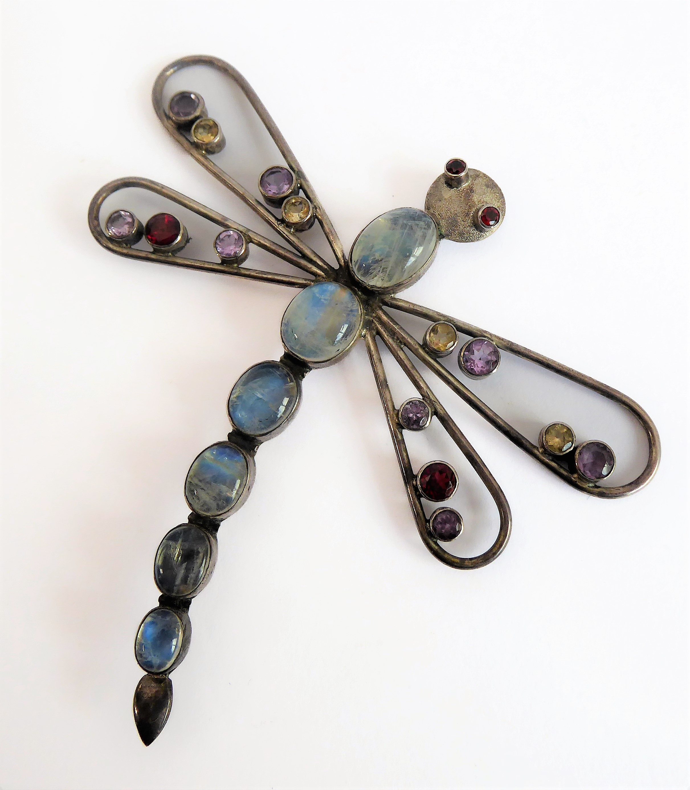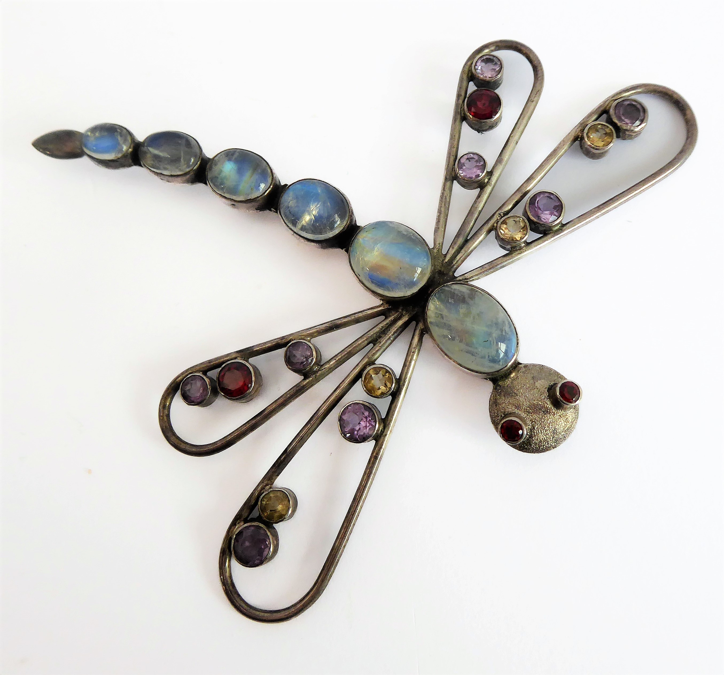 A good, large and unusual silver (stamped 925) brooch in the form of a dragonfly: multi gem-set with a graduated six sectional moonstone-style tail and the wings also set with various cut gemstones (9.25cm high, the wings 9.5cm widest)