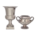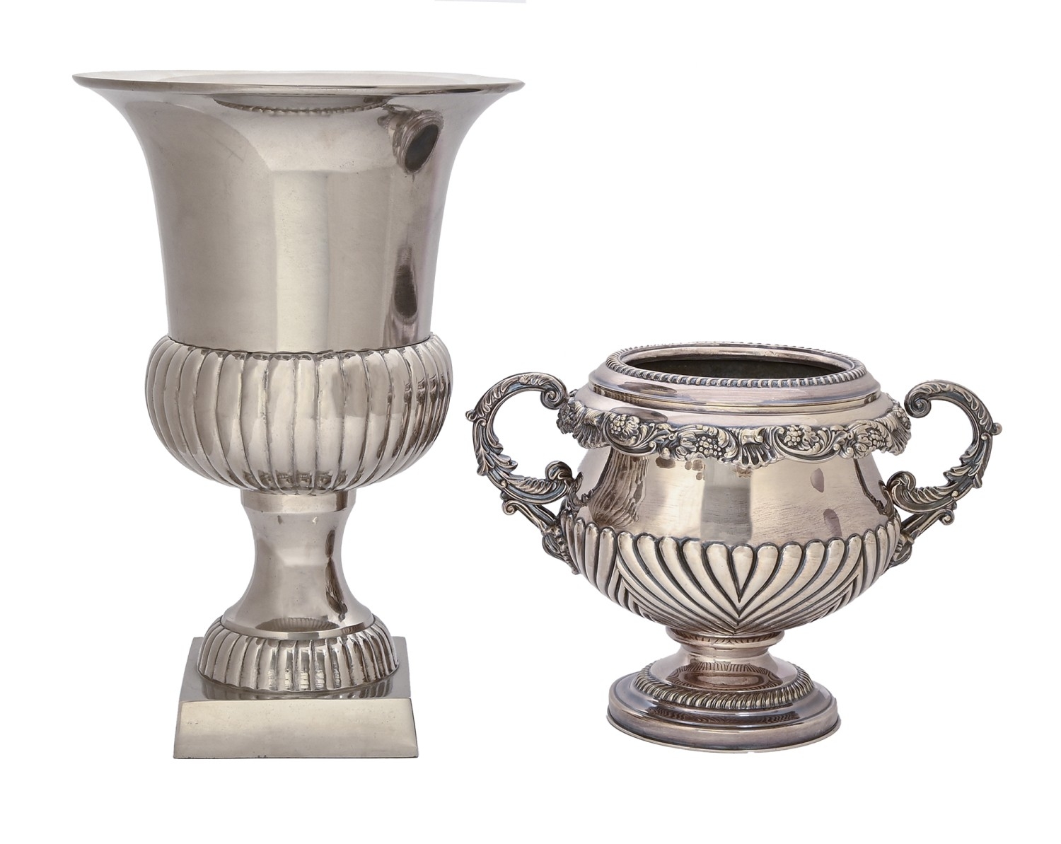A Mappin & Webb princes plate twin-handled champagne cooler, with zinc liner, 22cm h and another campana shaped example, 38cm h