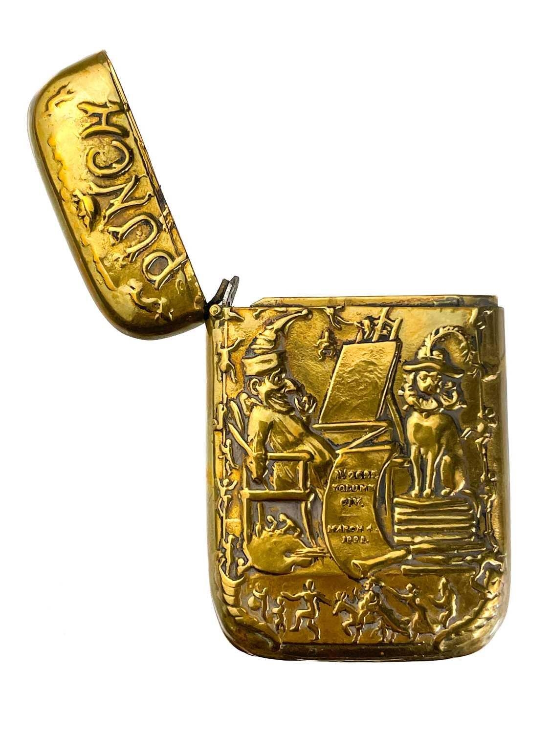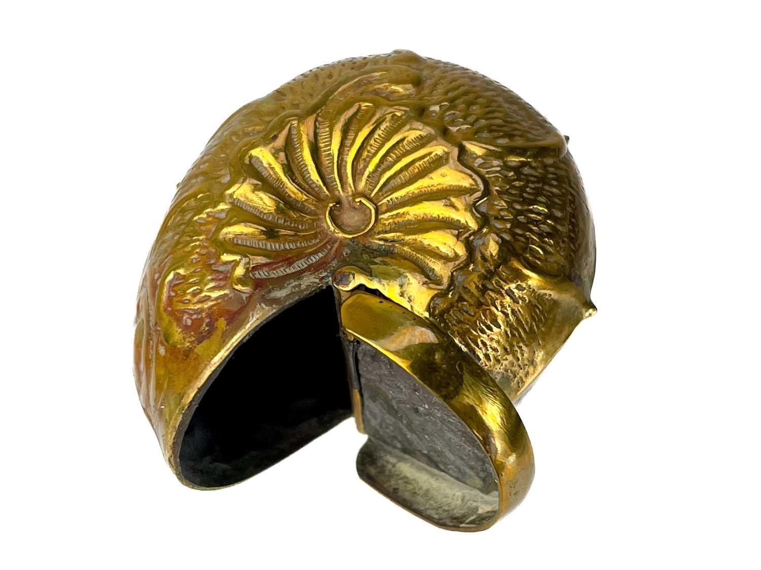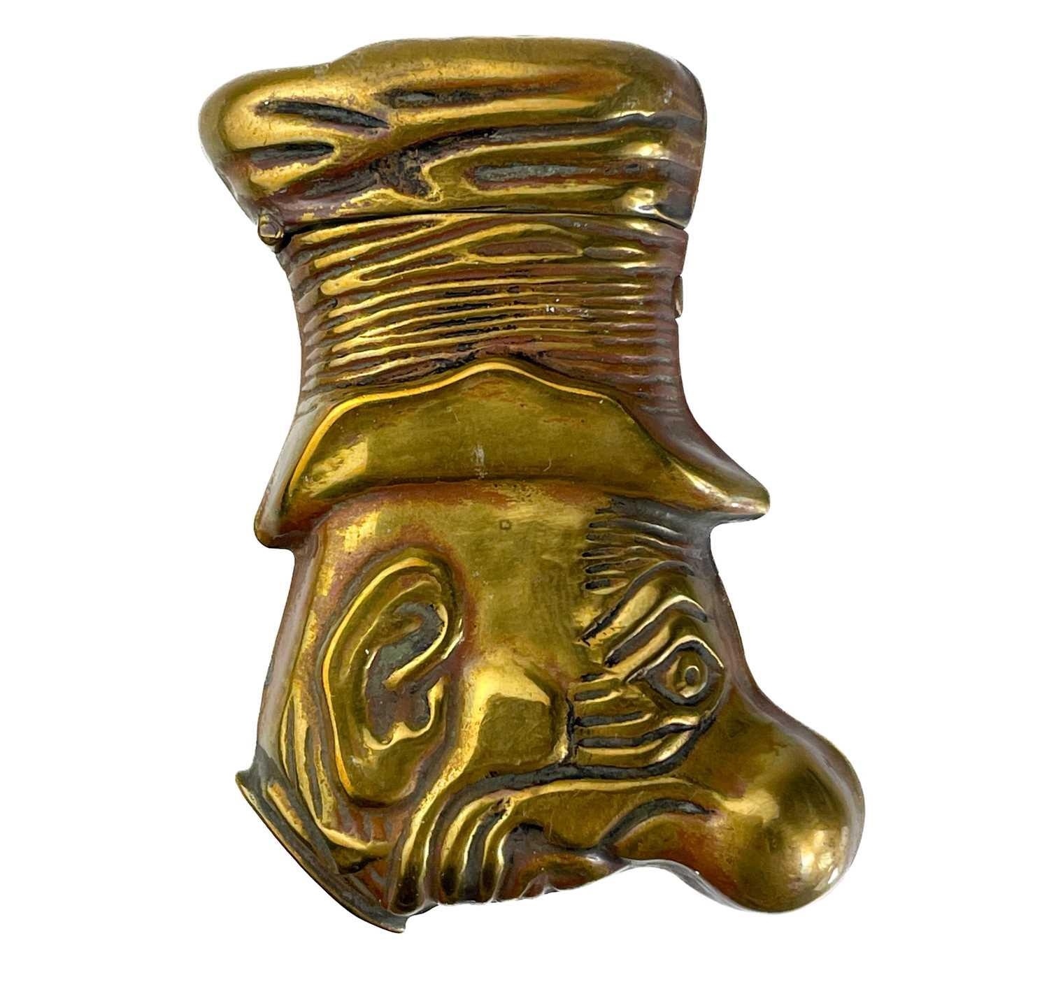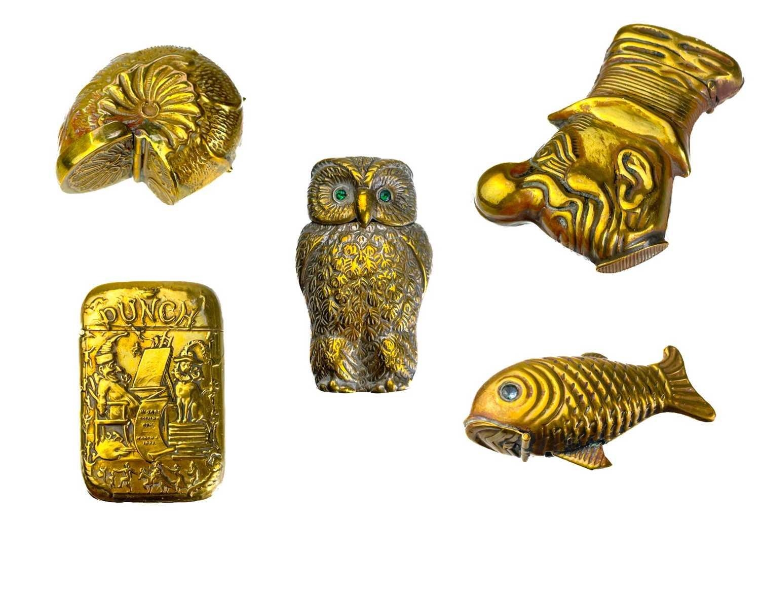 Five Victorian nickel plated brass vesta cases. Comprising: an owl with green glass eyes, a fish with spring operated mouth and glass eyes, an Ally Soper head, a nautilus shell and a Punch example. (5)