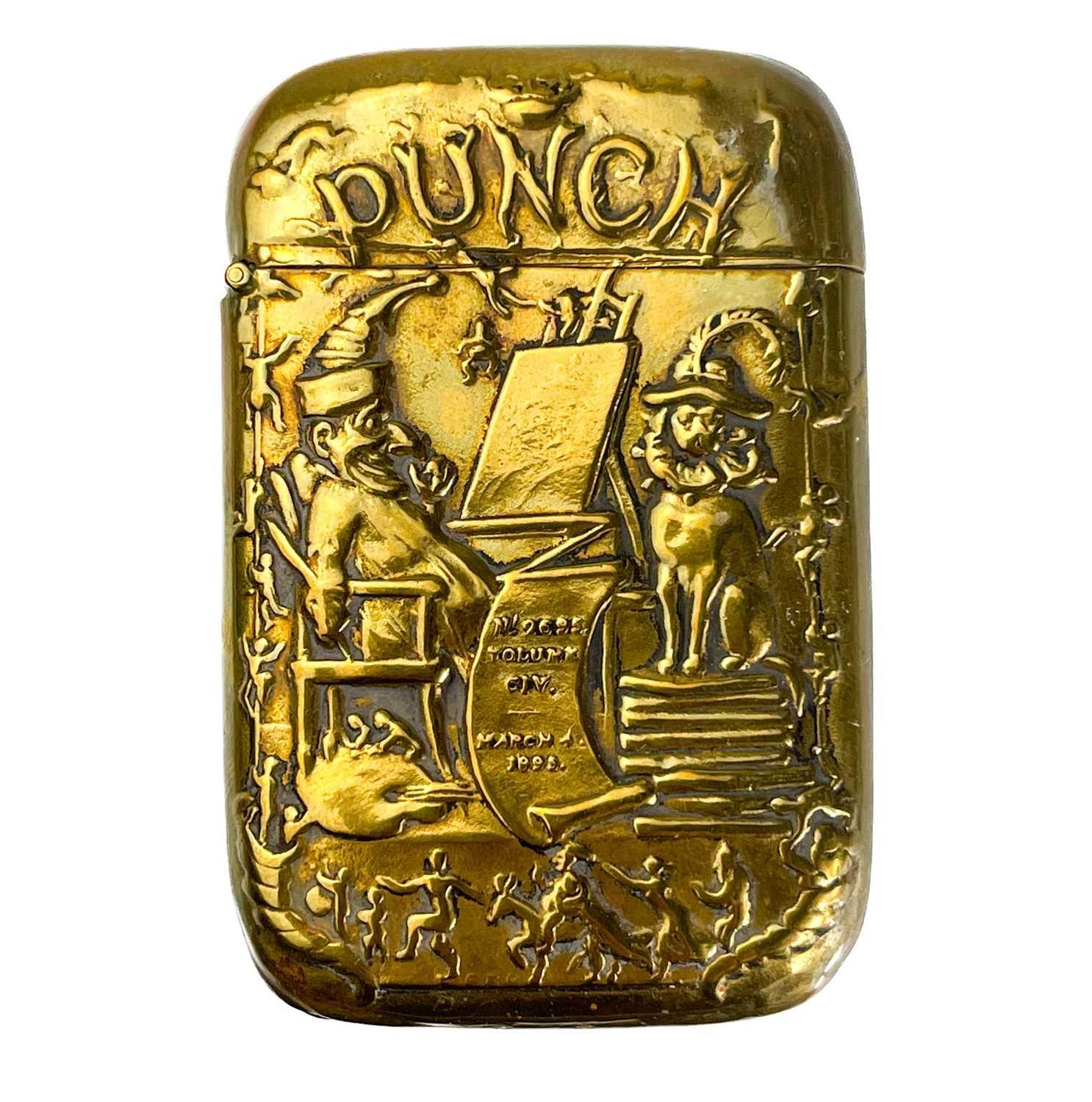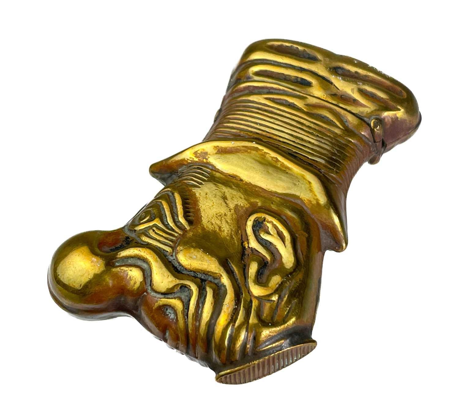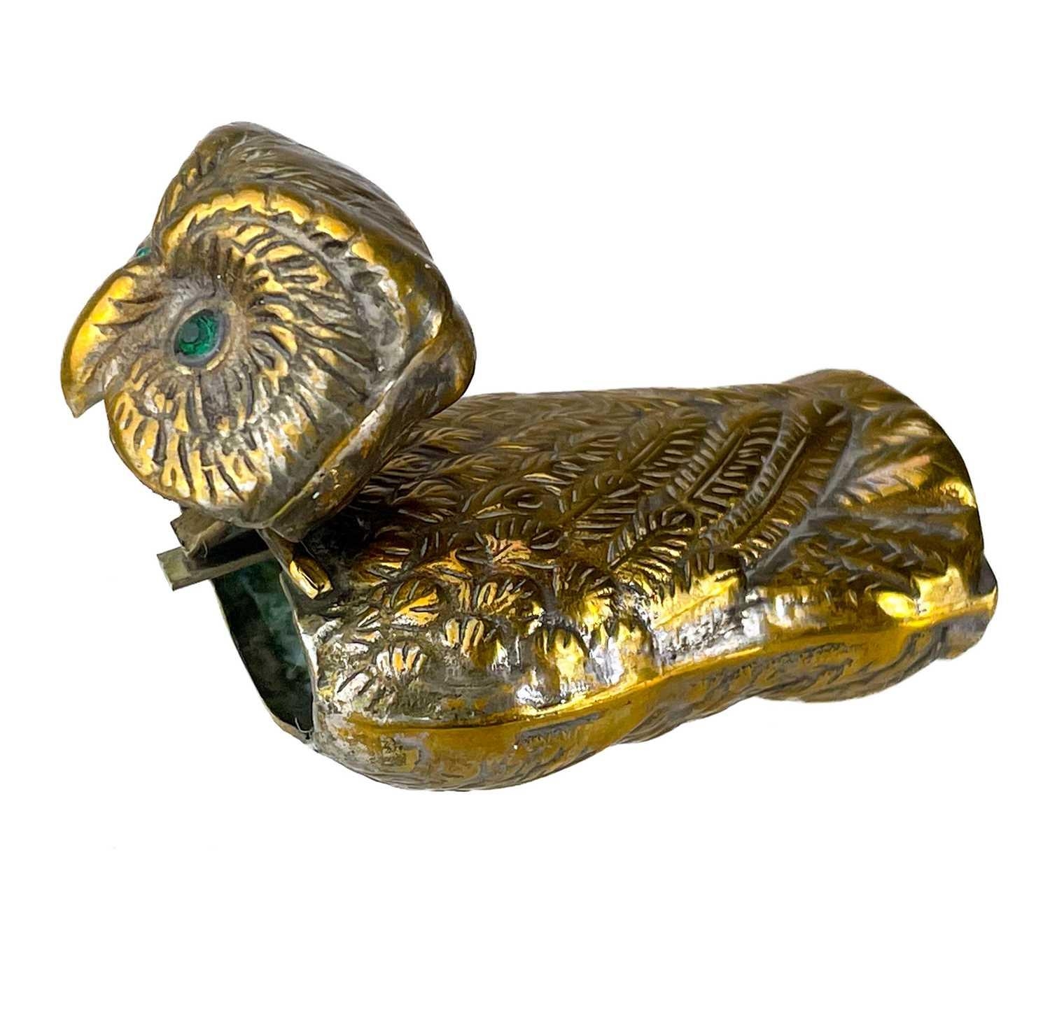 Five Victorian nickel plated brass vesta cases. Comprising: an owl with green glass eyes, a fish with spring operated mouth and glass eyes, an Ally Soper head, a nautilus shell and a Punch example. (5)