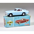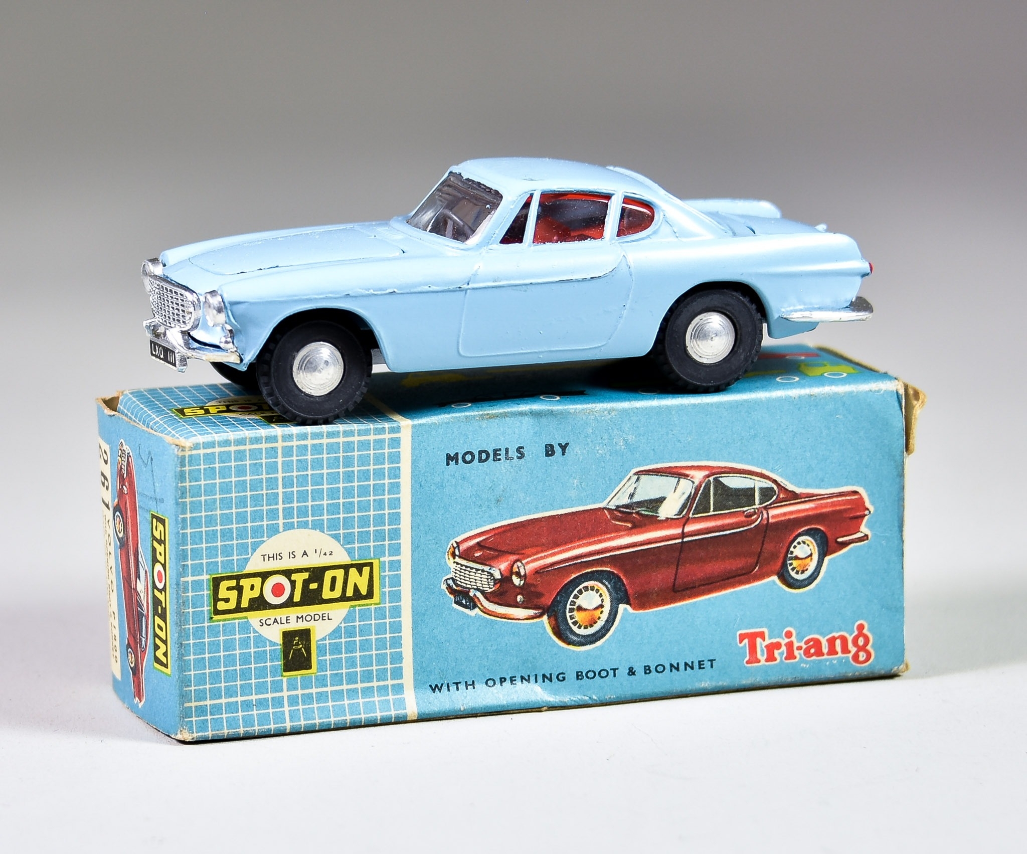 A Triang Spot On Diecast Model Car No. 261 "Volvo P1800", with light blue body, red interior, grey steering wheel, chrome trim and spun hubs, in original box with insert