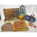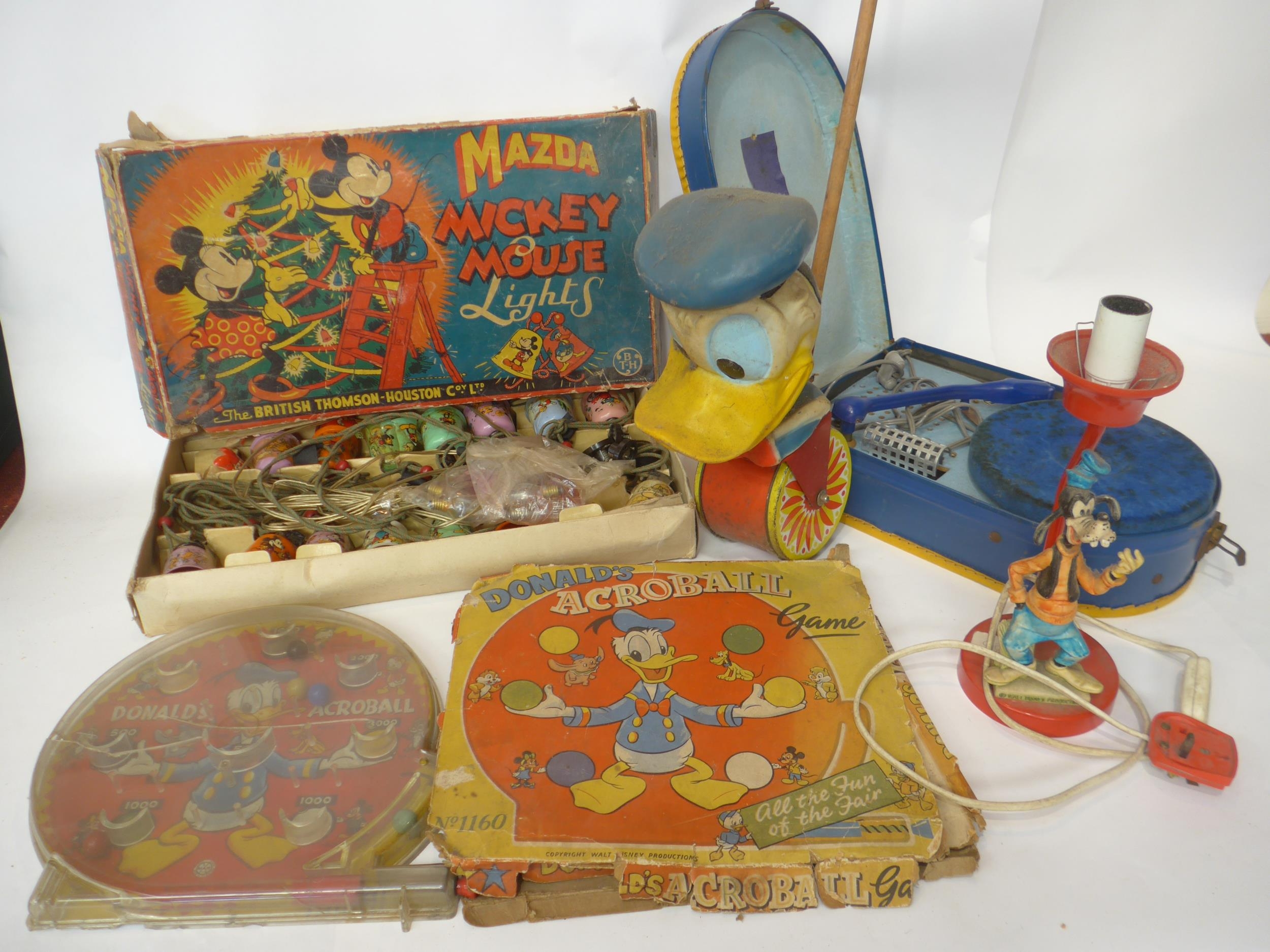 Group of vintage Disney items to include Mickey Mouse Electro Baby record player, Donald Duck Acroball game, Mazda Mickey Mouse lights, Goofy lamp and a Donald Duck push along