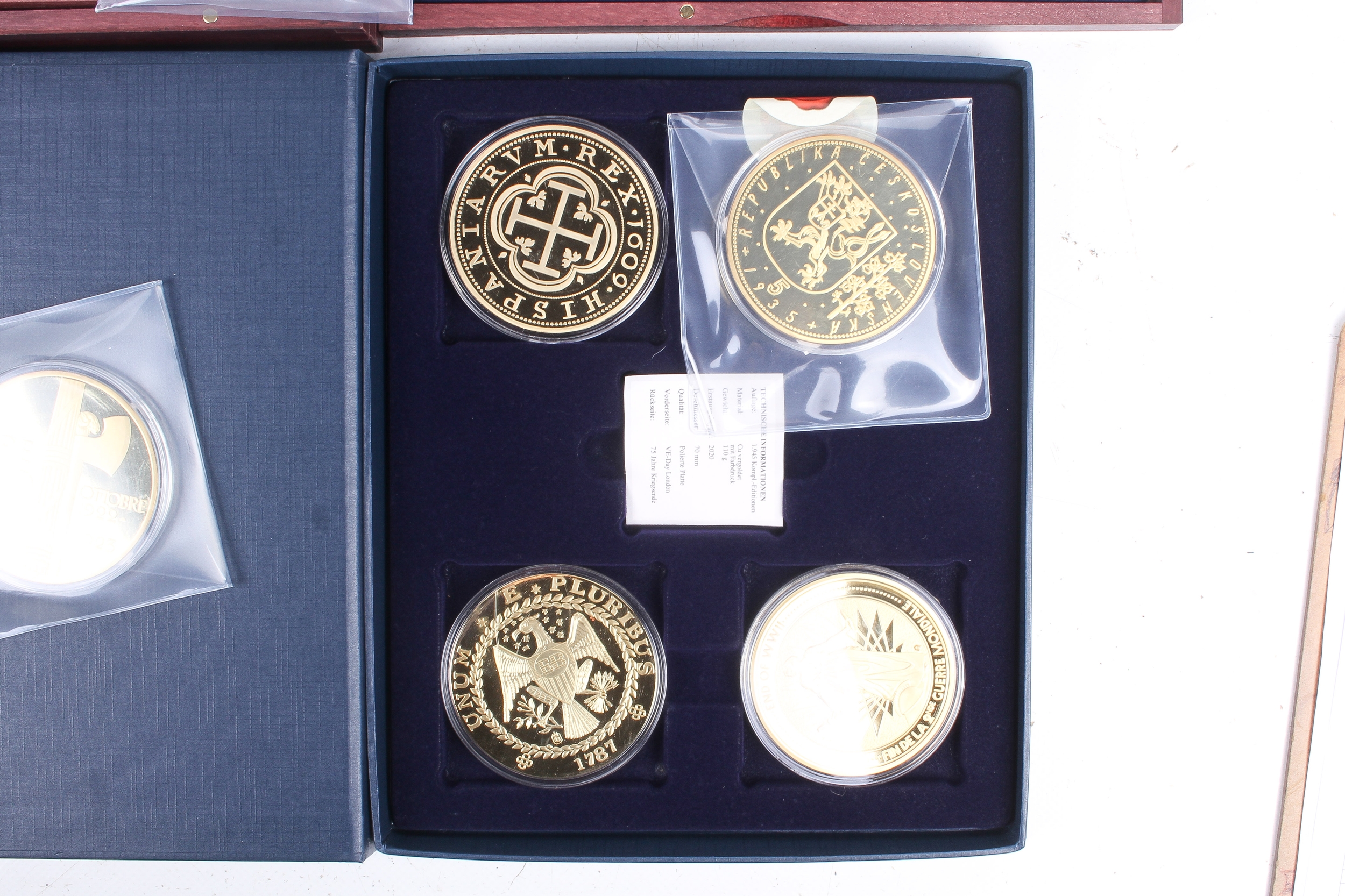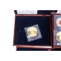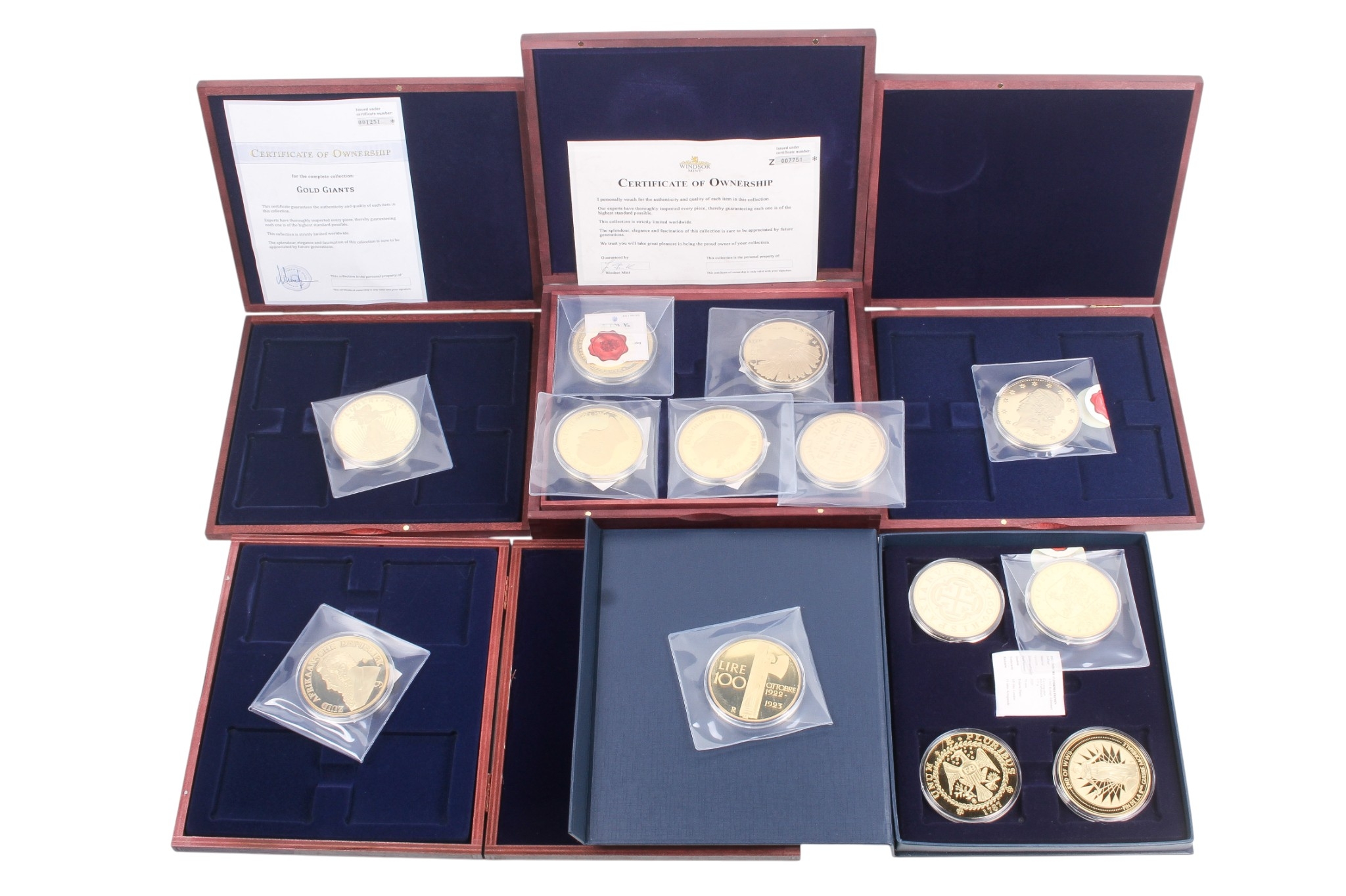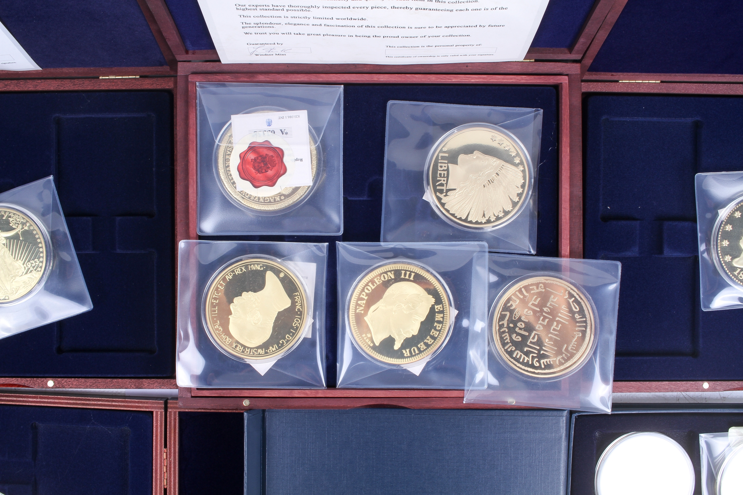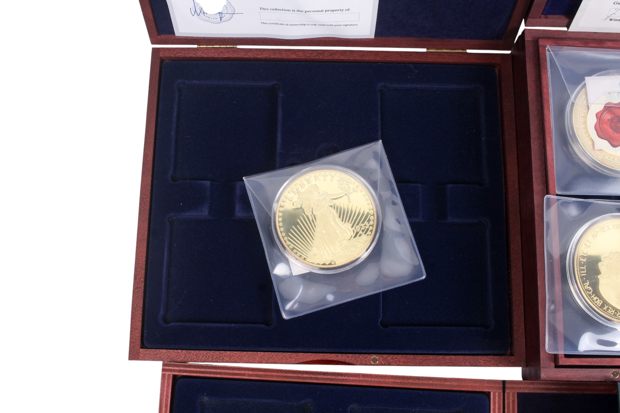 Seventeen giant replica gold plated famous world coins. Including England, Italy and USA, etc, in five boxes.