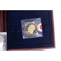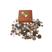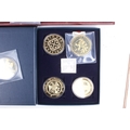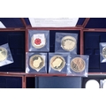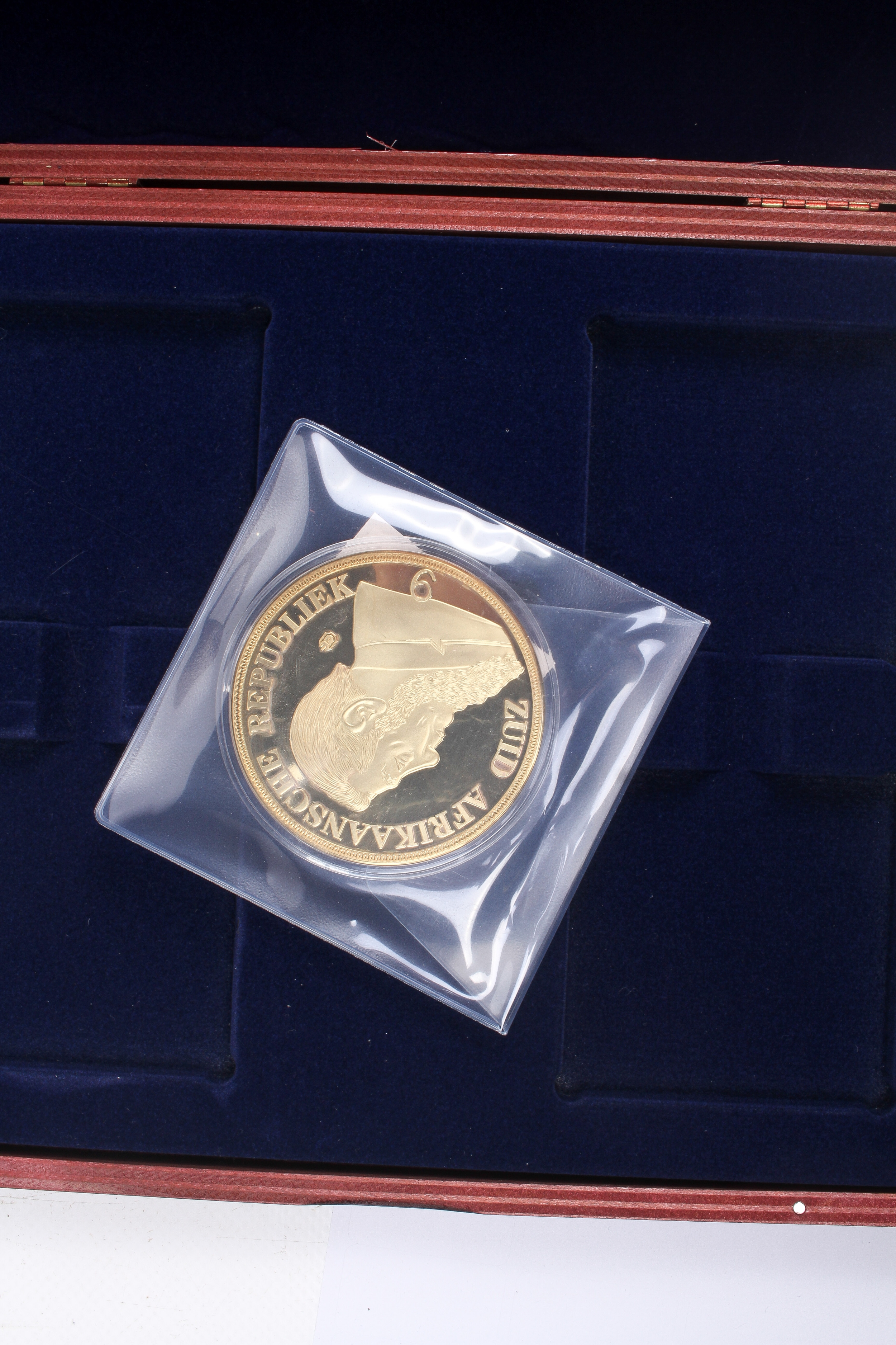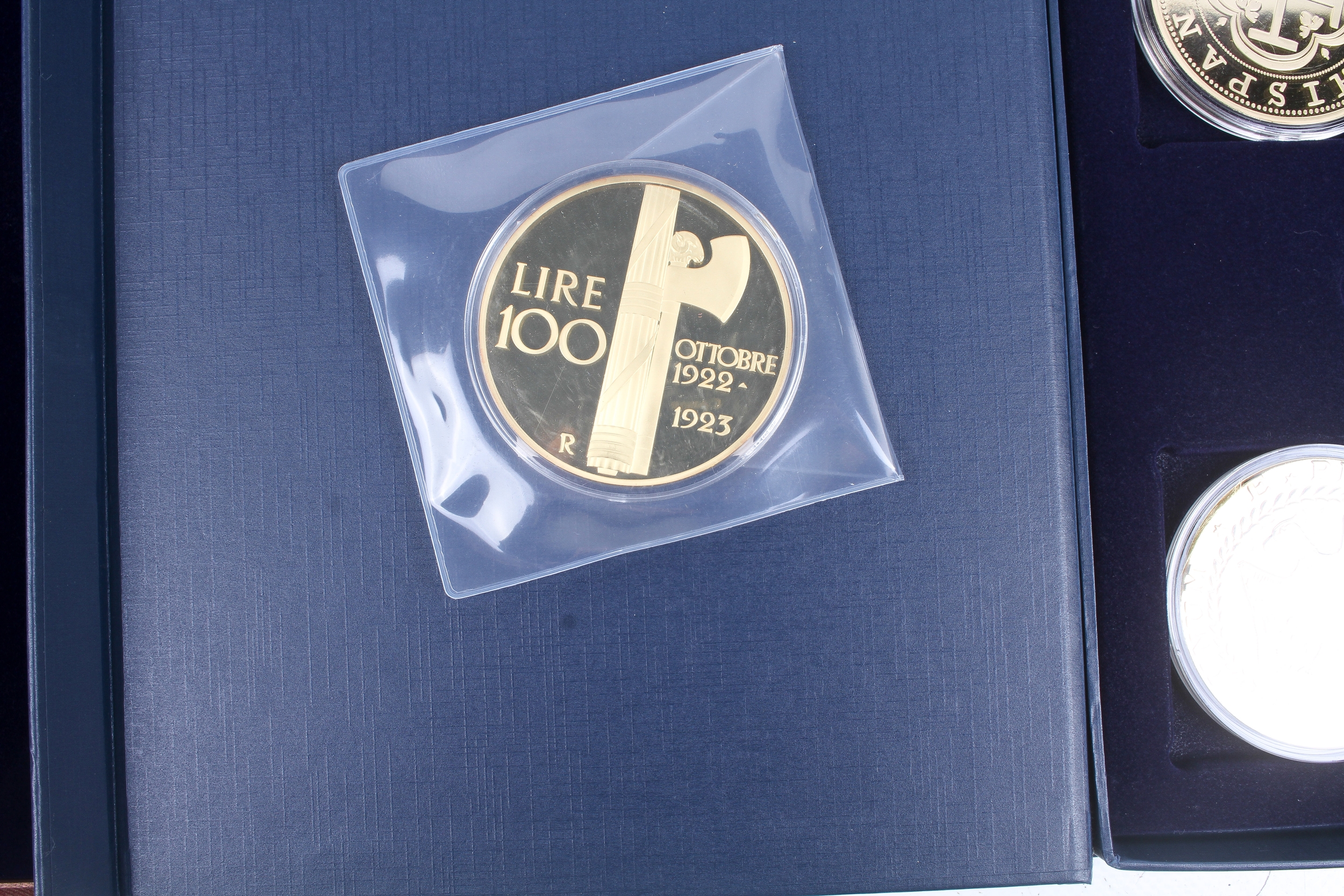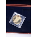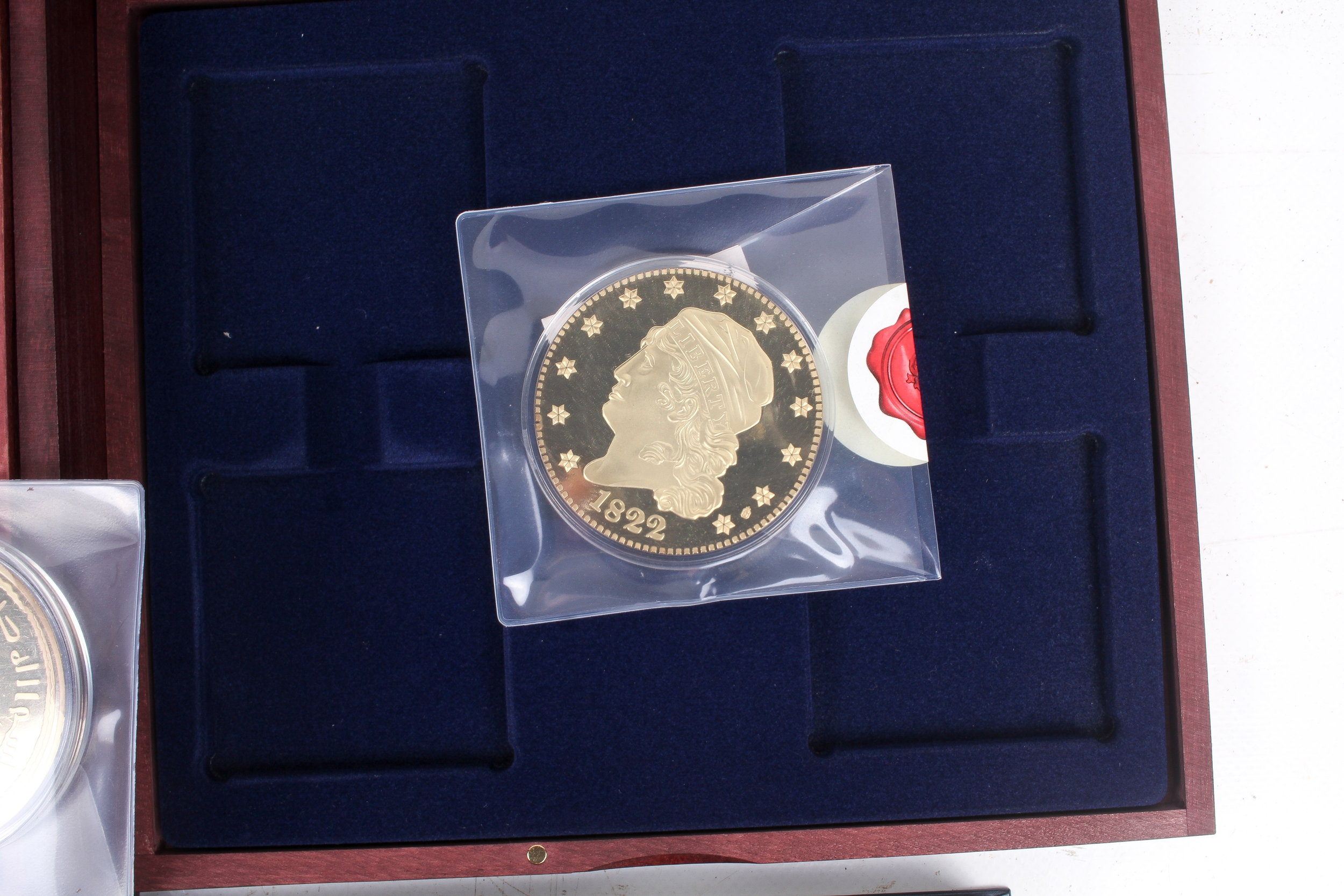 Seventeen giant replica gold plated famous world coins. Including England, Italy and USA, etc, in five boxes.