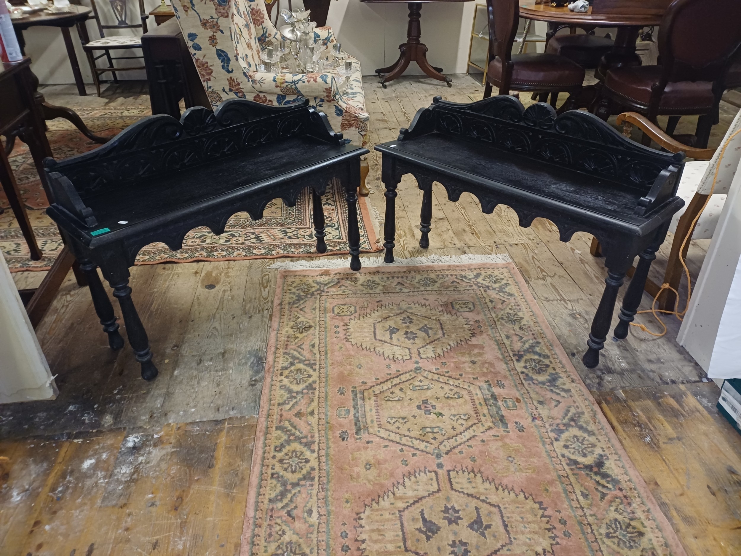 Pair of Edwardian Oak Hall Benchs (91cm x 28cm x 54cm)