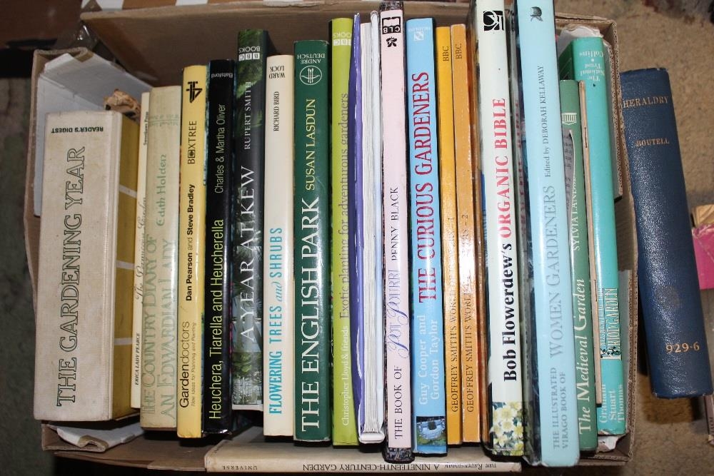 A BOX OF GARDENING BOOKS TO INCLUDE DAN PEARSON, AND GEOFFREY SMITH TOGETHER WITH A SMALL COLLECTION OF BOOKS AND HERALDRY INCLUDING BOUTELL
