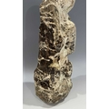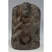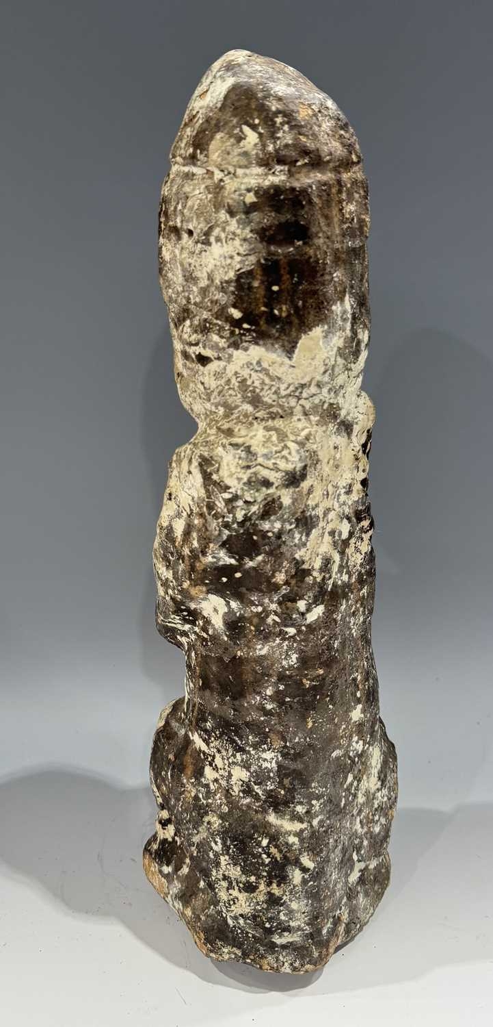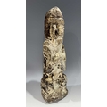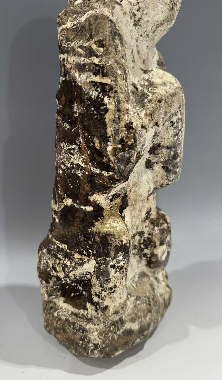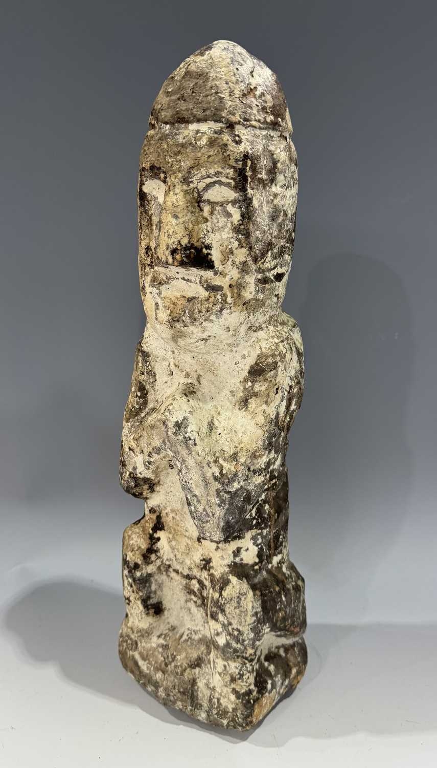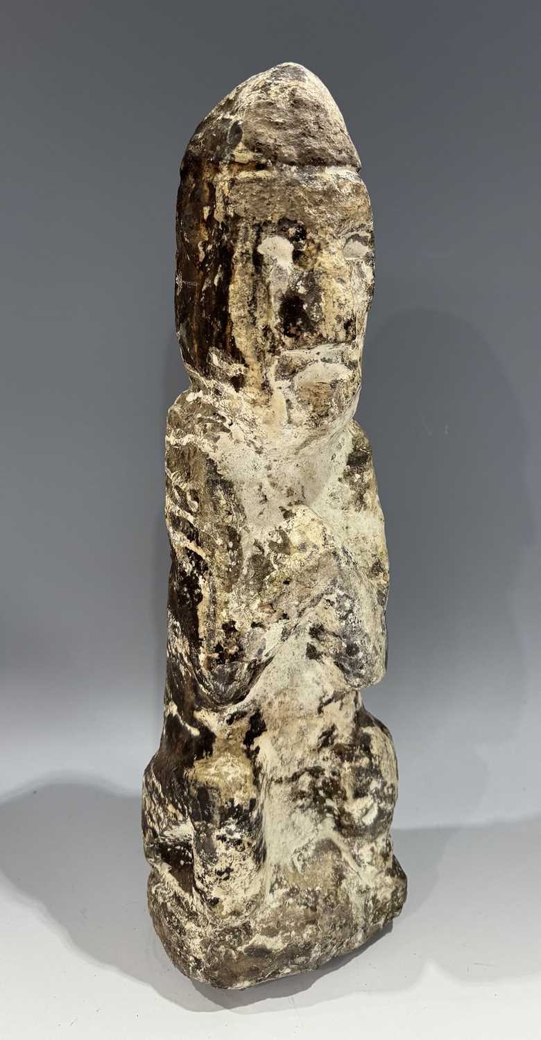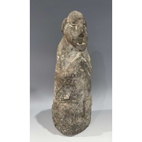 A protective Nepalese ancestor guardian figure, carved stone, Humla region, North West Nepal, 19th century or earlier, roughly carved as a seated figure with hands together in the Namaste pose, vernacular style, 40.5cm high Provenance: The Alain Rouveure Collection