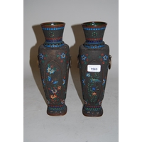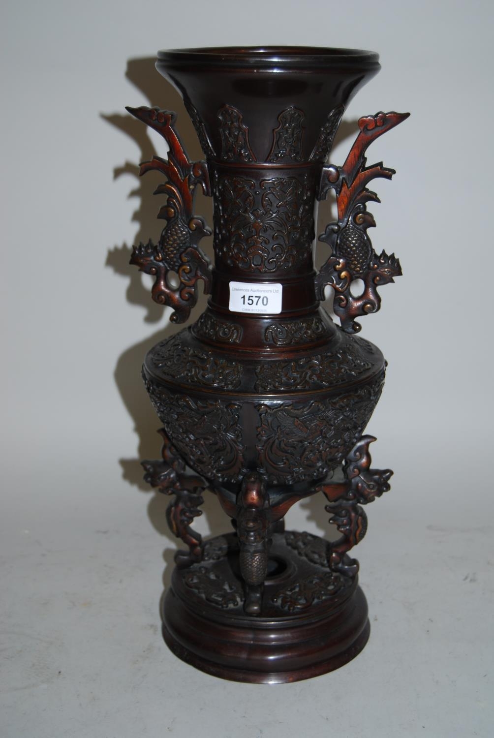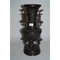 Large 20th Century Chinese dark patinated bronze baluster form vase with shallow relief decoration, stylised side handles and supports on a circular platform base, 17.5ins high