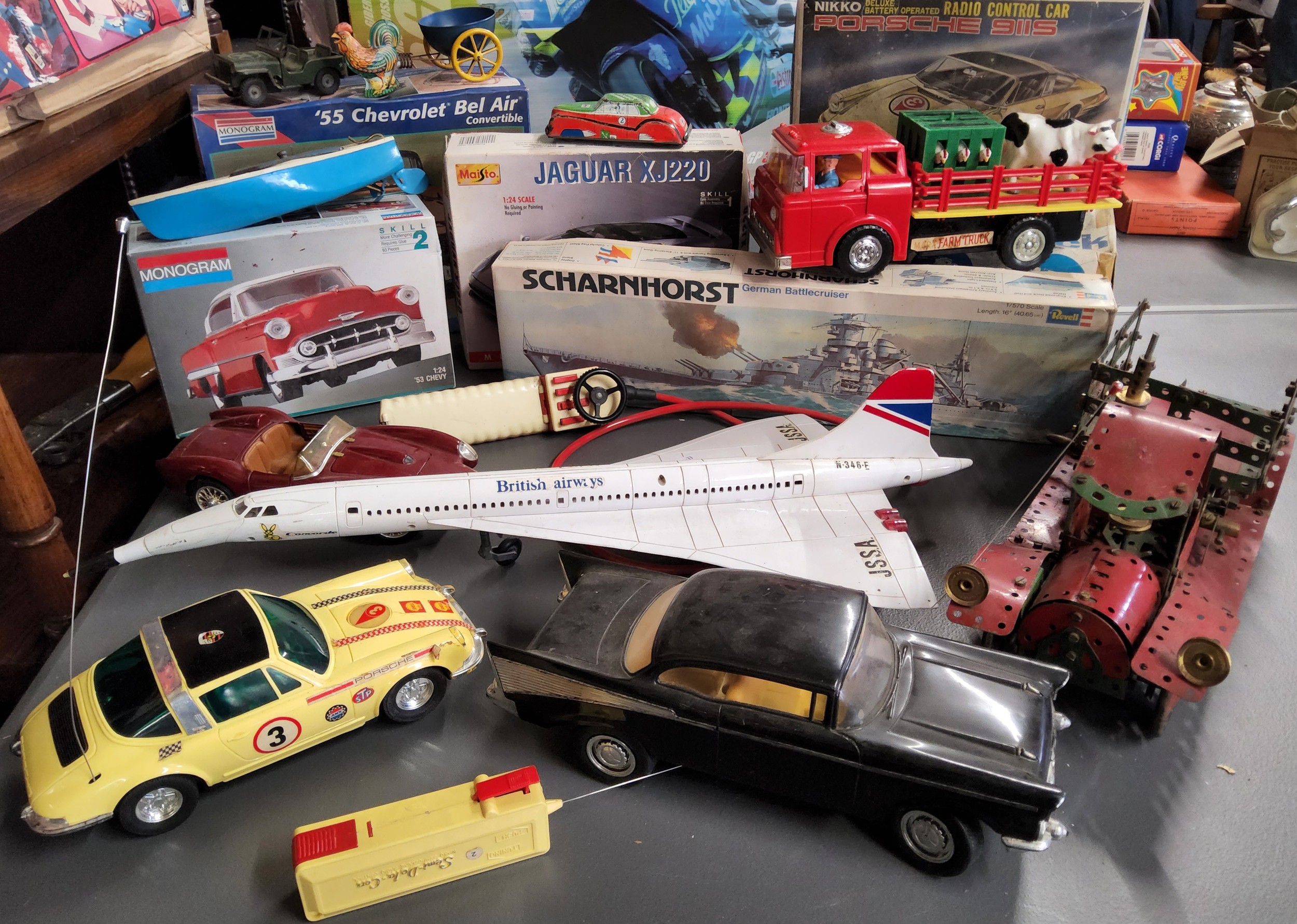 A Marx Farm Truck, trick action, moving rooster, hens & chicks, complete with cow & pig, boxed; a NIKKO Porsche 991S, remote controlled, boxed; a Spanish Sanchis British Airways remote controlled Concorde; a Chinese Toy State battery operated Chevrolet Bel Air Sport; a well constructed Meccano truck c1940's playworn; etc.