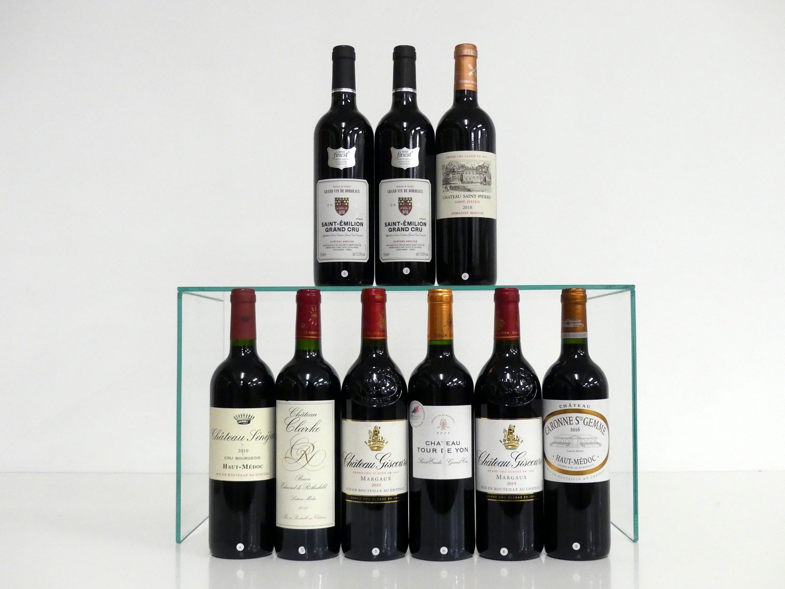 1 bt Ch. Sénéjac 2010 Haut-Médoc Cru Bourgeois hf/i.n, vsl stl 1 bt Ch. Clarke Baron Edmond de Rothschild 2010 Listrac Médoc i.n 1 bt Ch. Giscours 2010 Margaux Grand Cru Classé hf/i.n, vsl stl 1 bt Ch. Tour de Yon 2011 St-Émilion Grand Cru hf/i.n, scuffed label 1 bt Ch. Giscours 2015 Margaux Grand Cru Classé hf/i.n 1 bt Ch. Caronne Ste Gemme 2016 Haut-Médoc 2 bts Ch. Abelyce 2016 St-Émilion Grand Cru (Tesco) 1 bt Ch. Saint-Pierre 2018 St-Julien Grand Cru Classé Above 9 bottles