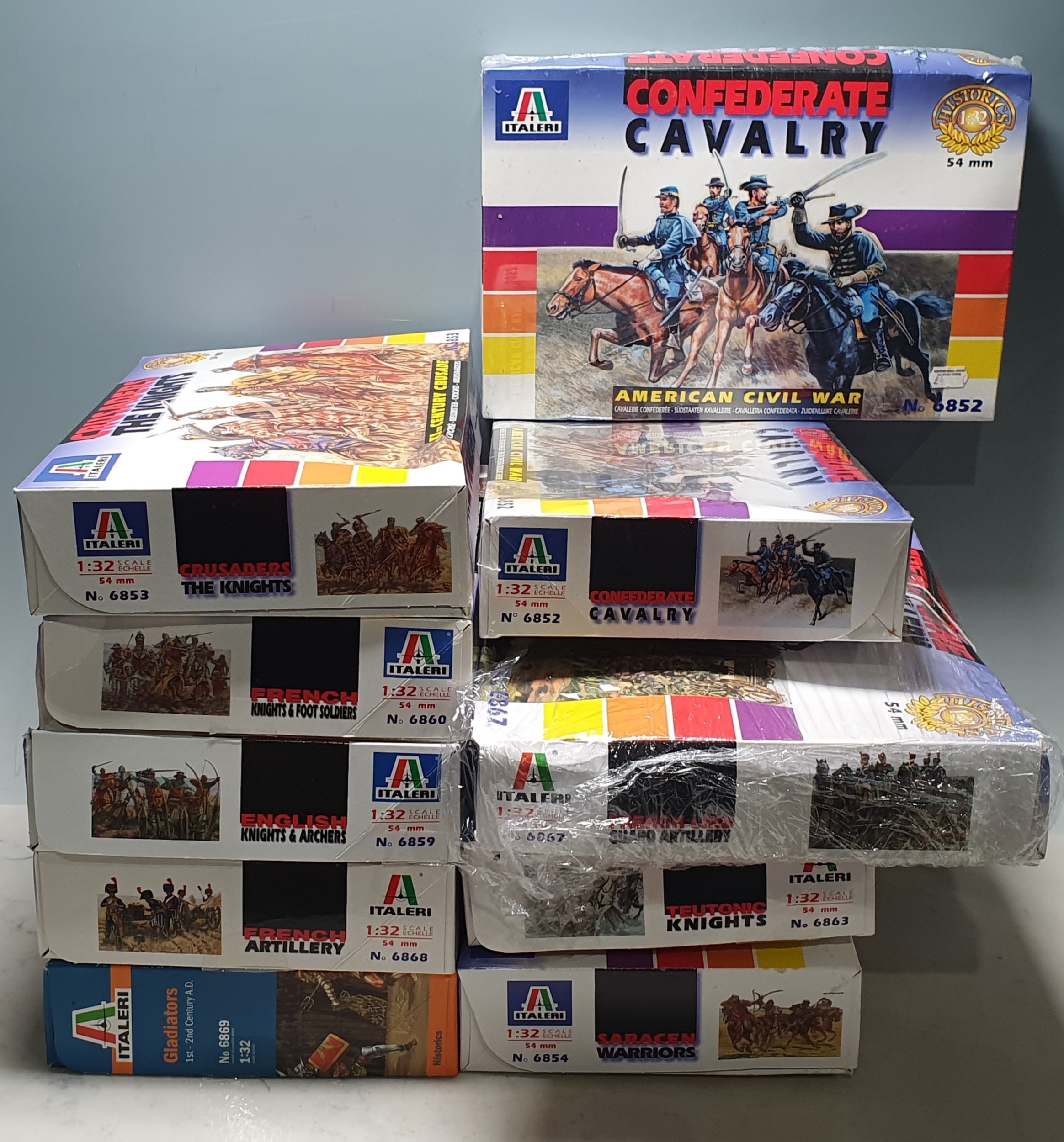 Ten boxed Italeri Sets of 1:32 scale Military Figures comprising No.6869 Gladiators 1-2nd Century A.D., No.6868 French Artillery, No.6859 English Knights & Archers, No.6860 French Knights & Foot Soldiers, No.6853 Crusaders The Knights, No.6854 Saracen Warriors, No.6863 Teutonic Knights, No.6867 French Line Guard Artillery, all opened but appear complete with most figures still on sprue, and two No.6852 American Civil War Confederate Cavalry, both sealed and unopened from new