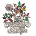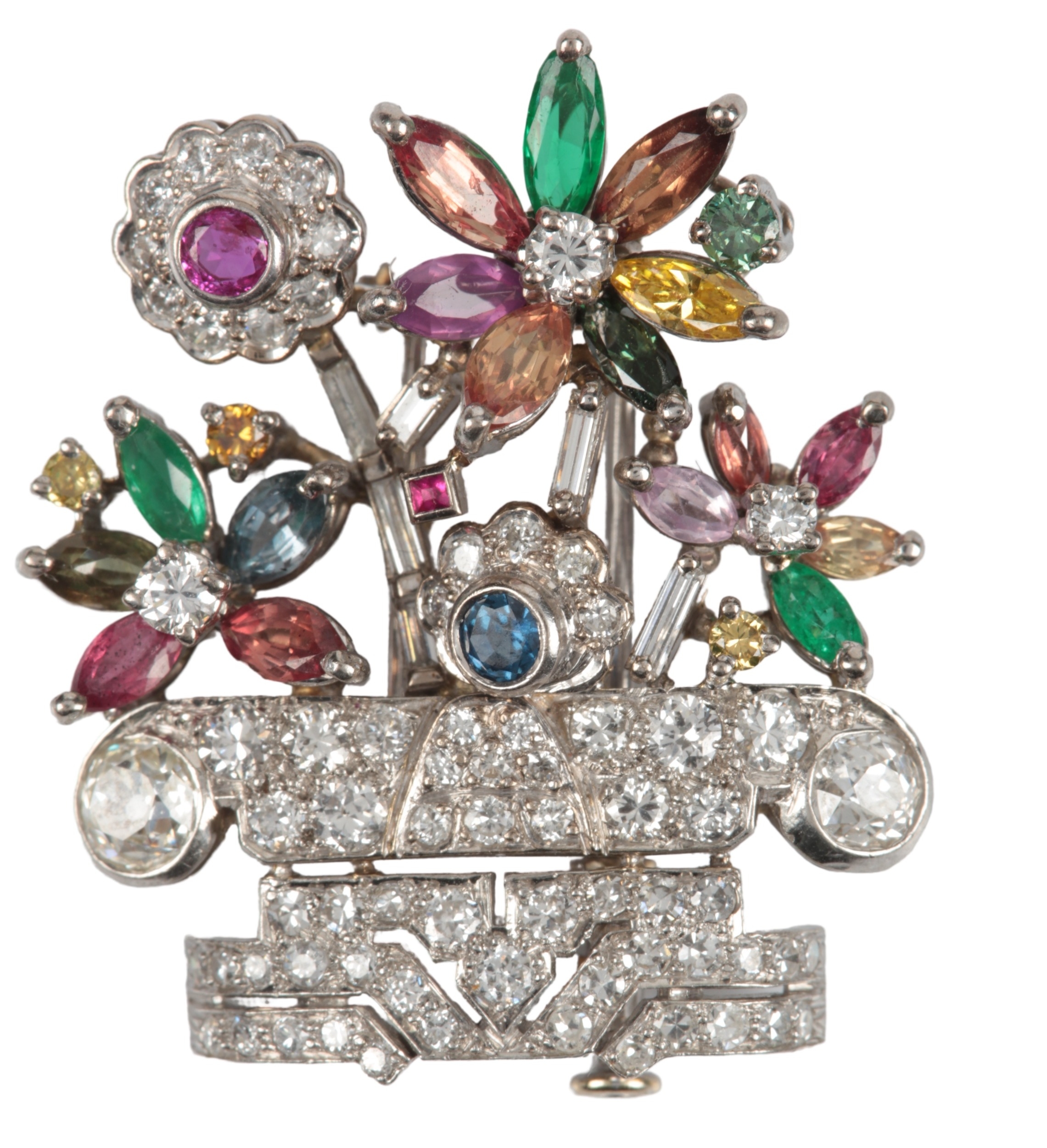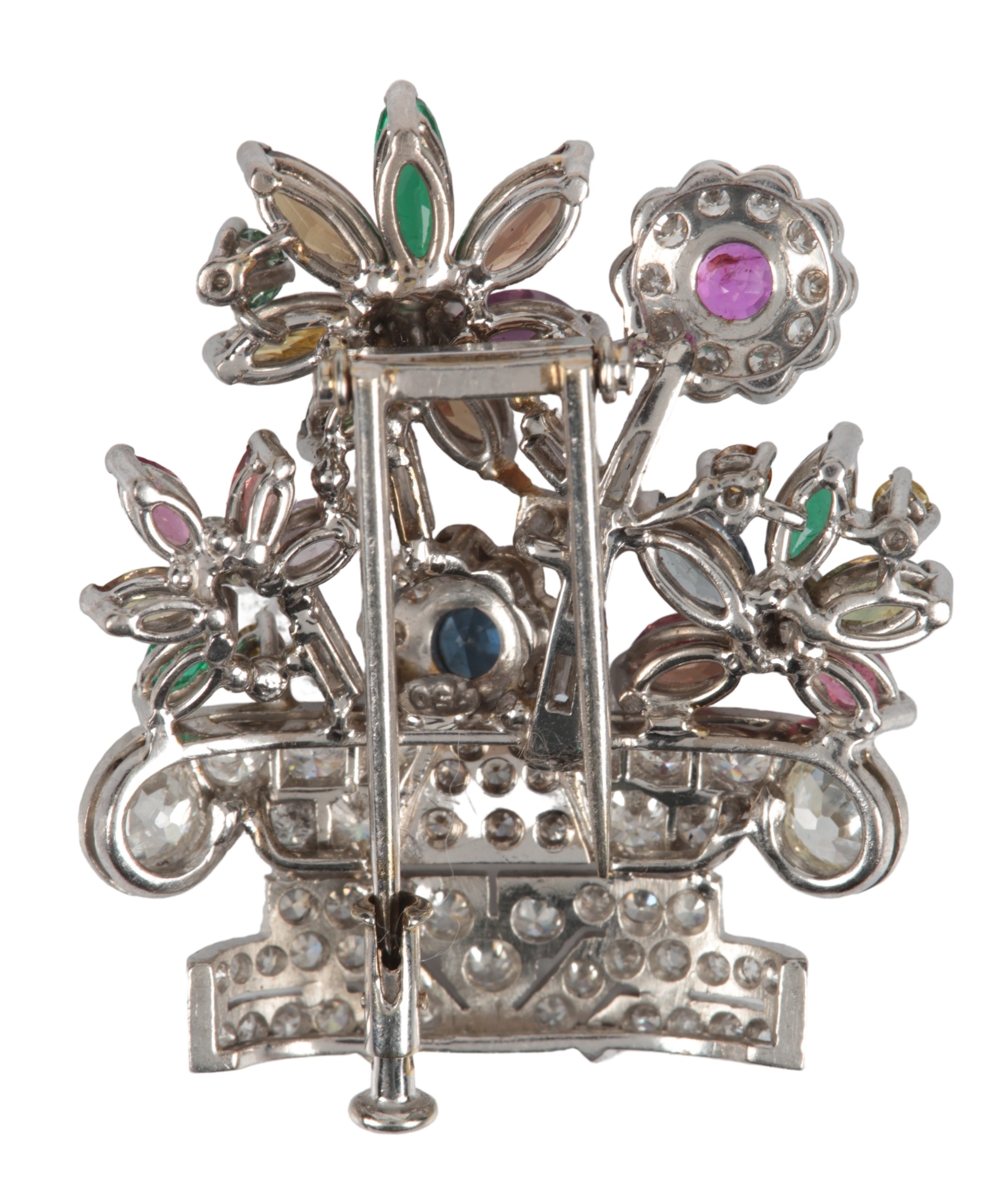 A multi-gem and diamond giardinetto brooch, designed as a planter filled with flowers, set with various marquise-shaped and circular-cut coloured stones including multicoloured sapphires, rubies and yellow and green diamonds, and circular- and single-cut diamonds totalling approximately 1.70 carats, mounted in white gold, length 3.2cm, stamped 750, gross weight approximately 12 grams, coloured diamonds untested for natural colour origin