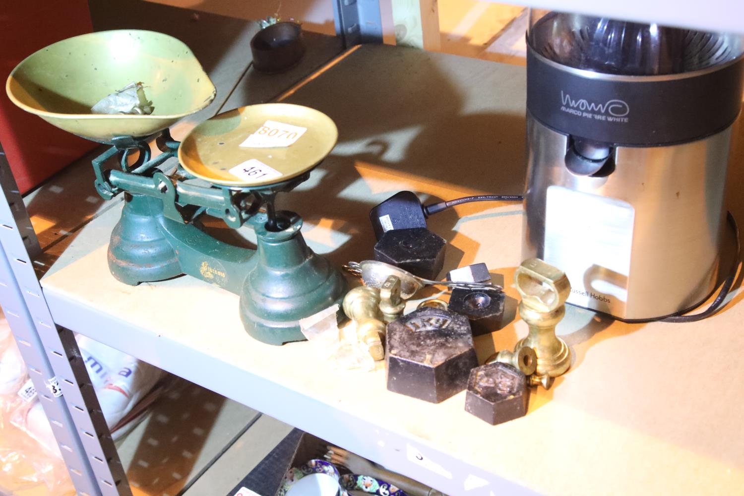 Set of metal scales and a quantity of brass weights. Not available for in-house P&P