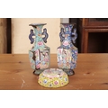 A MATCHED PAIR OF CHINESE ENAMELLED METAL TWO HANDLED VASES
