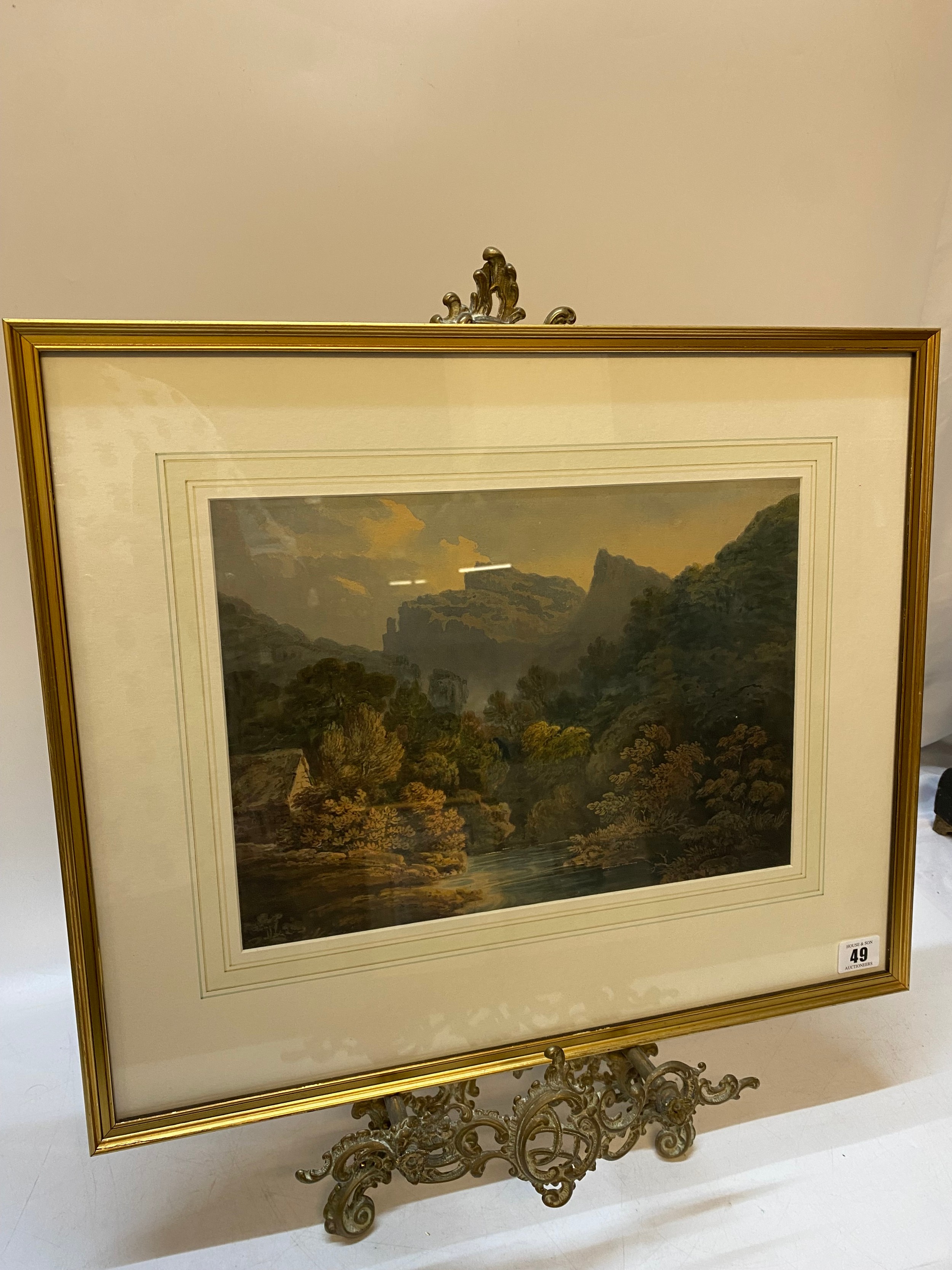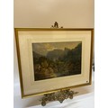 A 19th Century watercolour - Landscape scene with rocky mountains and river, cottage on the bank, mounted, framed and glazed - 9 1/2in. x 13in.