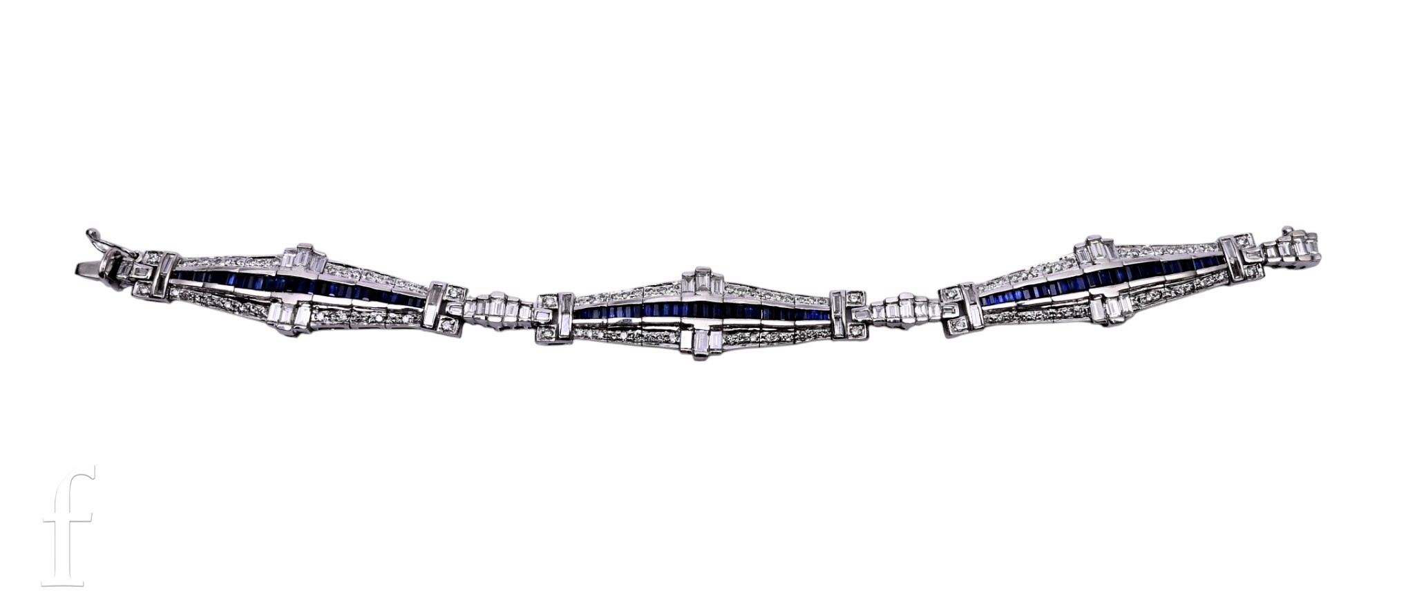 A sapphire and diamond bracelet, composed of three articulated tapering panels, set to the centre with baguette-cut sapphires, with brilliant and baguette-cut diamonds to the borders, spaced by baguette-cut diamond set articulated links, integral clasp, marked '18K', total weight 43.3g, 18.5cm long.