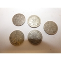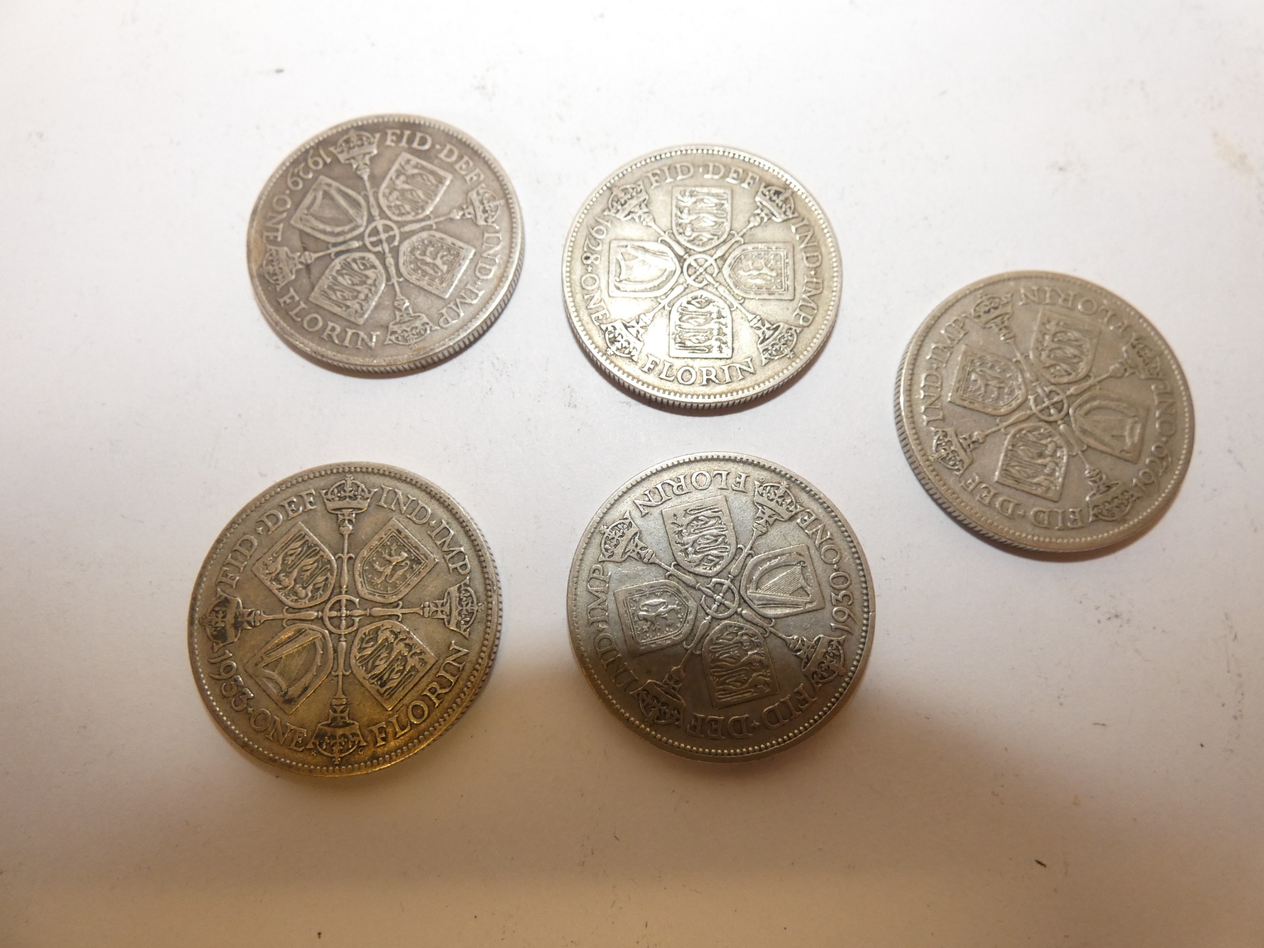 Five George V 500 grade silver florins, 1928, two 1929, 1930 and 1933.