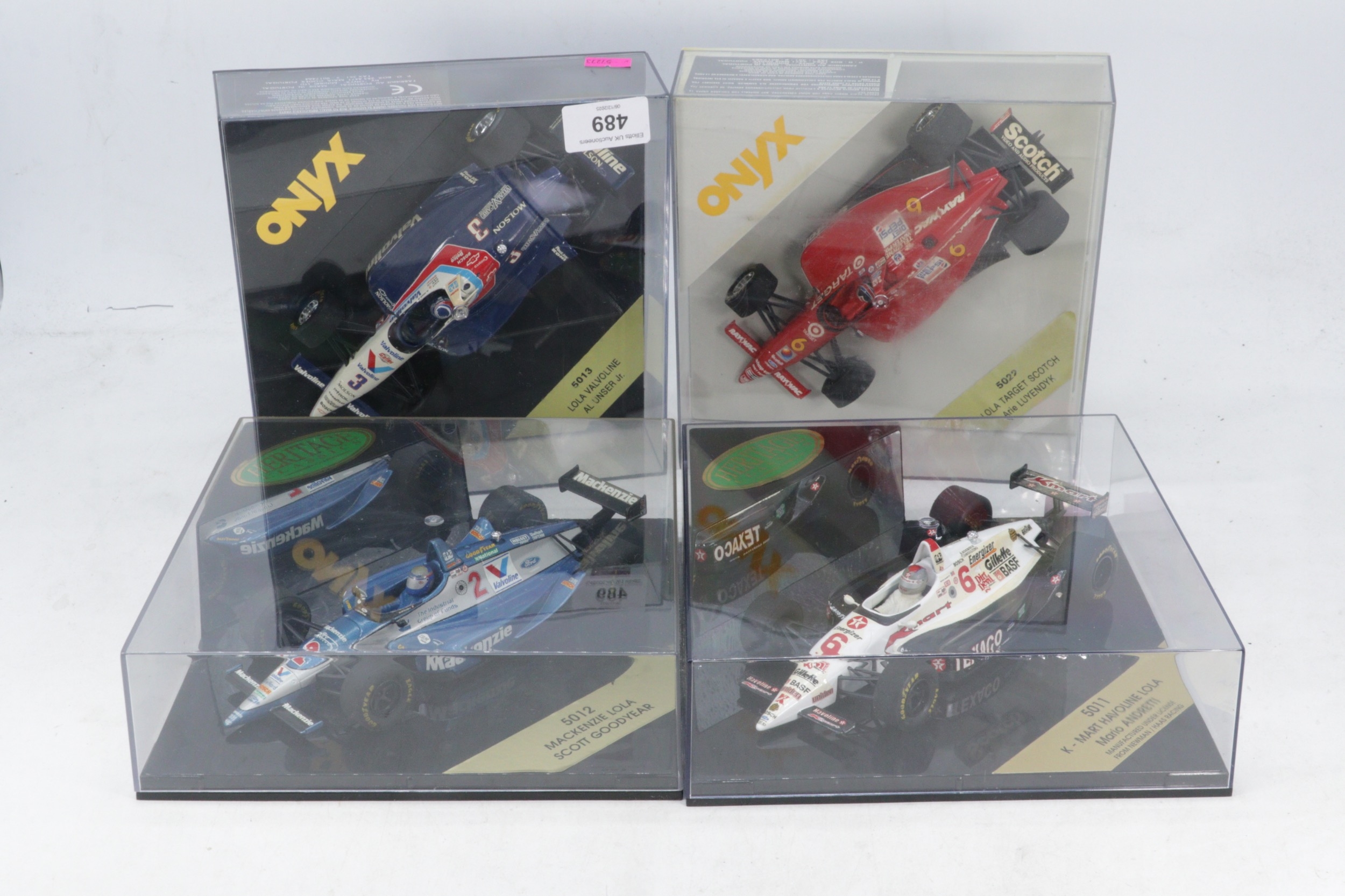 4 boxed onyx Indy cars 1:24 scale 5012 Mackenzie Lola, 5011 K-Mart Havoline Lanolin Lola Mario Andretti, 5013 Lol Valvoline Al Unser Jr, and 5022 Lolă Target Arie Luyendyk