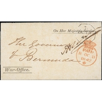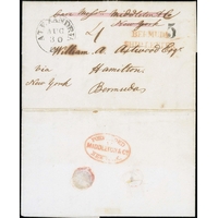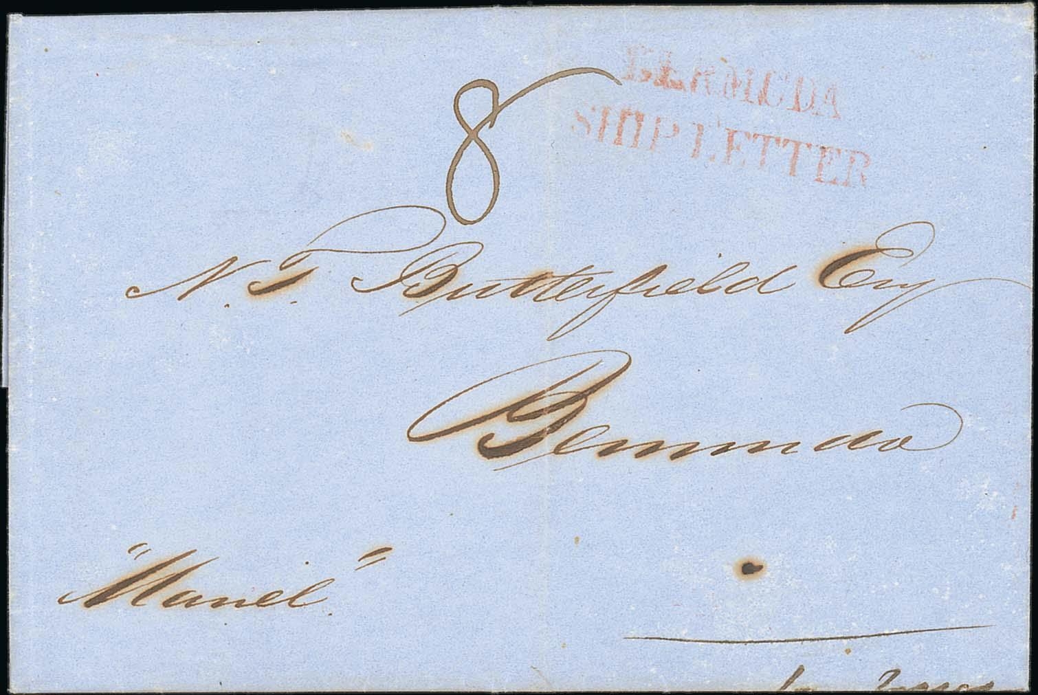 1849 (July 26) Entire letter from New York to N. Butterfield in Bermuda with red "BERMUDA / SHIP LETTER" of St. Georges, charged 8d double rate. The letter mentions the cholera outbreak in New York "now becoming formidable, reported today 150 cases with 52 deaths". Fine and scarce, less than 20 examples recorded. Photo on Page 12.