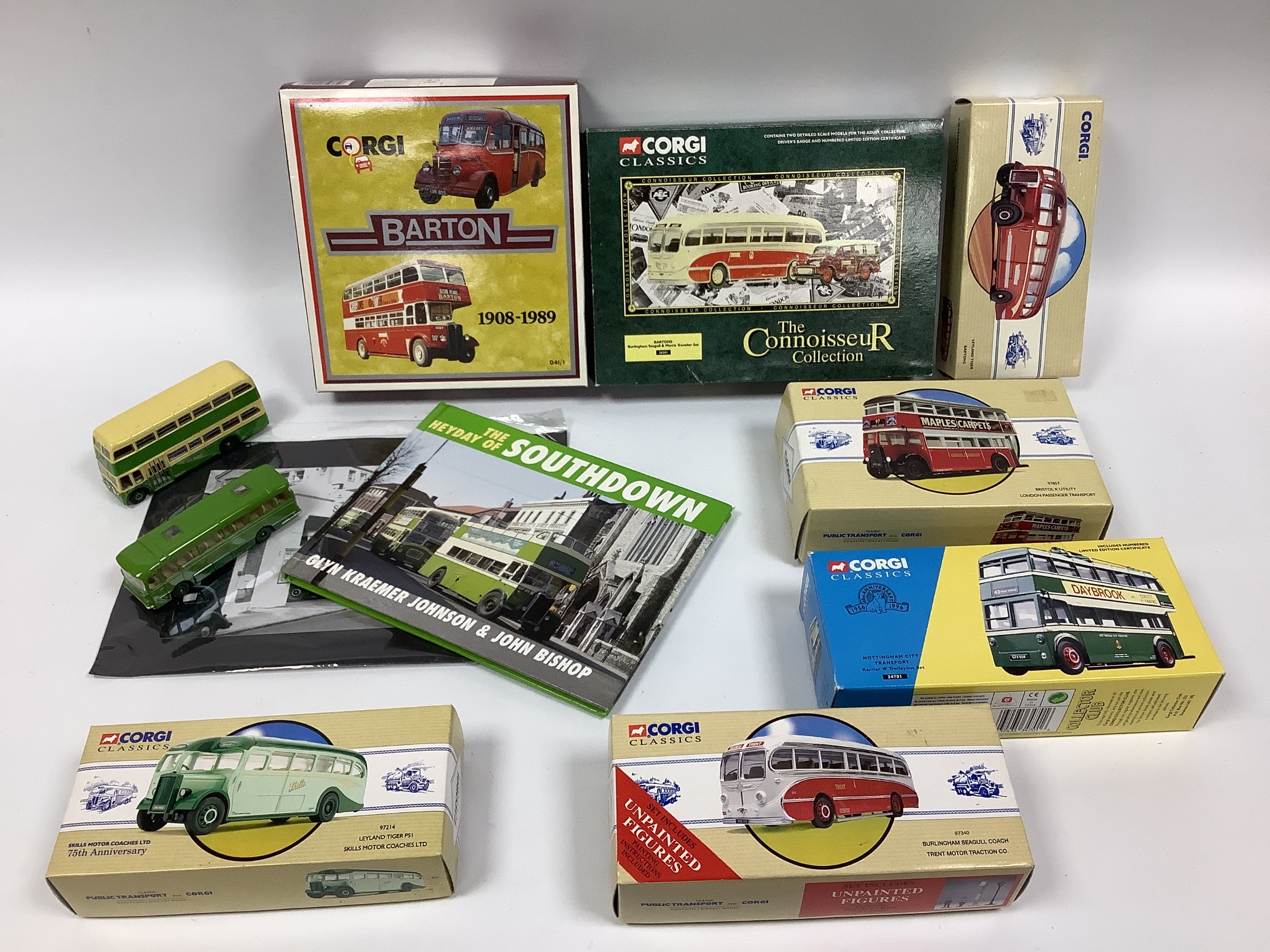 Ten Diecast Model Buses by Corgi, EFE to include Corgi #97857 Bristol K Utility London Passenger Transport, mostly boxed. Together with The Heyday of Southdown book. [832339] [881876].