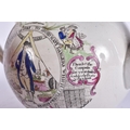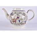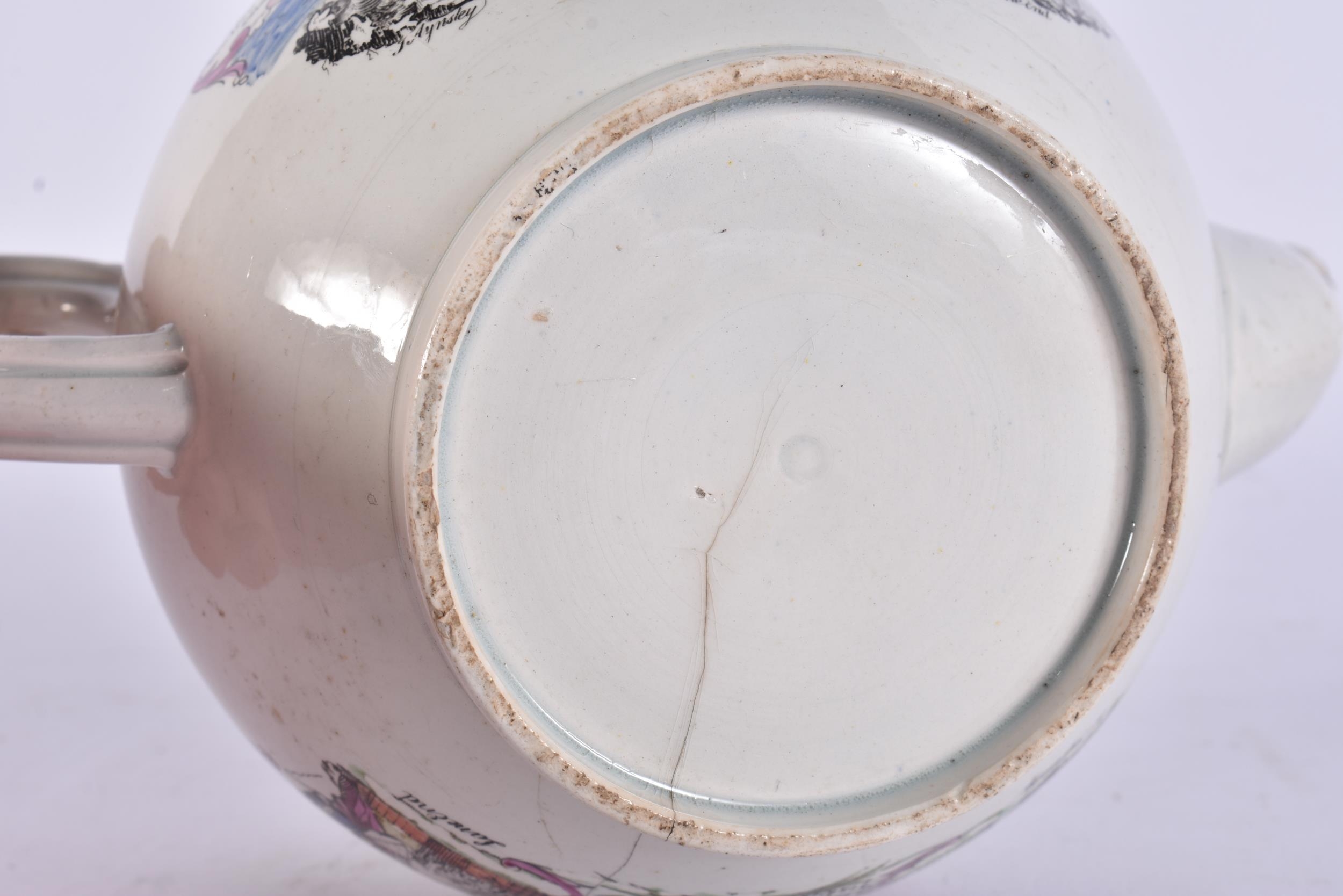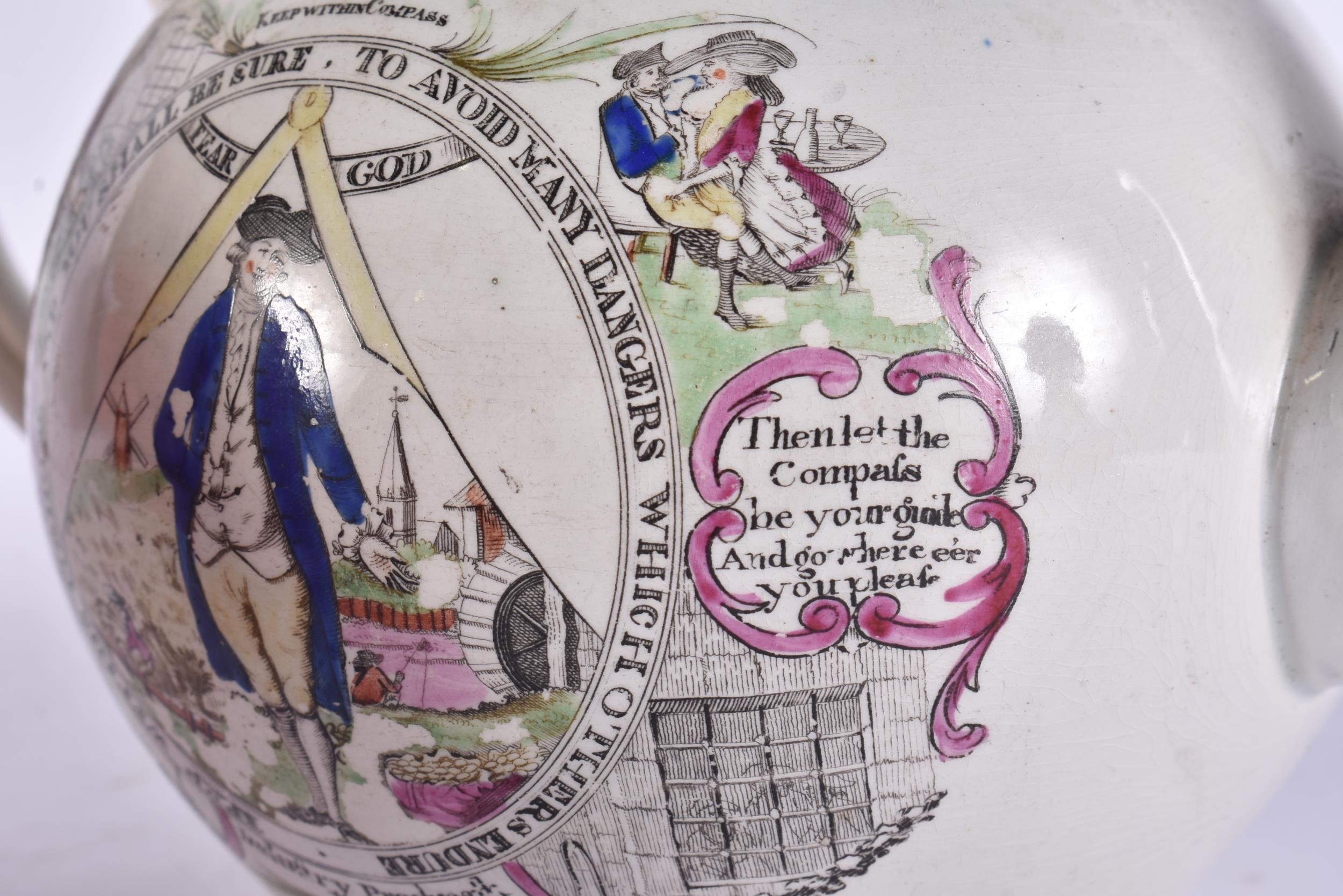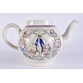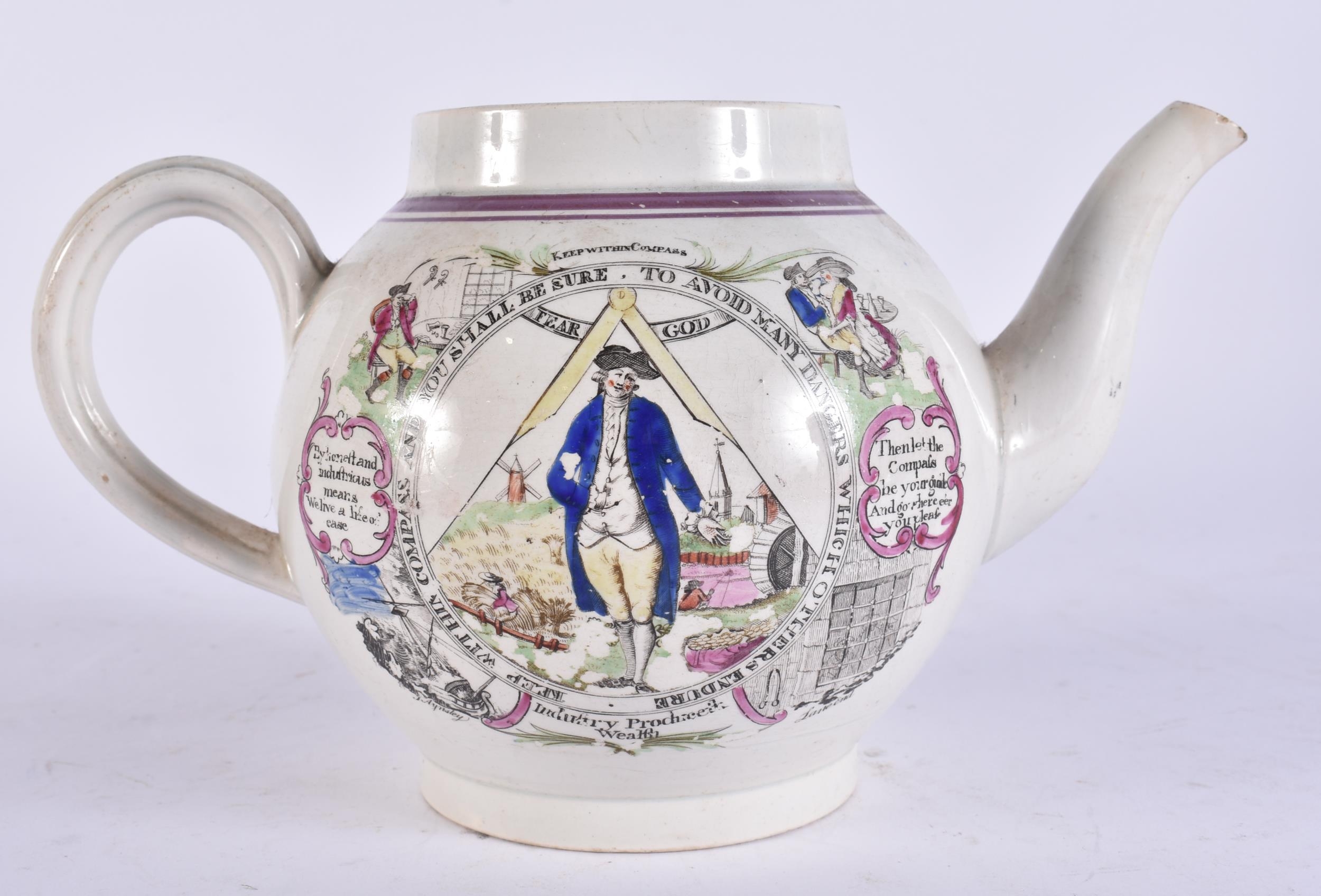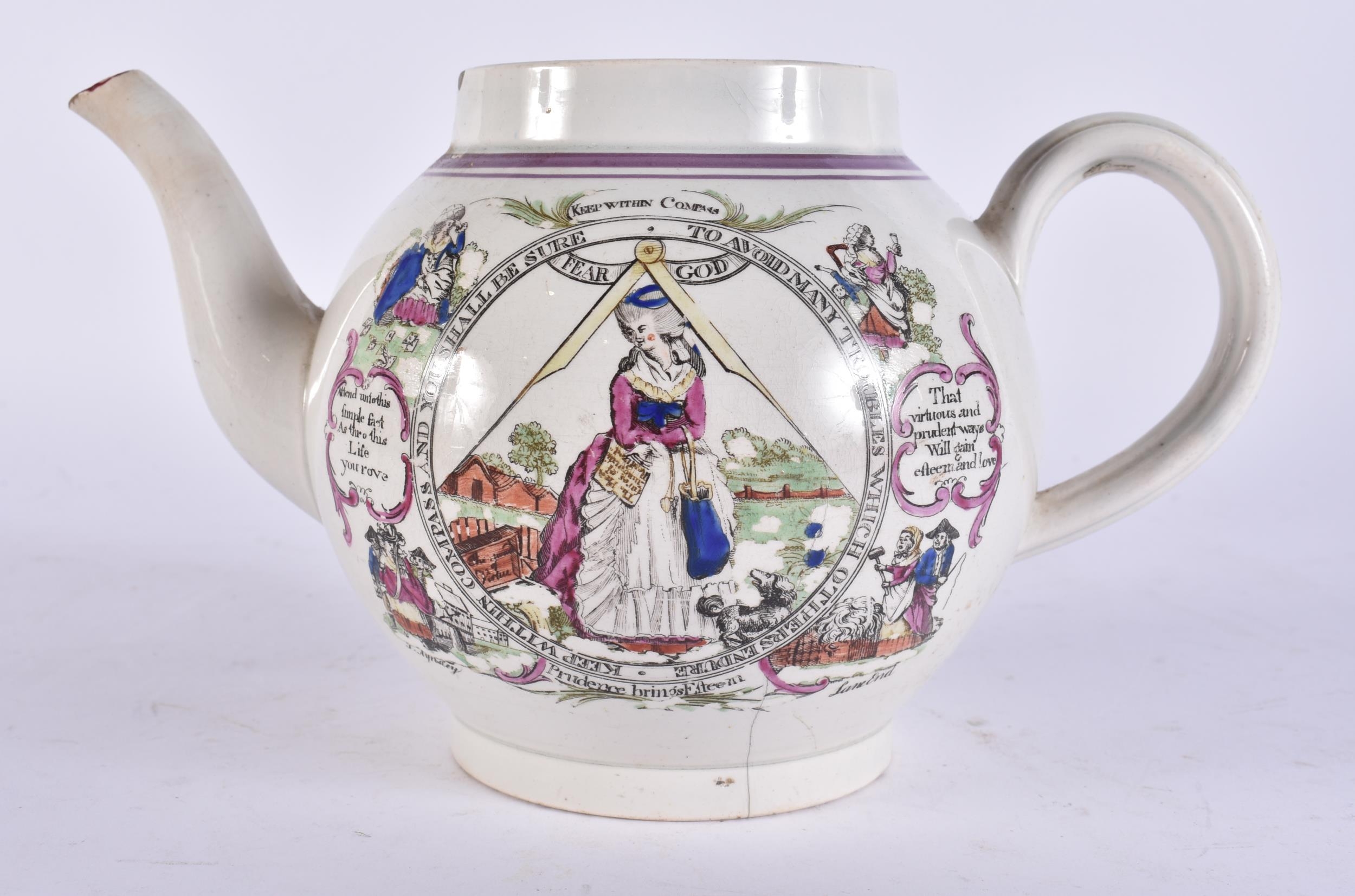 A RARE EARLY 19TH CENTURY ENGLISH MASONIC POTTERY TEAPOT decorated with various scenes. 19 cm wide.