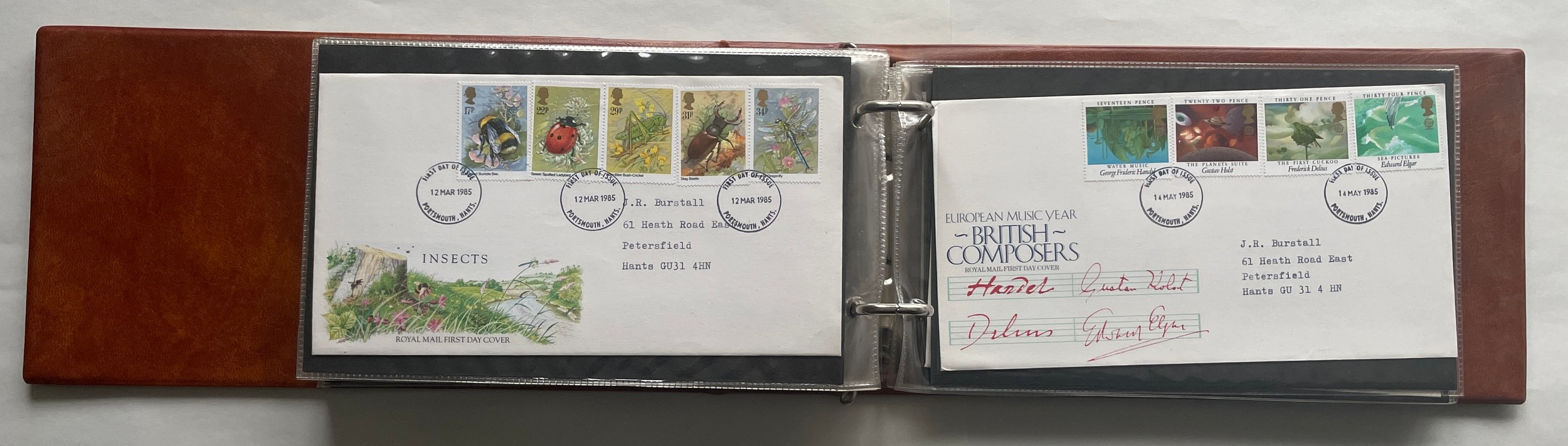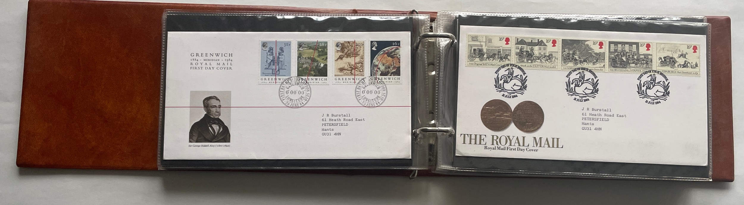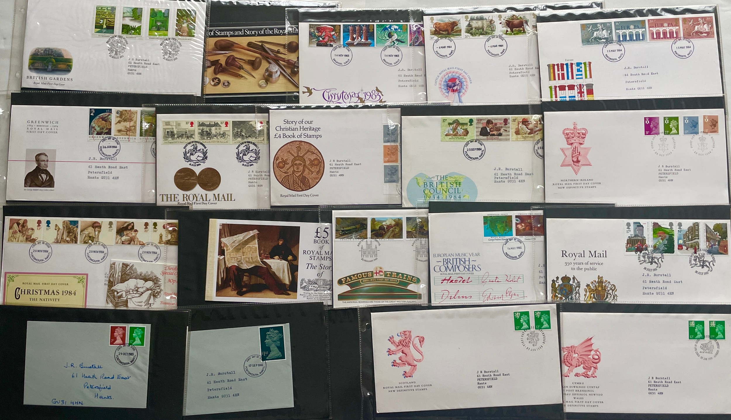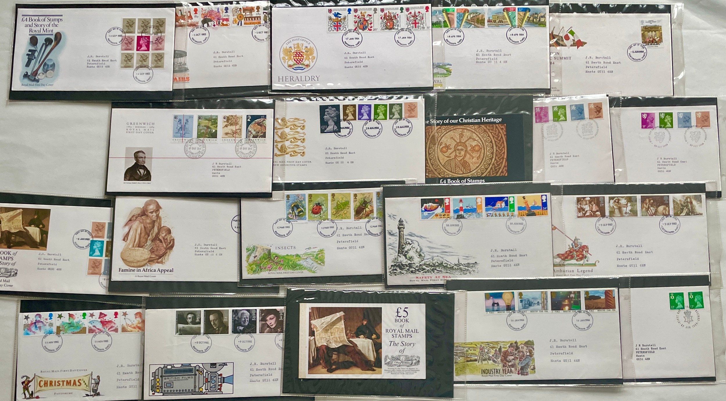 Stamps - Album of 35 addressed and franked first day covers from 1983 to 1986. Presented in plastic display cases in collector’s album with two Machin first day covers on handwritten envelopes and three unopened books of stamps - The Story of the Royal Mail, Story of Christian Heritage and The story of the Times.