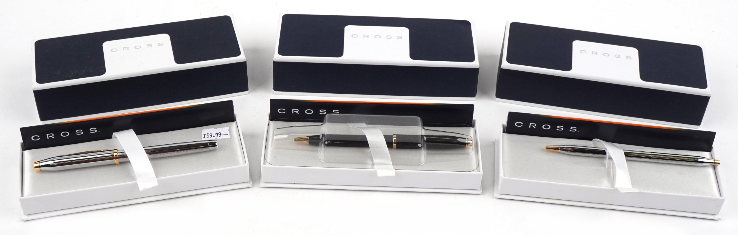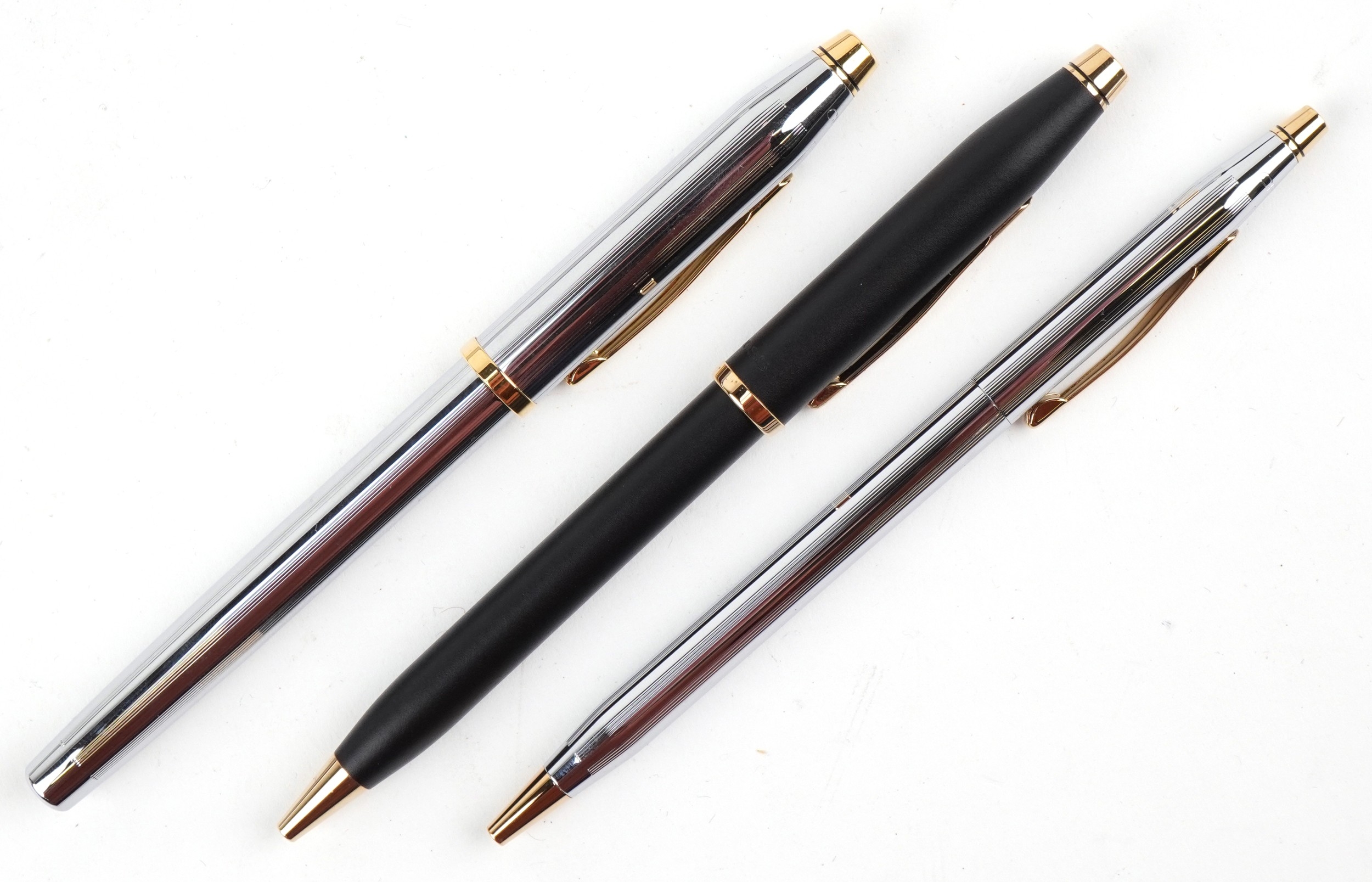 Three as new Cross fountain pens and ballpoint pens with boxes.