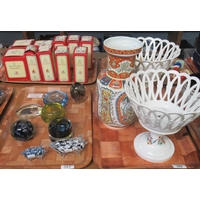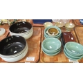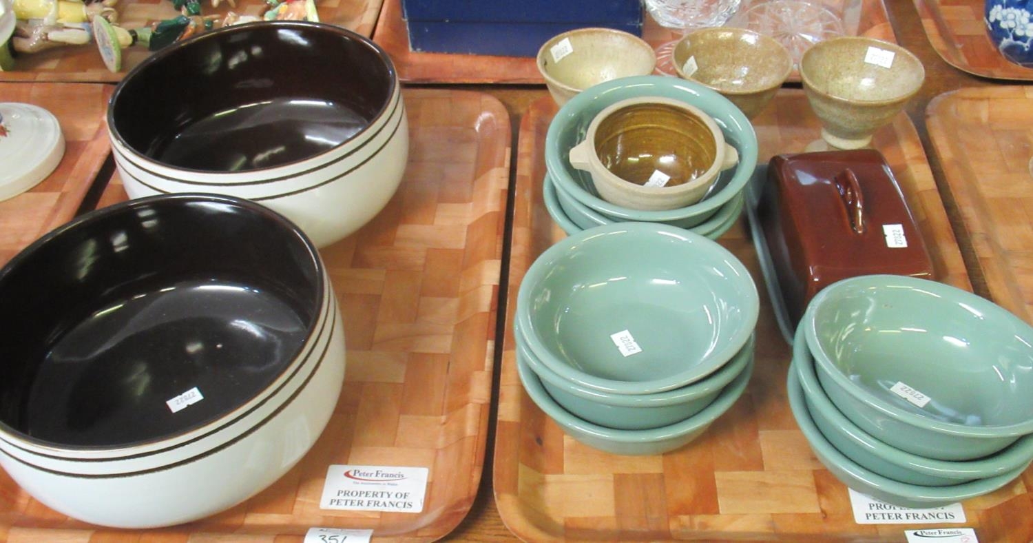Two trays of pottery to include: nine sage coloured, unmarked pottery bowls, three short stemmed brown goblets with markings to base, brown bowl, Denby butter dish and lid, and two large brown and white bowls marked Denby to base. (2)