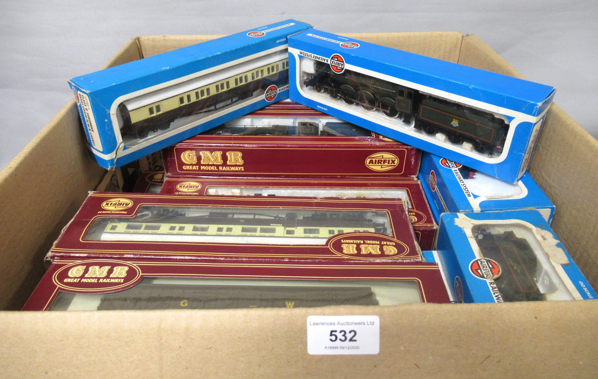 Box containing a quantity of various Airfix 00 gauge rolling stock and carriages containing a large quantity of engines and tenders and various tank engines, all in original boxes