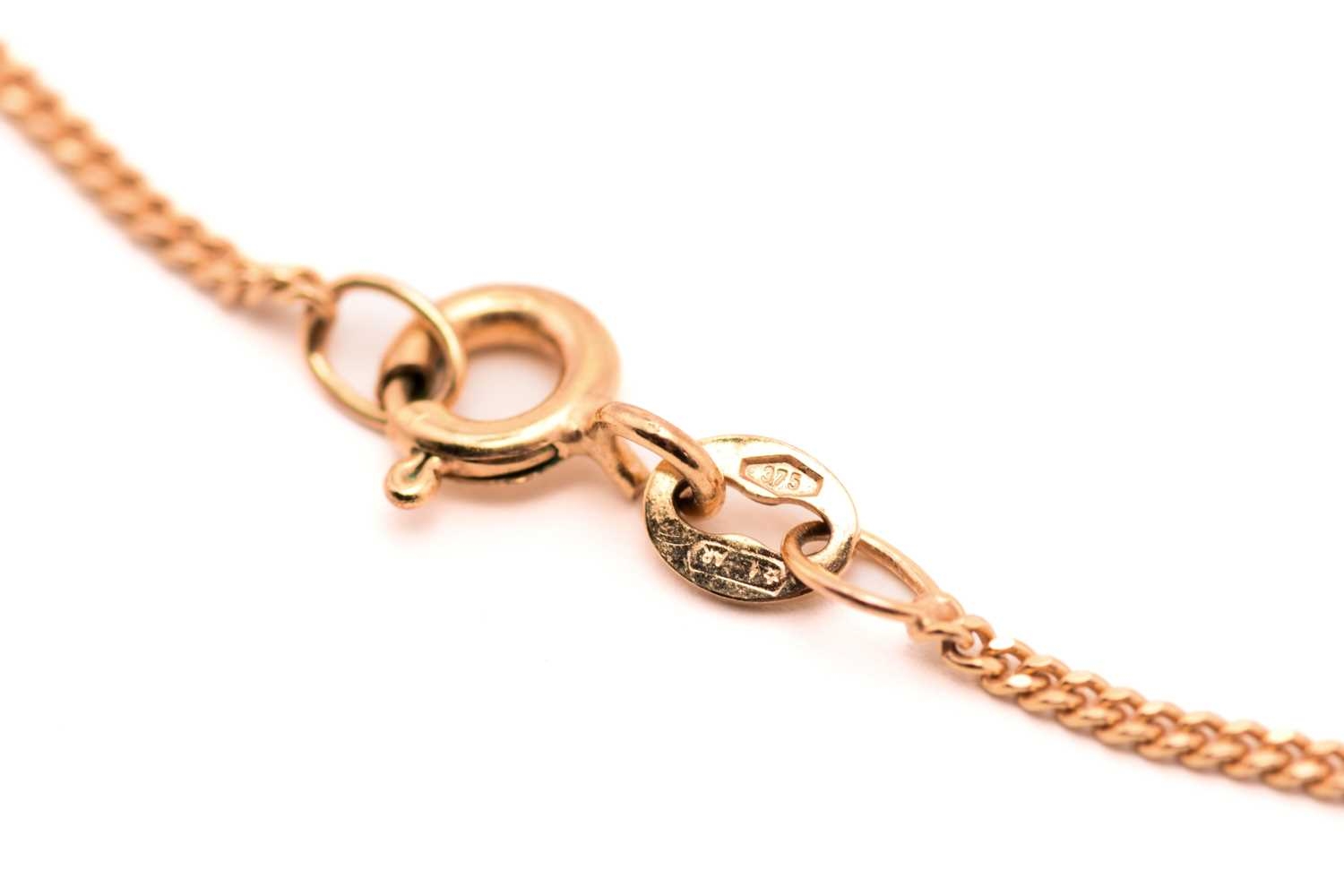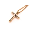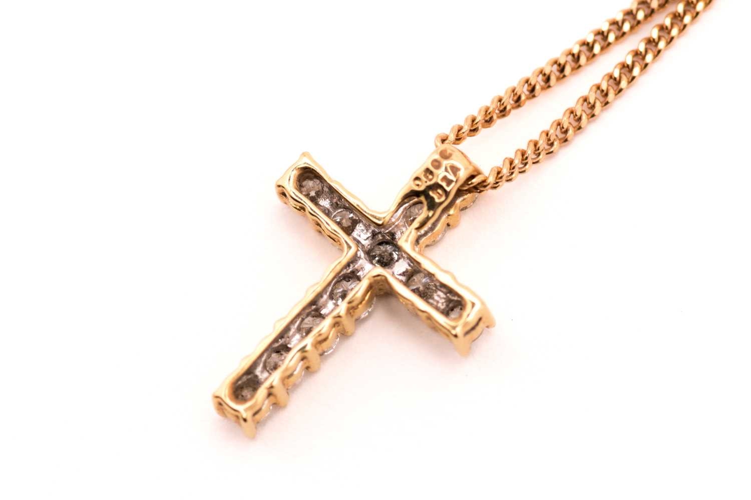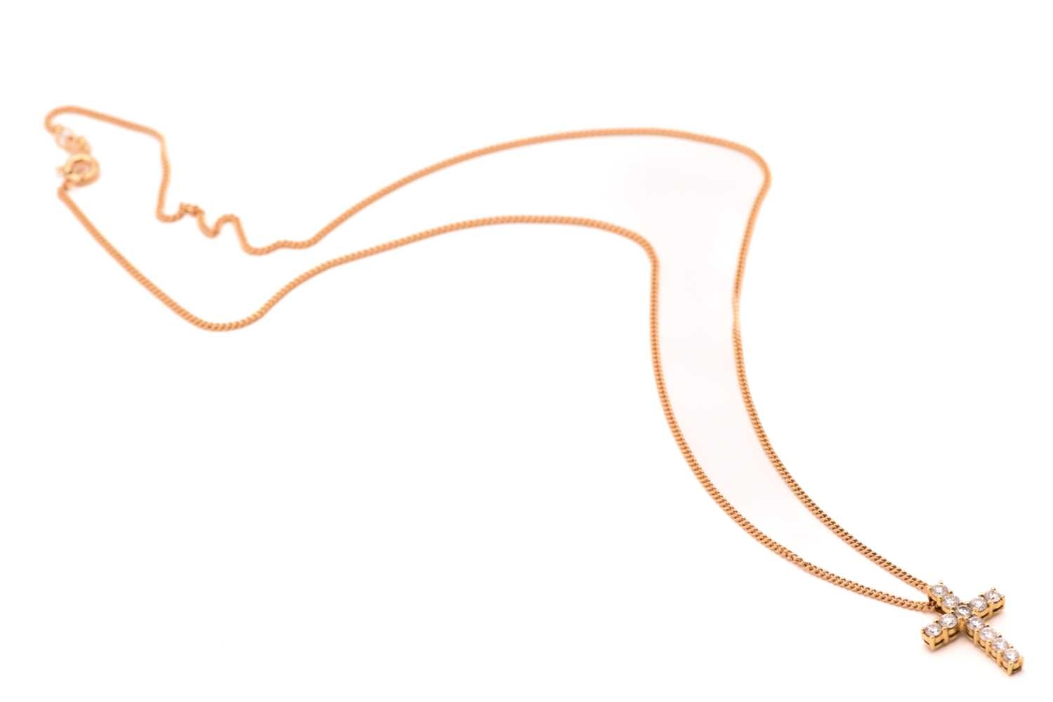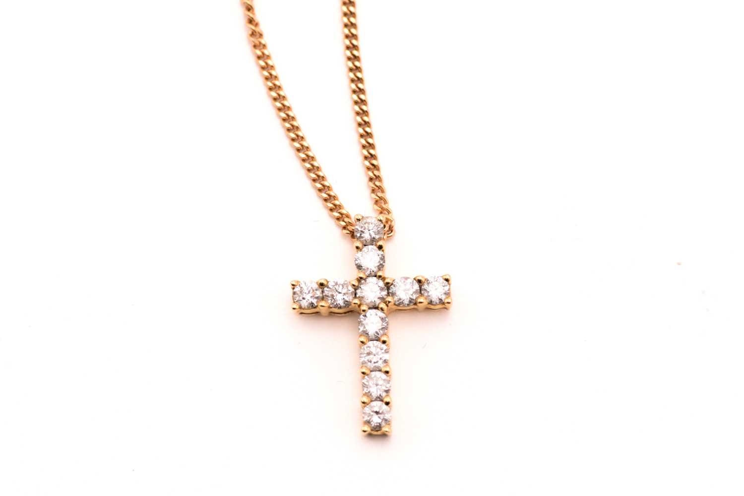 An 18ct gold and diamond-set cross pendant on chain, consisting of eleven brilliant diamonds with an estimated total weight of 0.50ct, claw set on 18ct gold mount, on a 9ct fine curb link chain, the pendant was Birmingham hallmarked '750' with maker's mark 'SG', overall measures 1.6 x 1.1 cm, chain 46.0 cm long, total weight of item 3.3 grams.