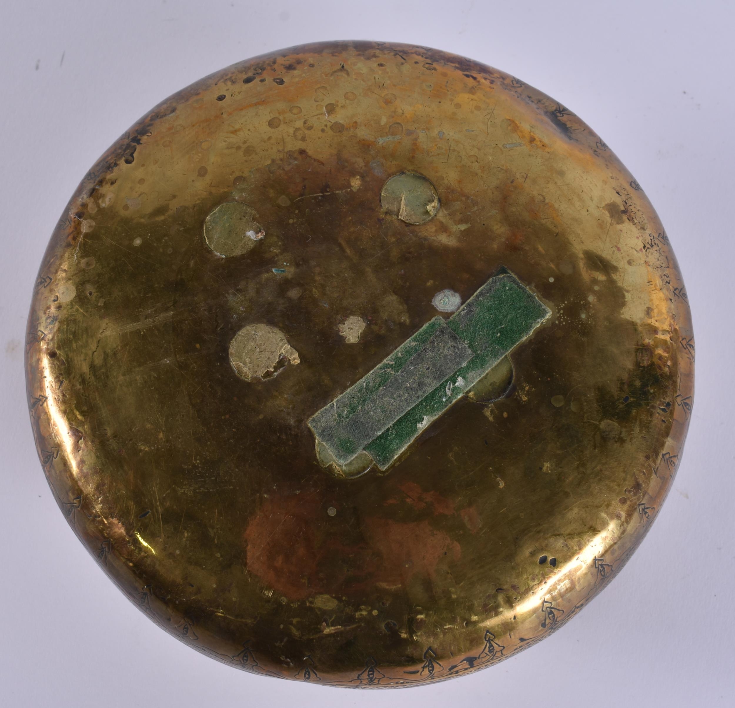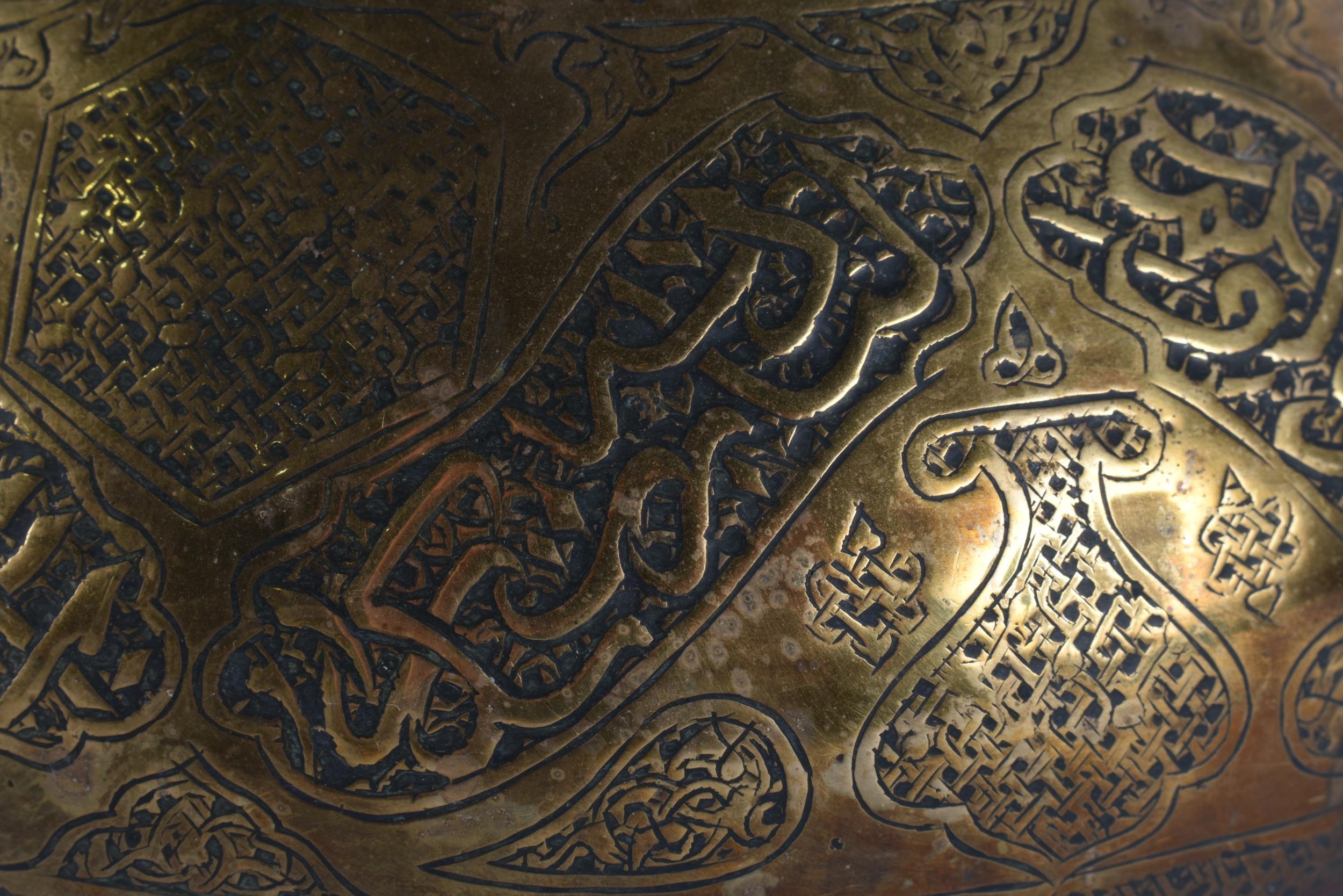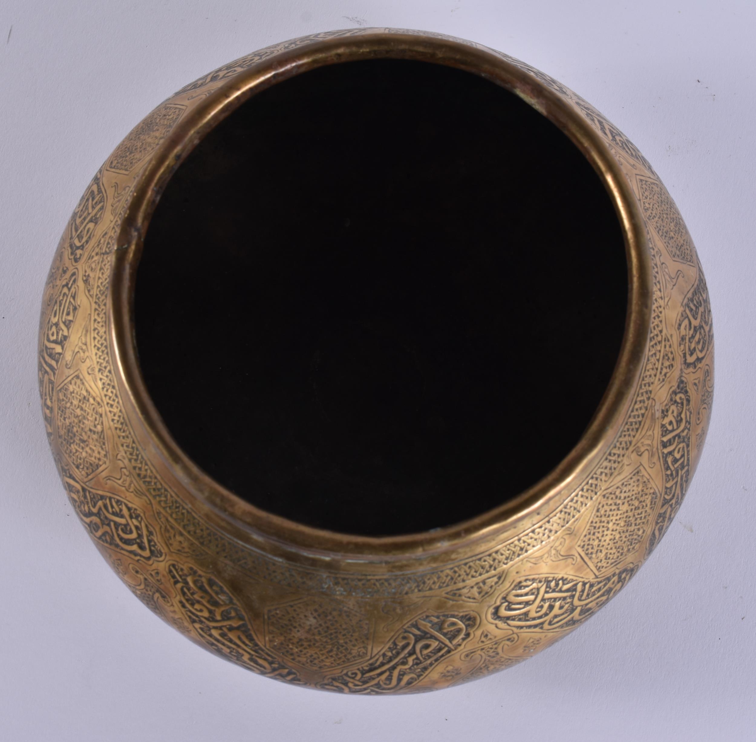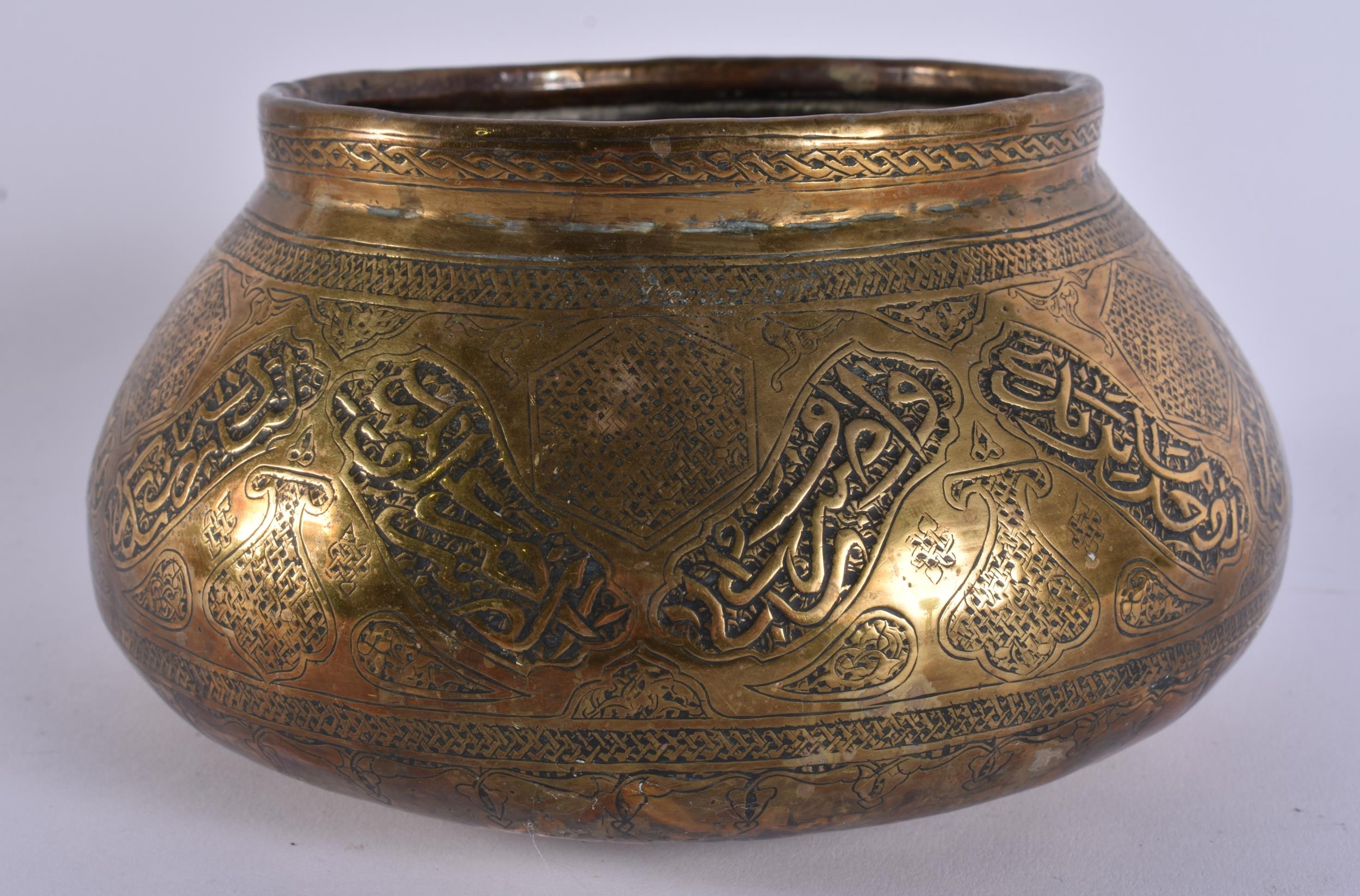 A 19TH CENTURY ISLAMIC MIDDLE EASTERN BRASS CENSER decorated with Kufic script. 18 cm wide.