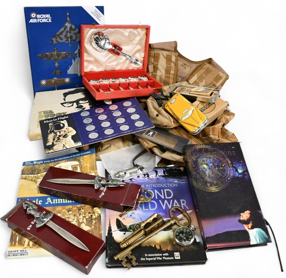 Selection of Collectables to include History of the RAF 50p collection, Shell Man in Flight Coin, Brass Key, Bottle Opener, Nutcracker, Whistle, The Buddy Holly Story Tape box set, Cat Stevens CD Box set, 2007 Military Vest Tactical Desert DPM (box)