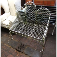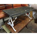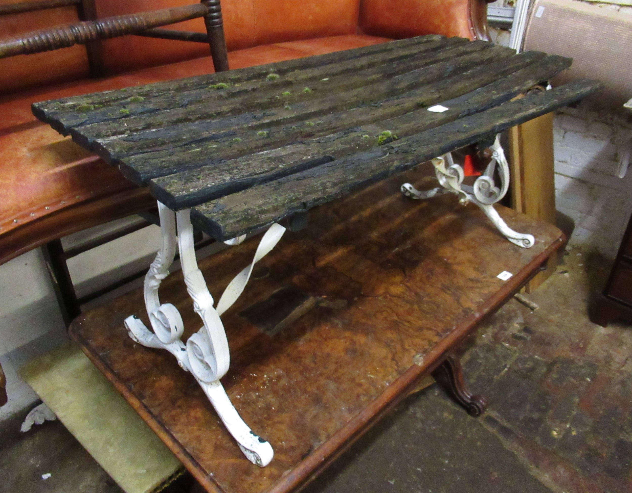 Pair of white painted and cast iron slatted garden benches, 125cm wide, together with a similar rectangular coffee table, 110cm wide
