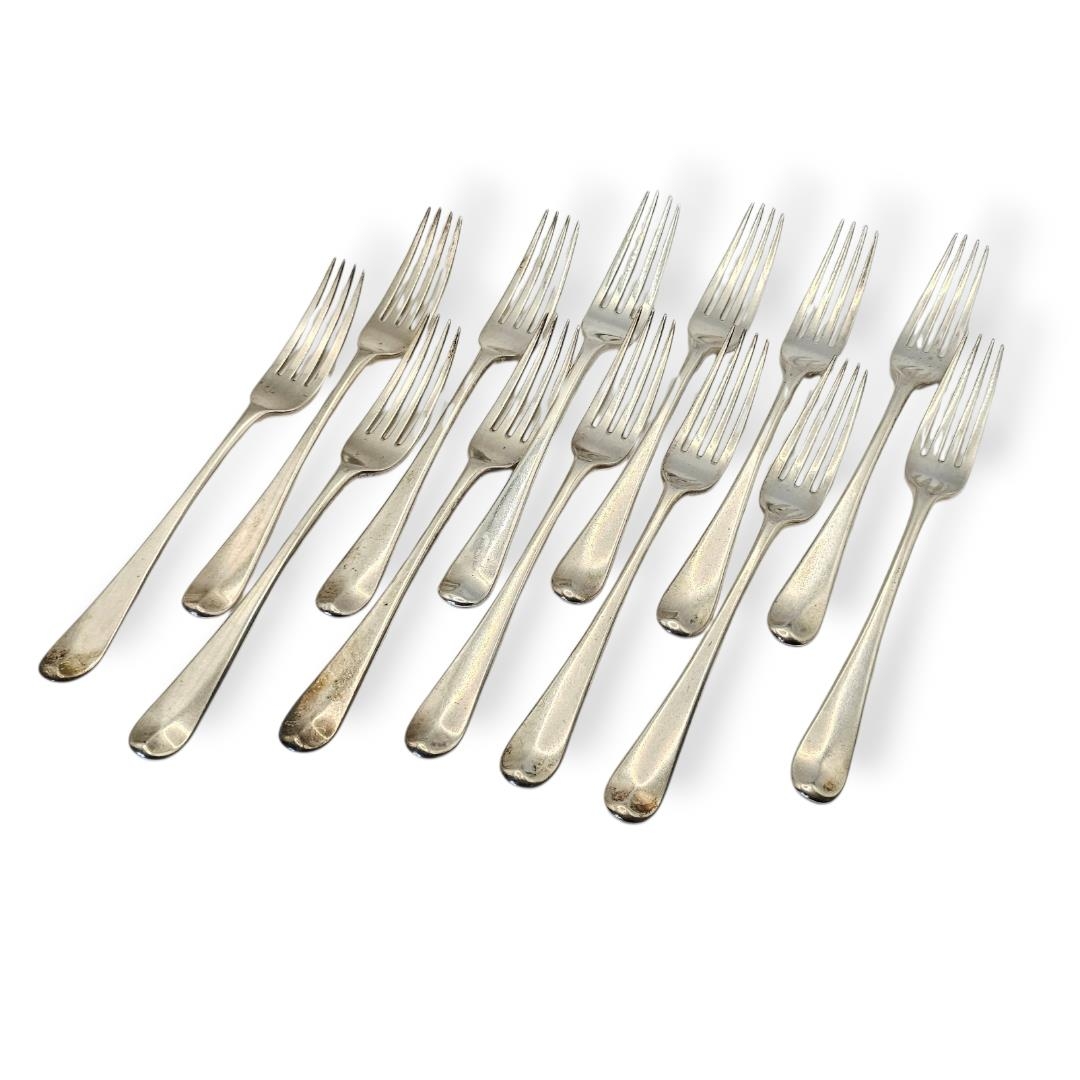 WILLIAM ELEY I & WILLIAM FEARN, A SET OF THIRTEEN LATE 18TH CENTURY GEORGE III SILVER DINNER FORKS