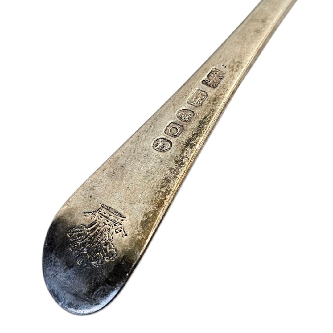 Hallmarked London, 1798, Old English pattern with engraved family crest showing ostrich feathers plume above a ducal coronet to reverse terminal.