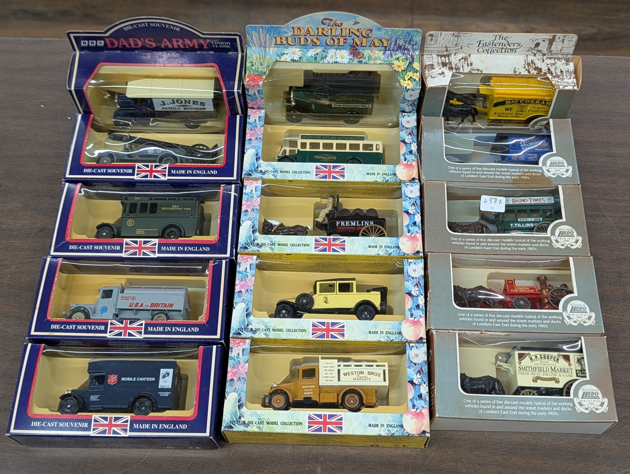A Collection of Fifteen Lledo Model Vehicles from the Dad's Army, The Darling Buds of May, and Eastenders Street Market Series