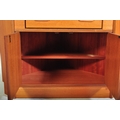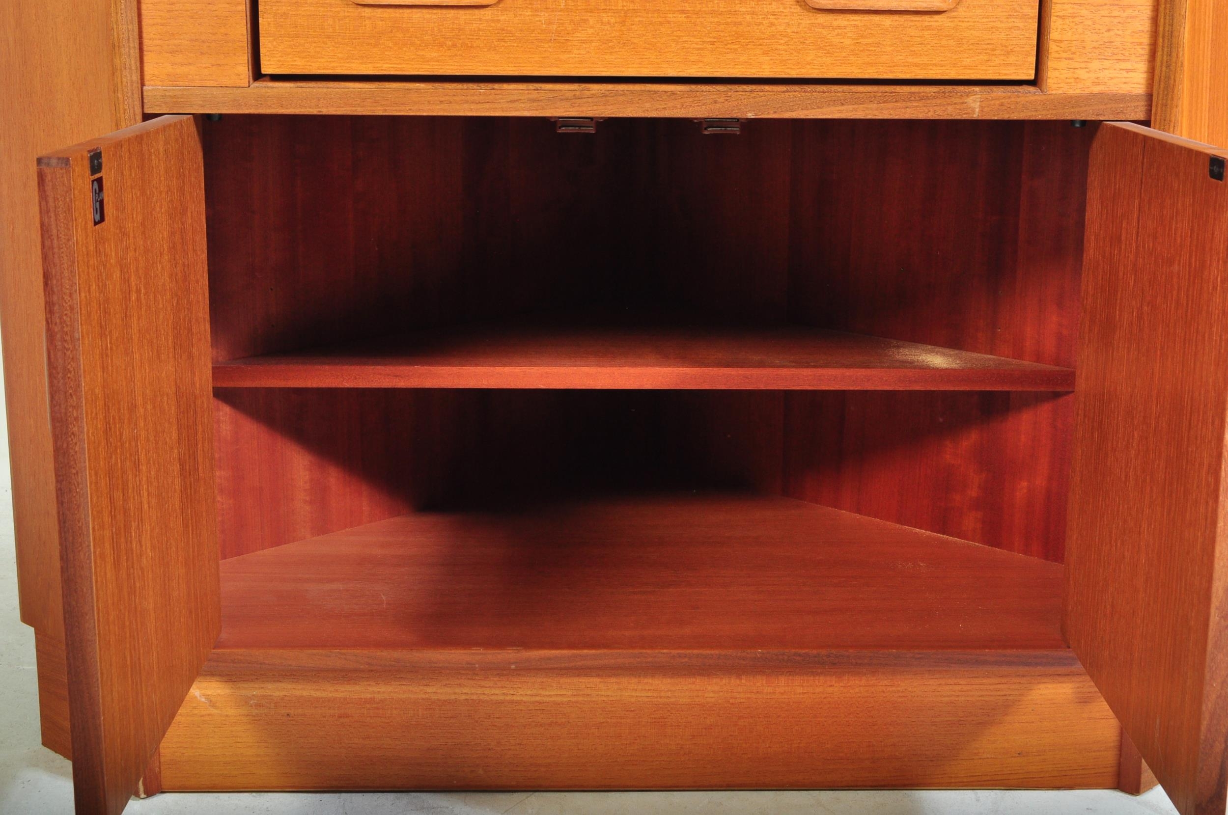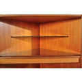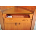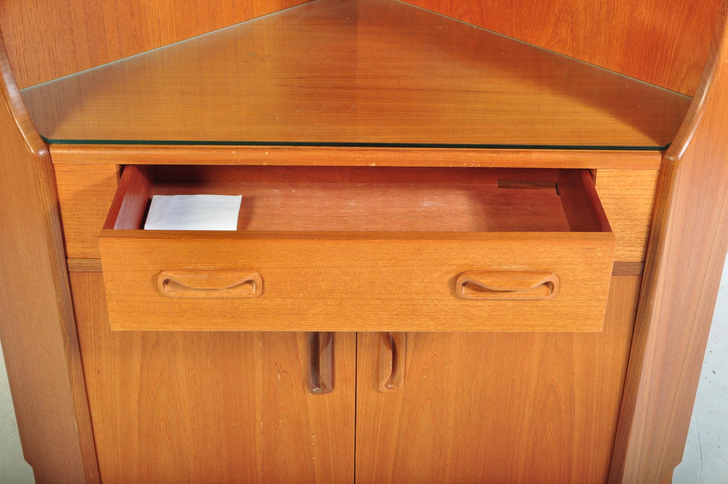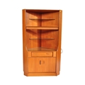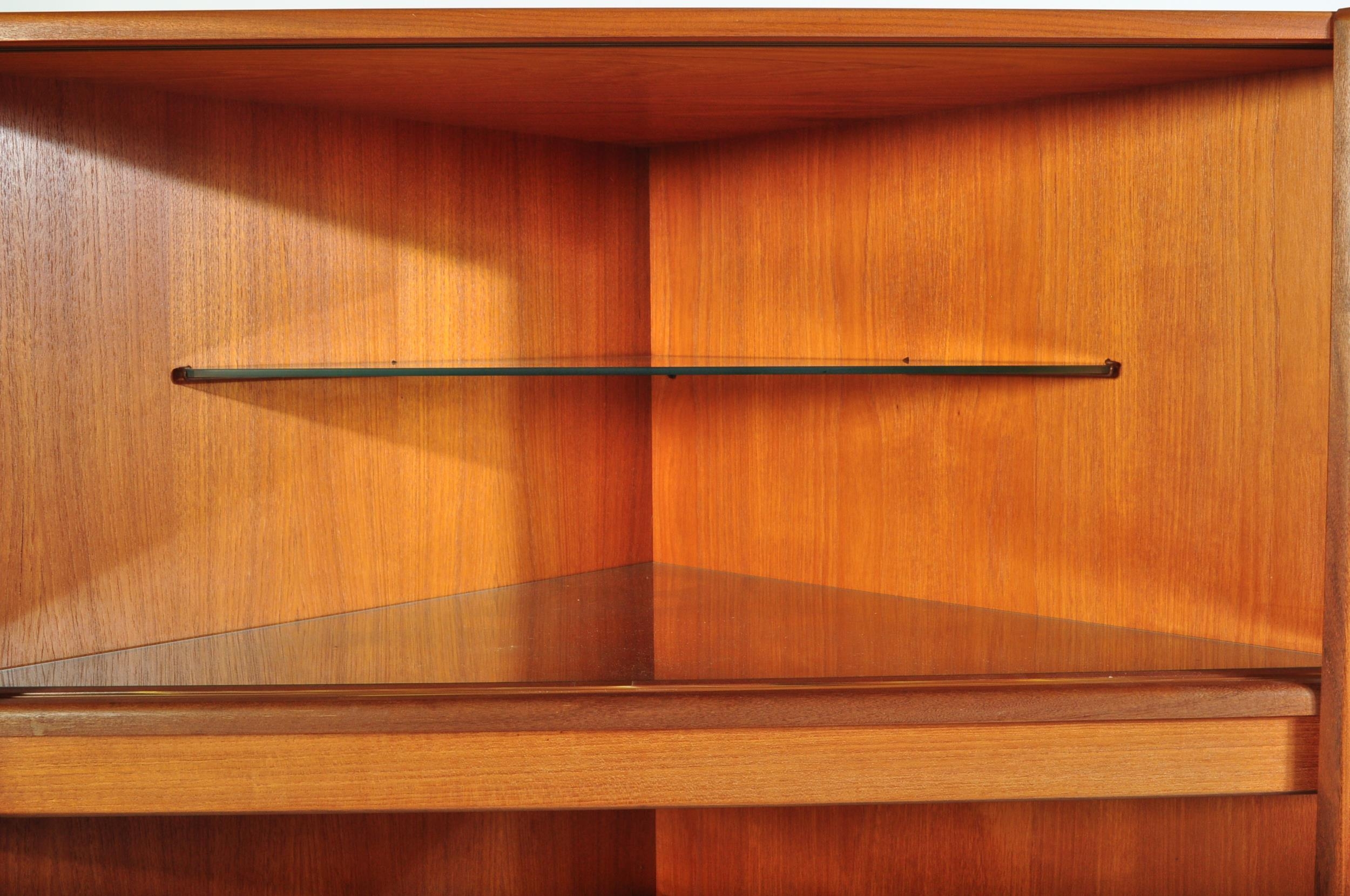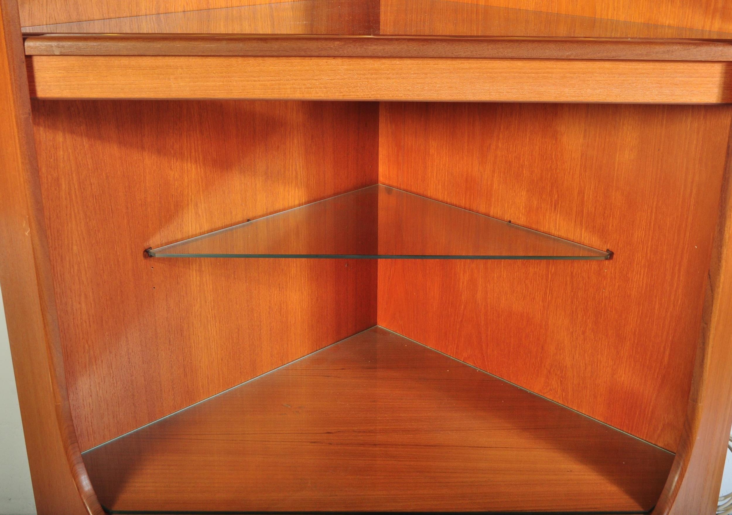 G Plan - Fresco - A good retro vintage 20th Century teak wood corner cabinet / display unit having a sliding glazed section over open shelf space below. Single drawer over a double door cupboard concealing a shelved interior. Measures 171cm x 101cm x 57cm.