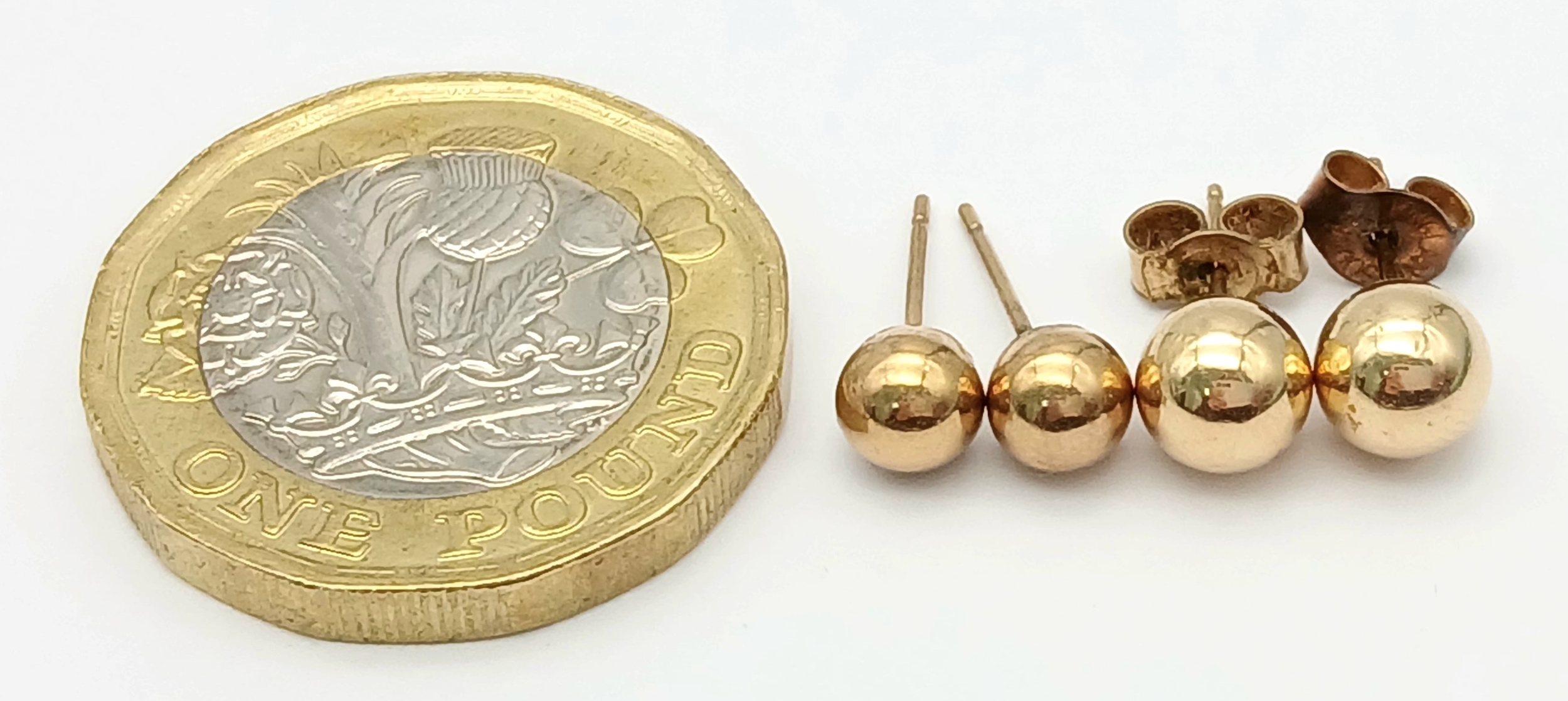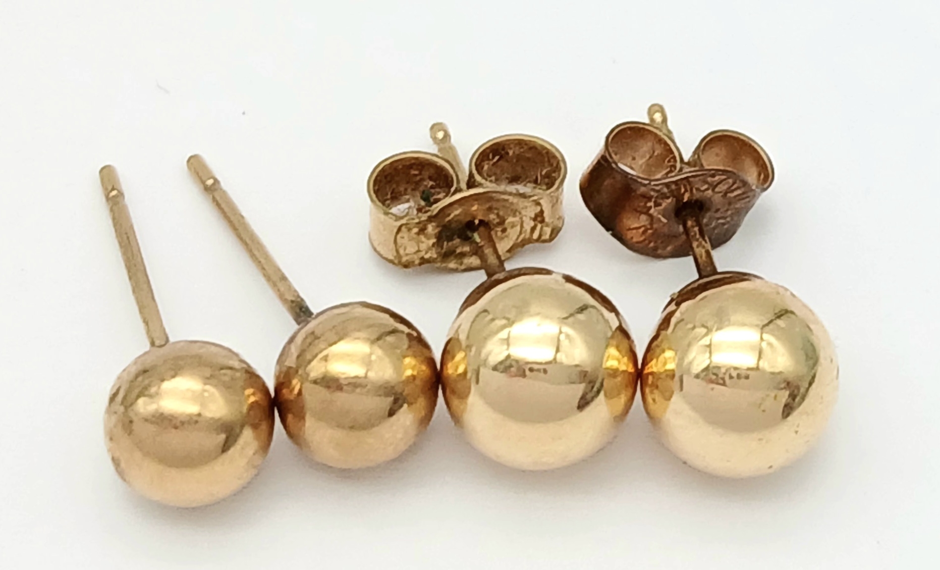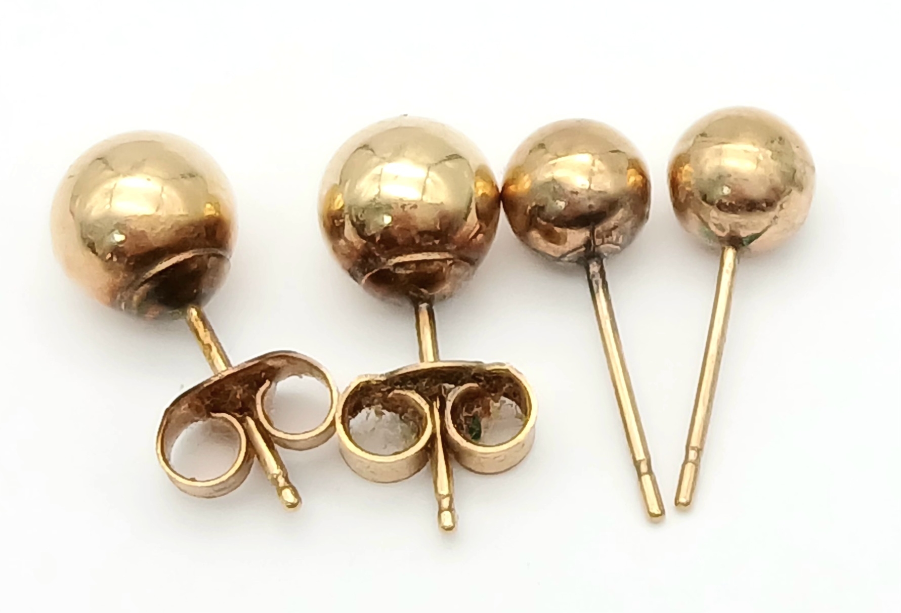 Two 9K Gold Pairs of Ball Stud Earrings - One pair missing backs. 0.75g.