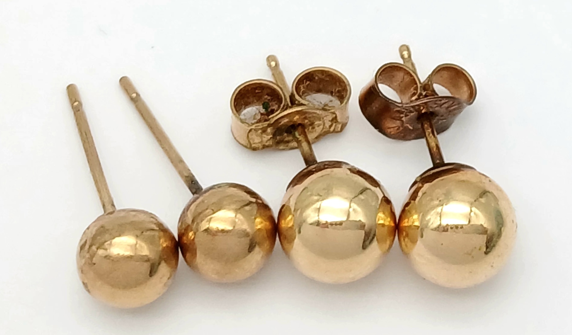 Two 9K Gold Pairs of Ball Stud Earrings - One pair missing b...