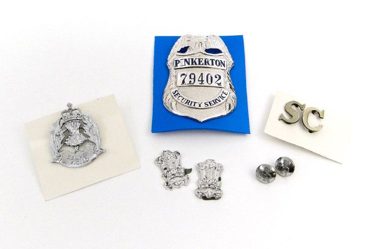 American Pinkerton Security Service badge and a small selection of other cap badges