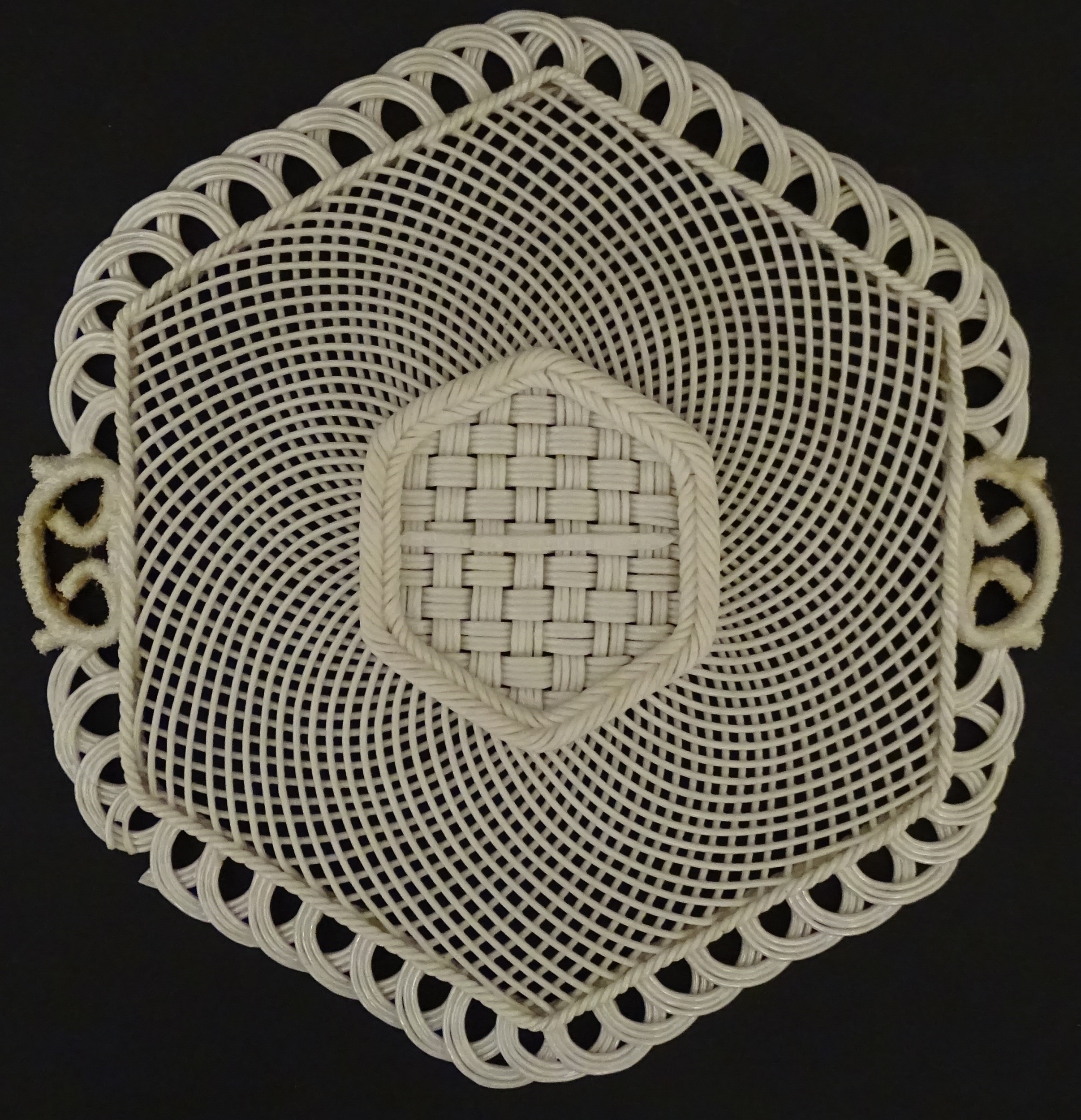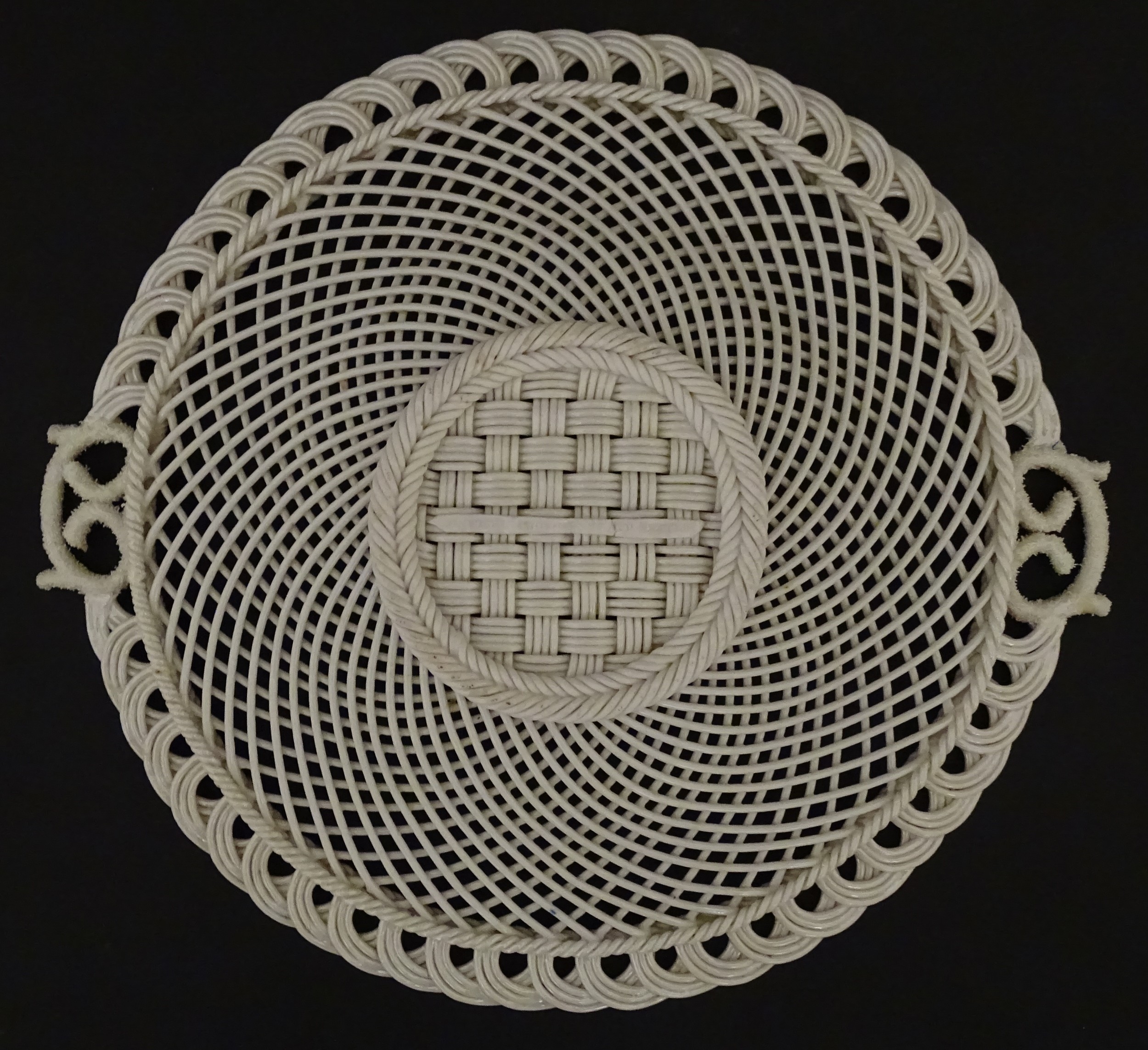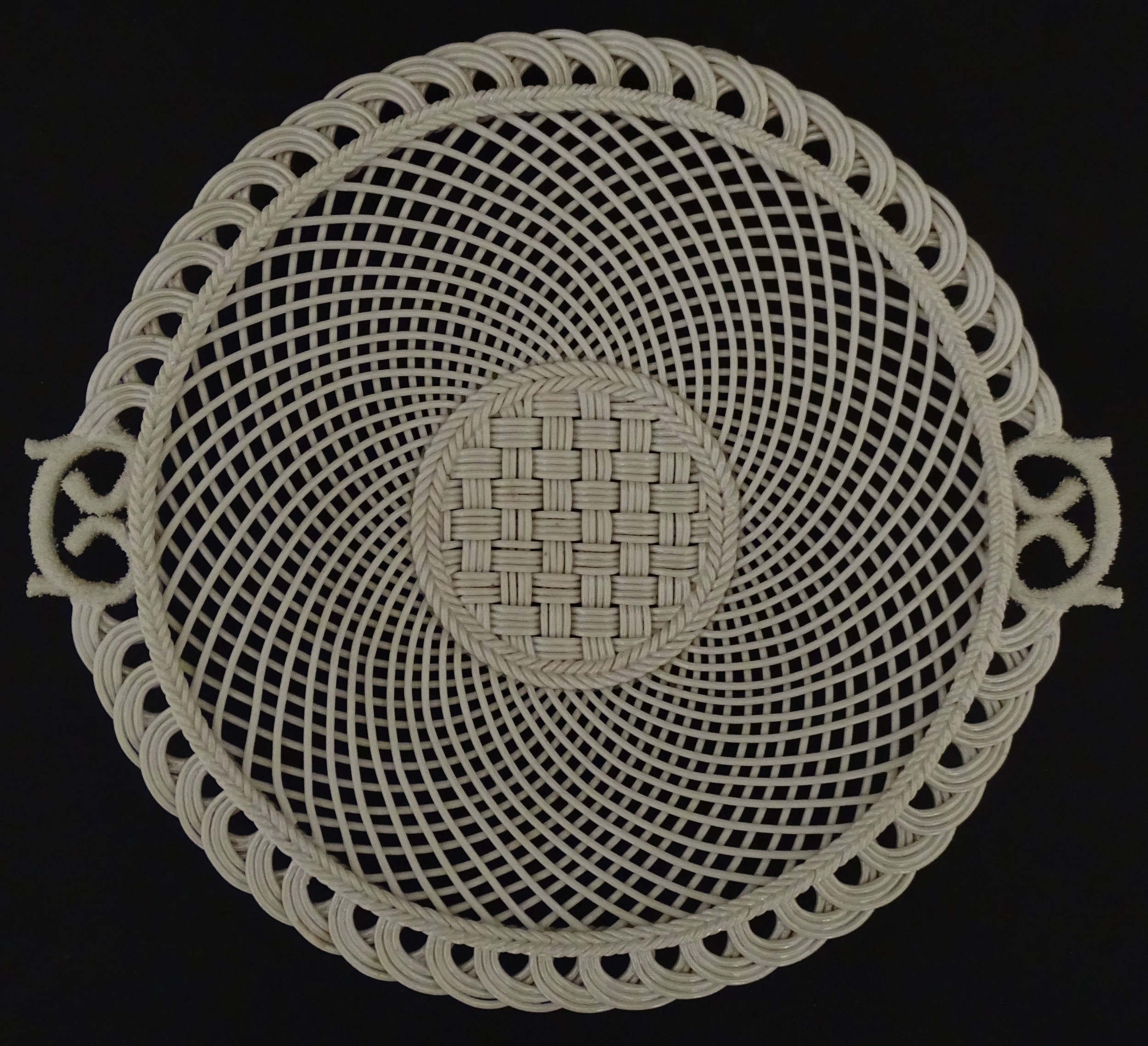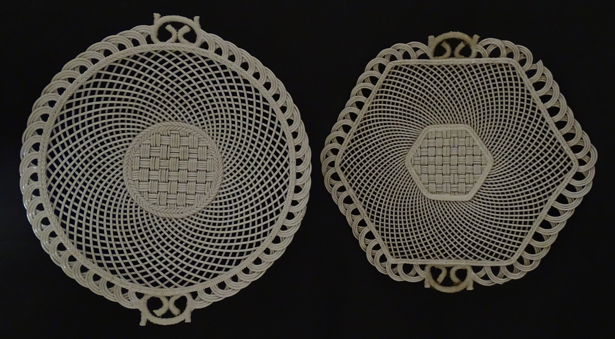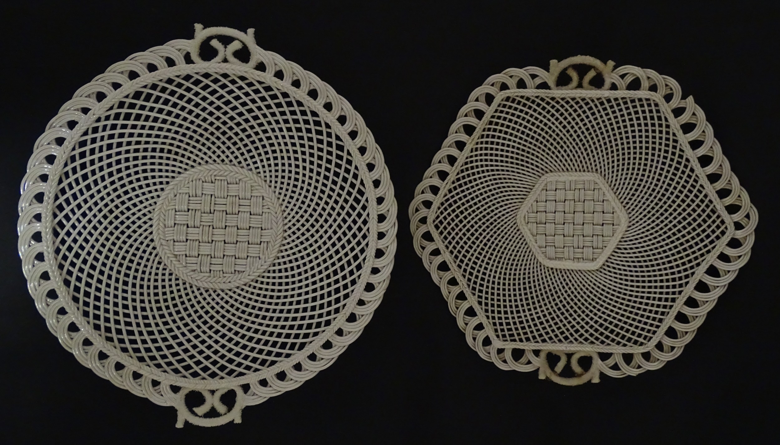 Two Belleek four strand basket weave cake plates. Impressed marks under. Largest approx. 11 1/2" wide (2)