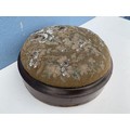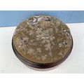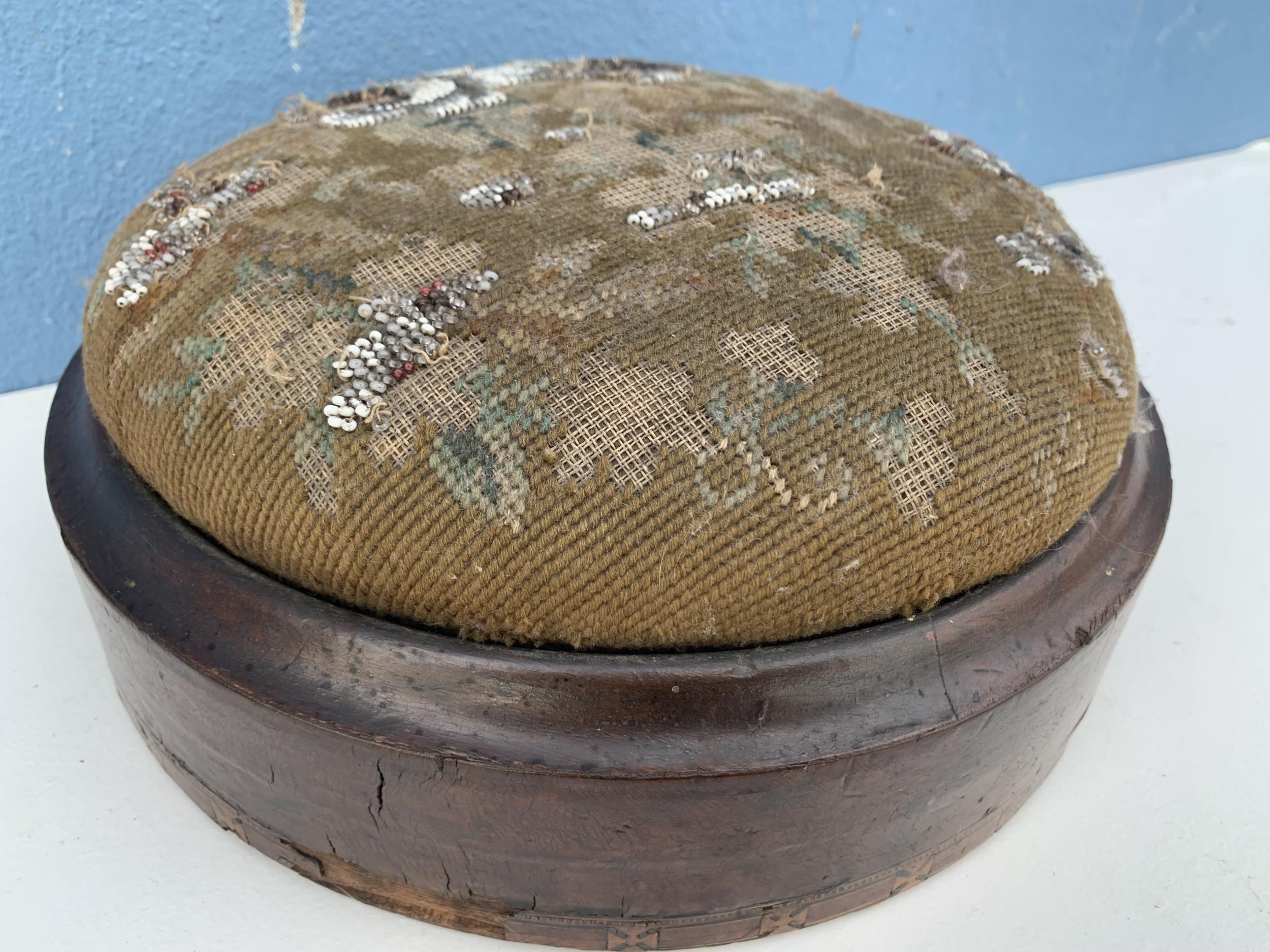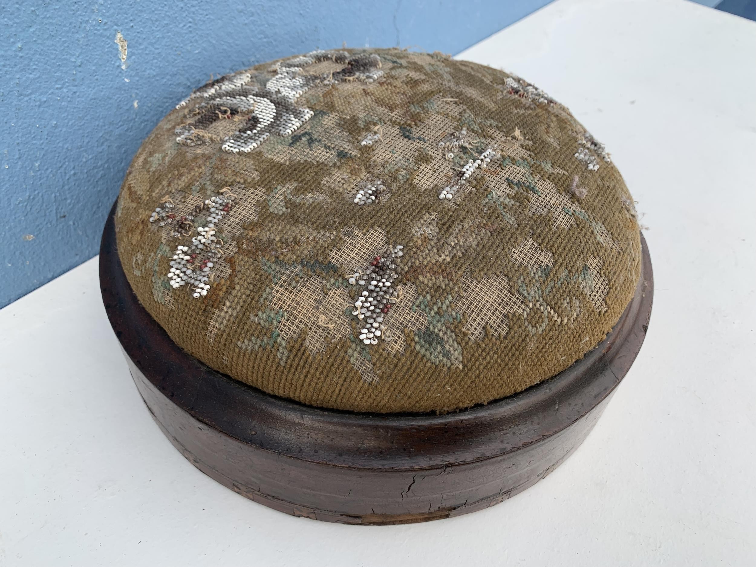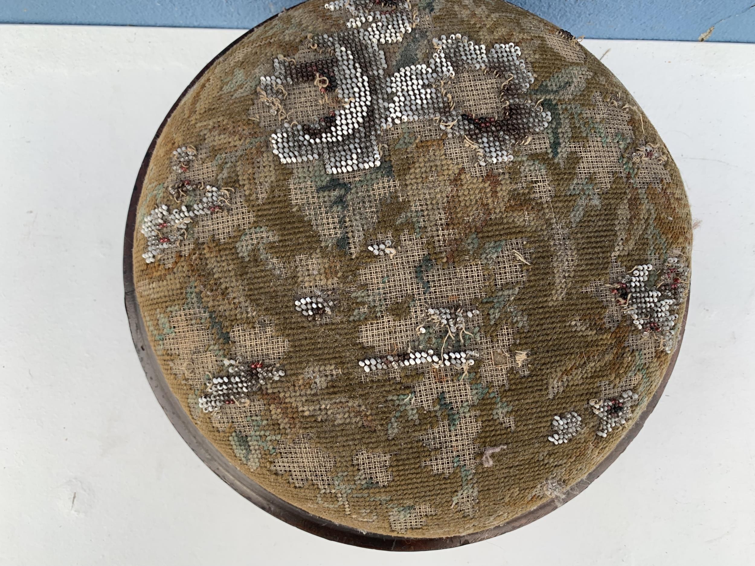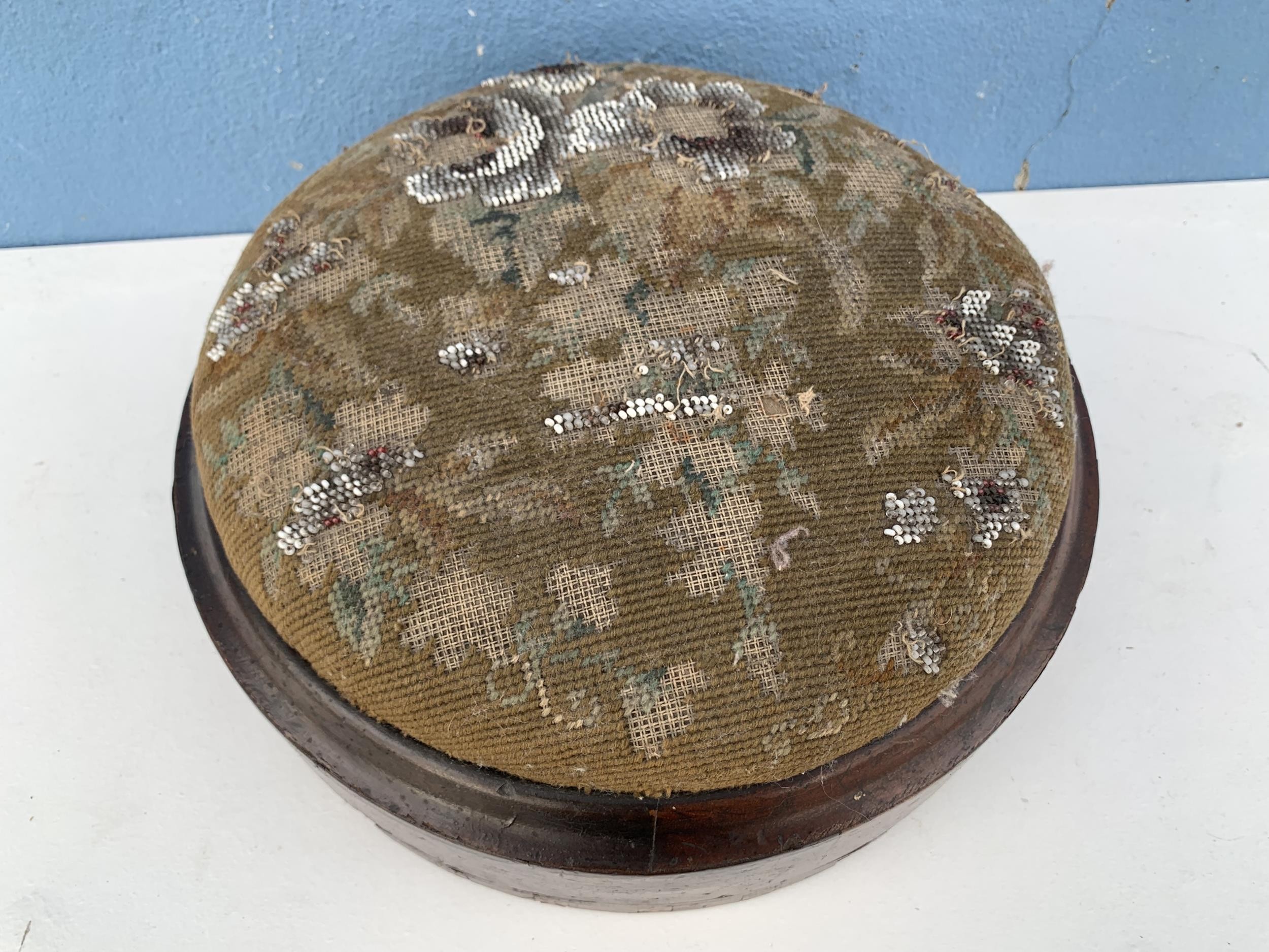 A VICTORIAN TAPESTRY FOOTSTOOL A HIEGHT OF 4" AND DIA OF 11"