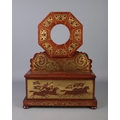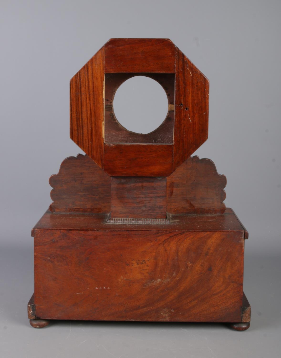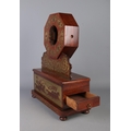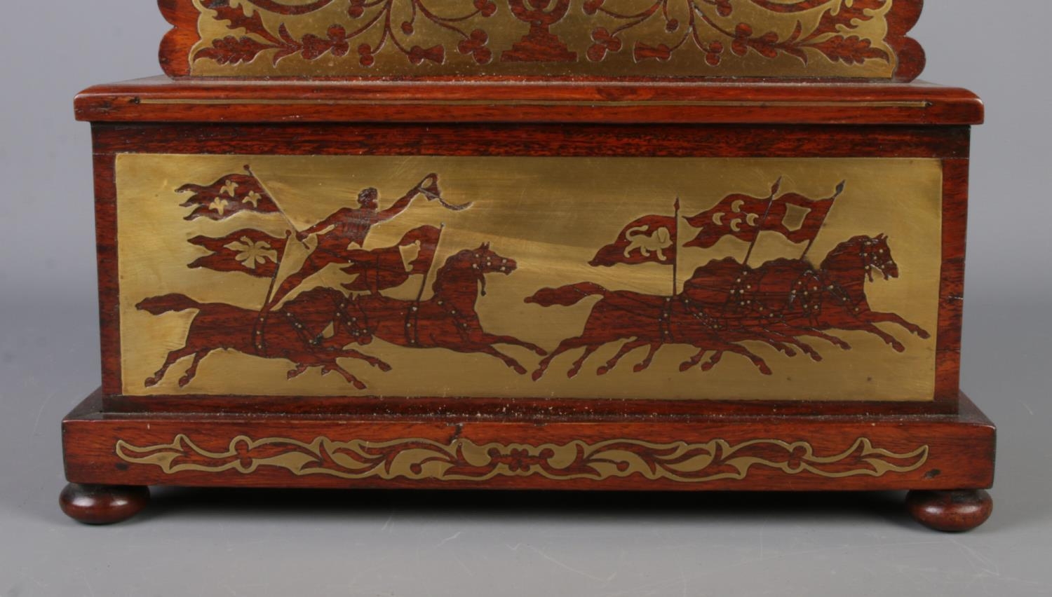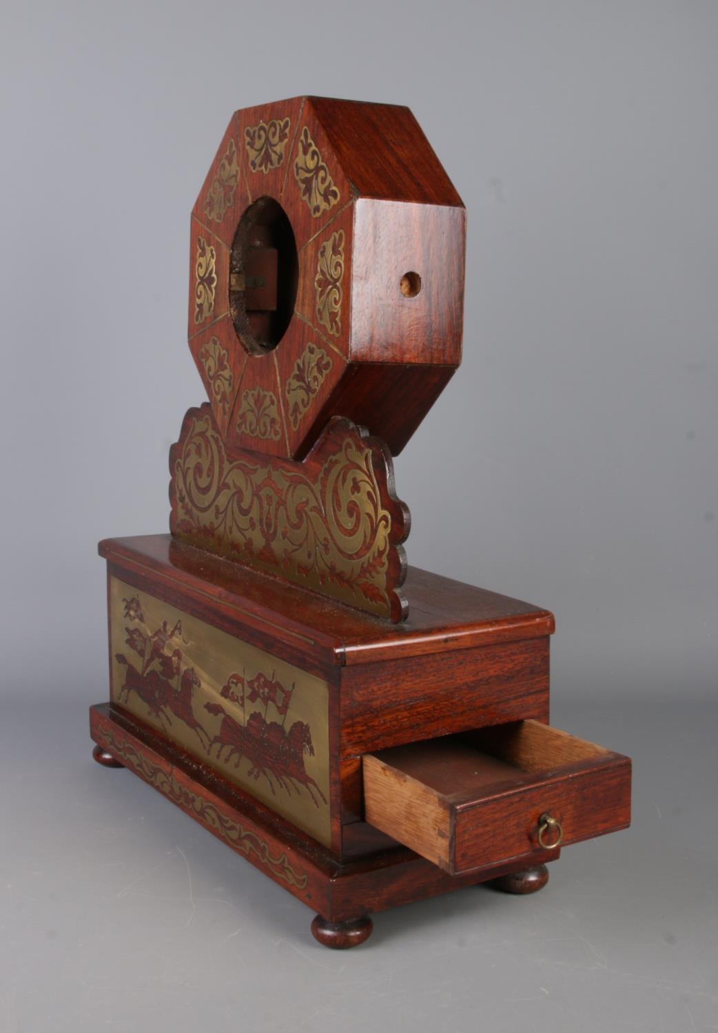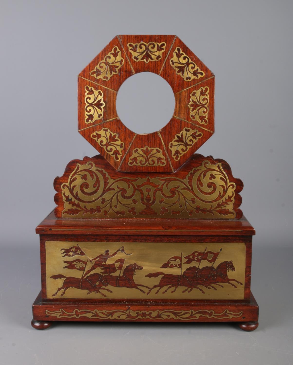 A Nineteenth century rosewood and brass inlaid mantel clock casing of octagonal form, featuring scrolled floral detailing. Mounted on rectangular base with chariot scene to the front and drawer to right hand side. Raised on bun feet. Height: 47cm.