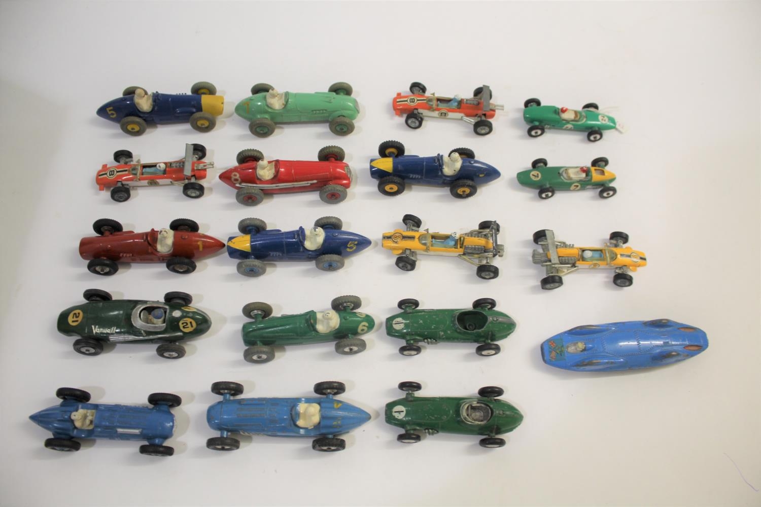 DINKY & CORGI TOYS various racing car models includes French Dinky 23j Ferrari Auto De Course in red with chrome hubs, and Dinky 233 Cooper Bristol in green with chrome hubs. (19)