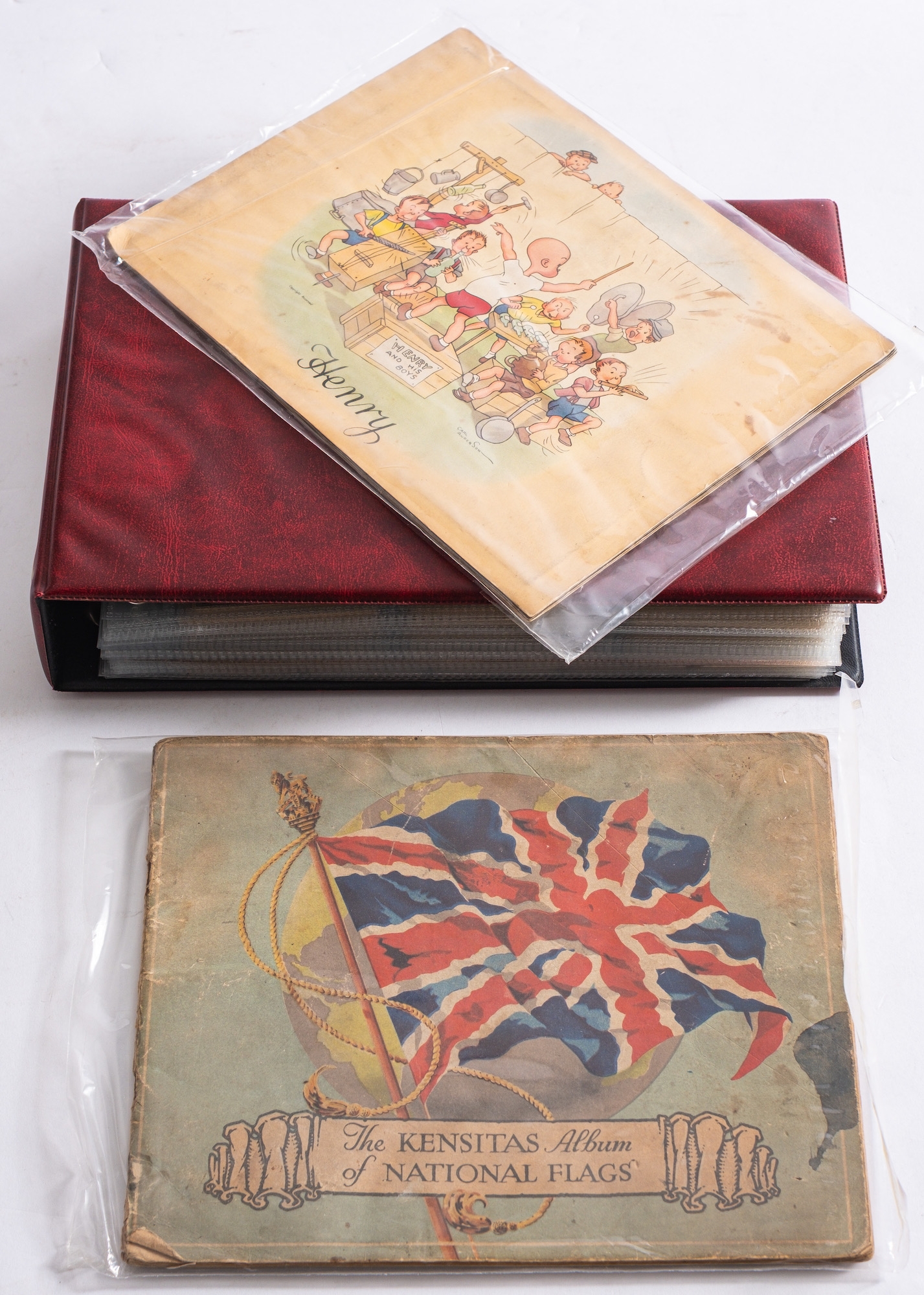 An album of Kensitas 'Henry' cigarette cards, together with several Kensitas silk flags, and similar part filled albums.