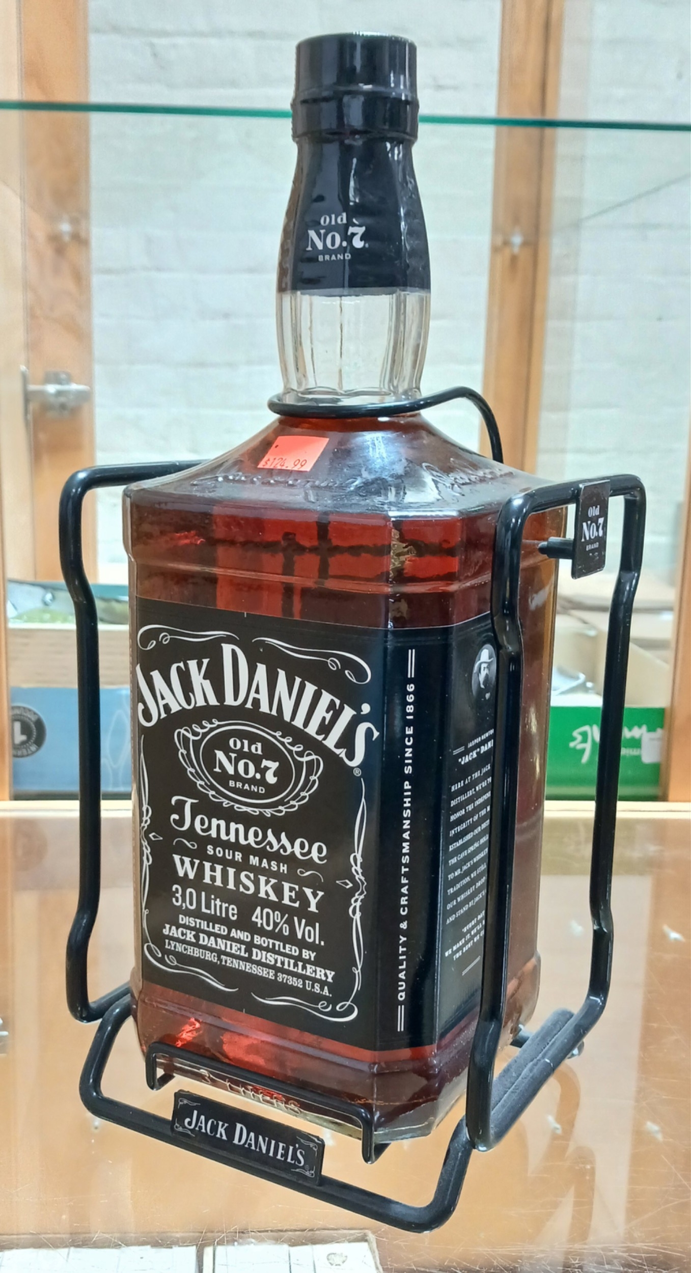 Jack Daniels Old No. 7 whisky, 3 litre bottle, sealed, with decanter swing frame.