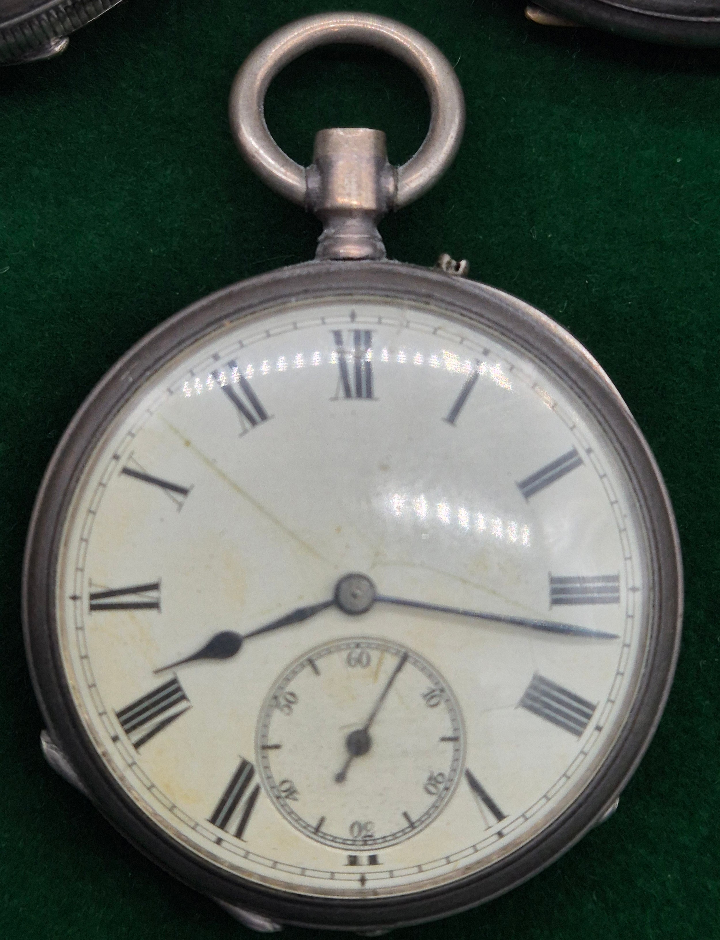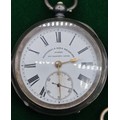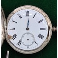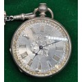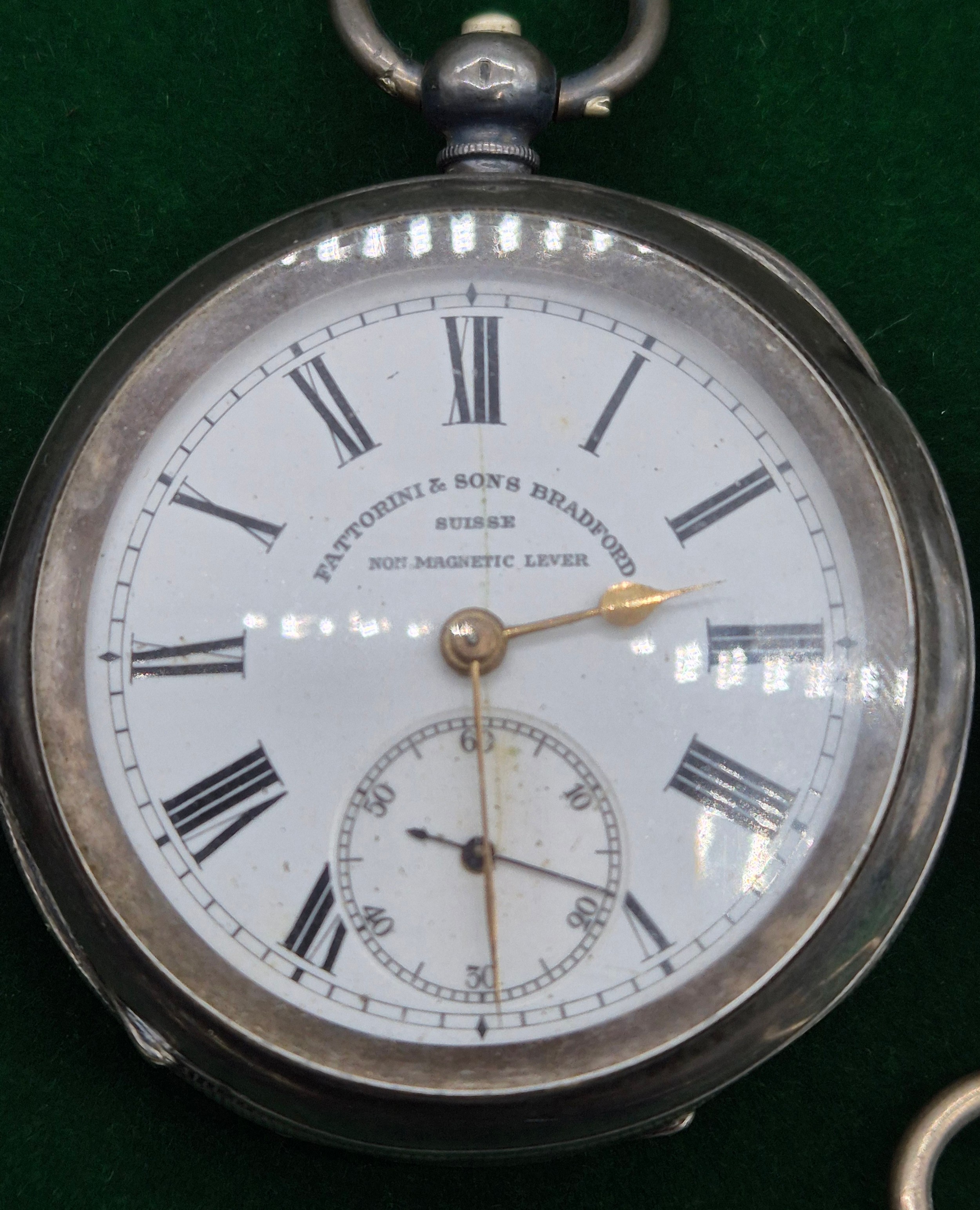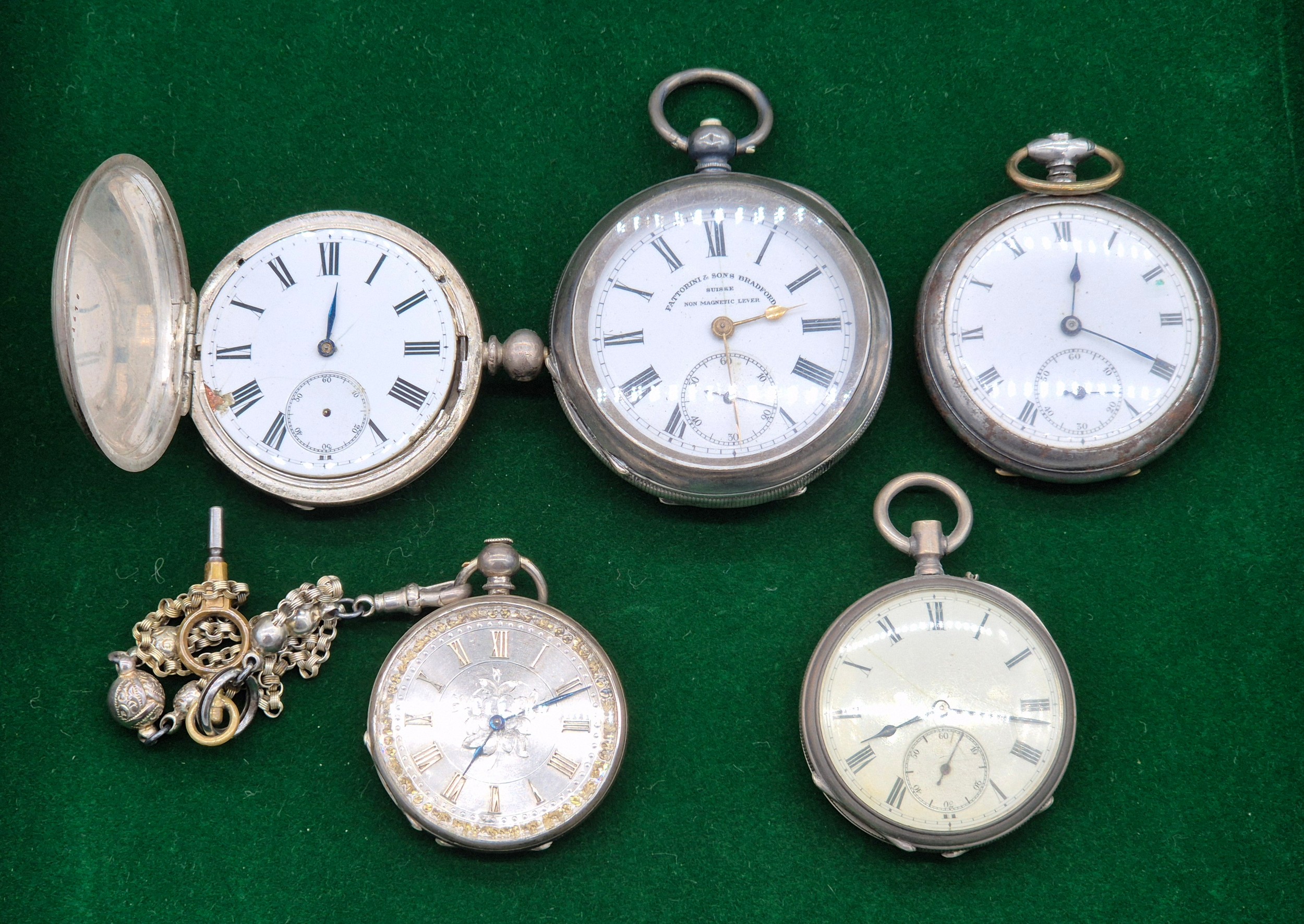 Five antique pocket watches; Four being silver cased. Silver fob watch with white metal Albert Chain. Fattorini & Sons Bradford Suisse non magnetic Lever pocket watch within a Swiss silver case. Fine silver pocket watch by Mossman Sons & Co Edinburgh and two others. All need attentions.