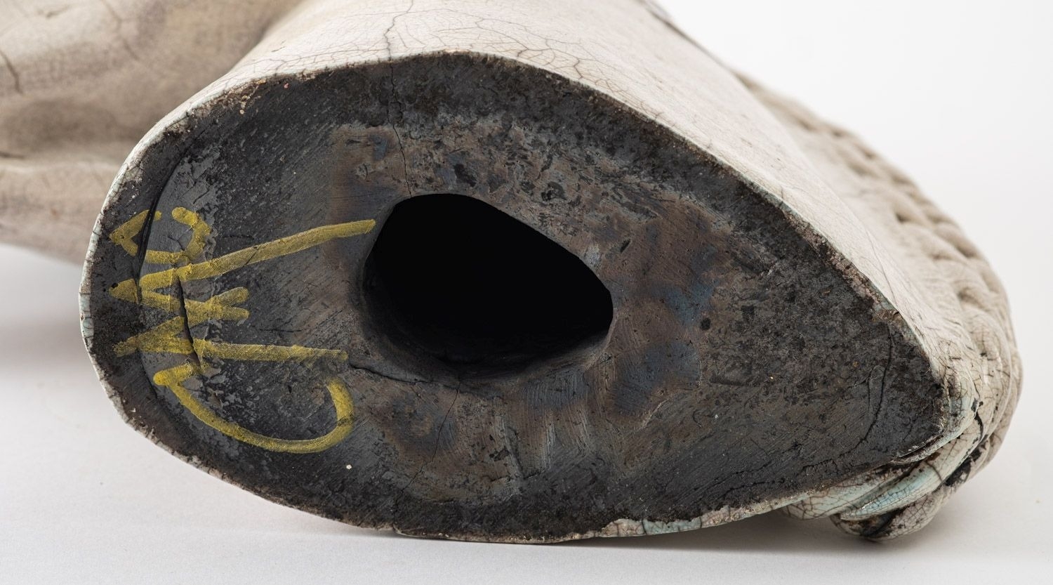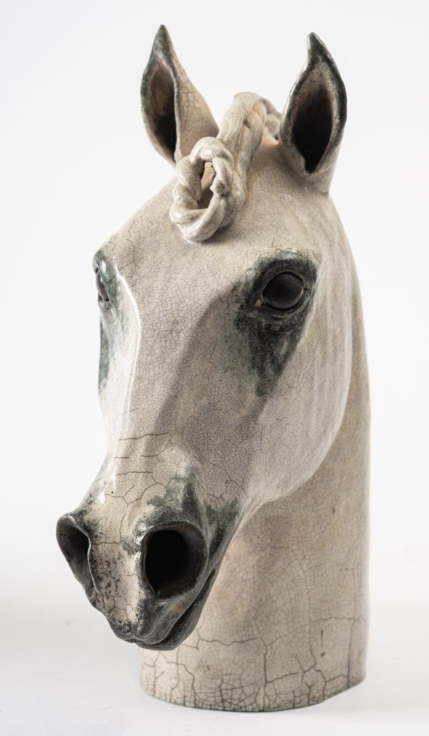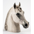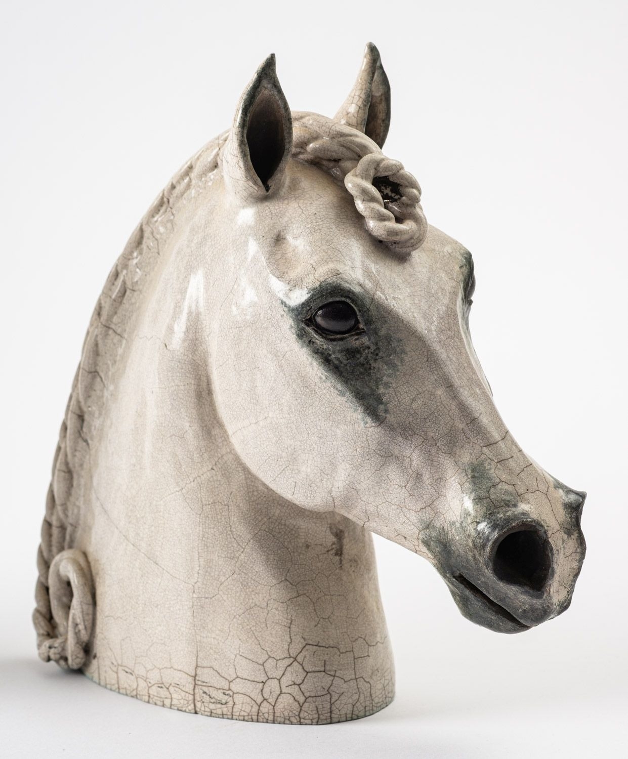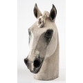 Catriona McLeod [b 1946] a raku fired stoneware sculpture, of a horses head with plaited mane, 29.5cm high, painted CWC to base.