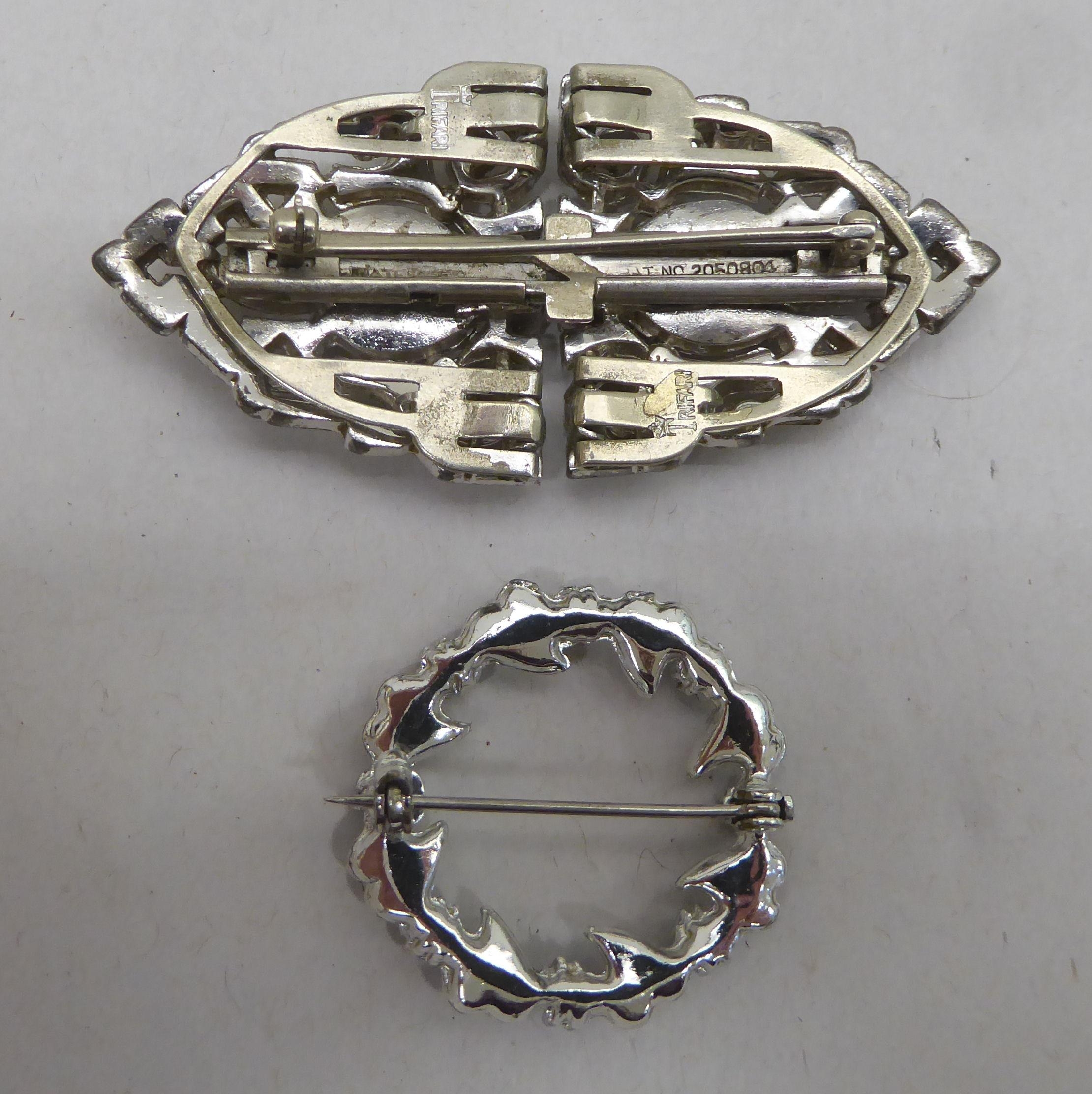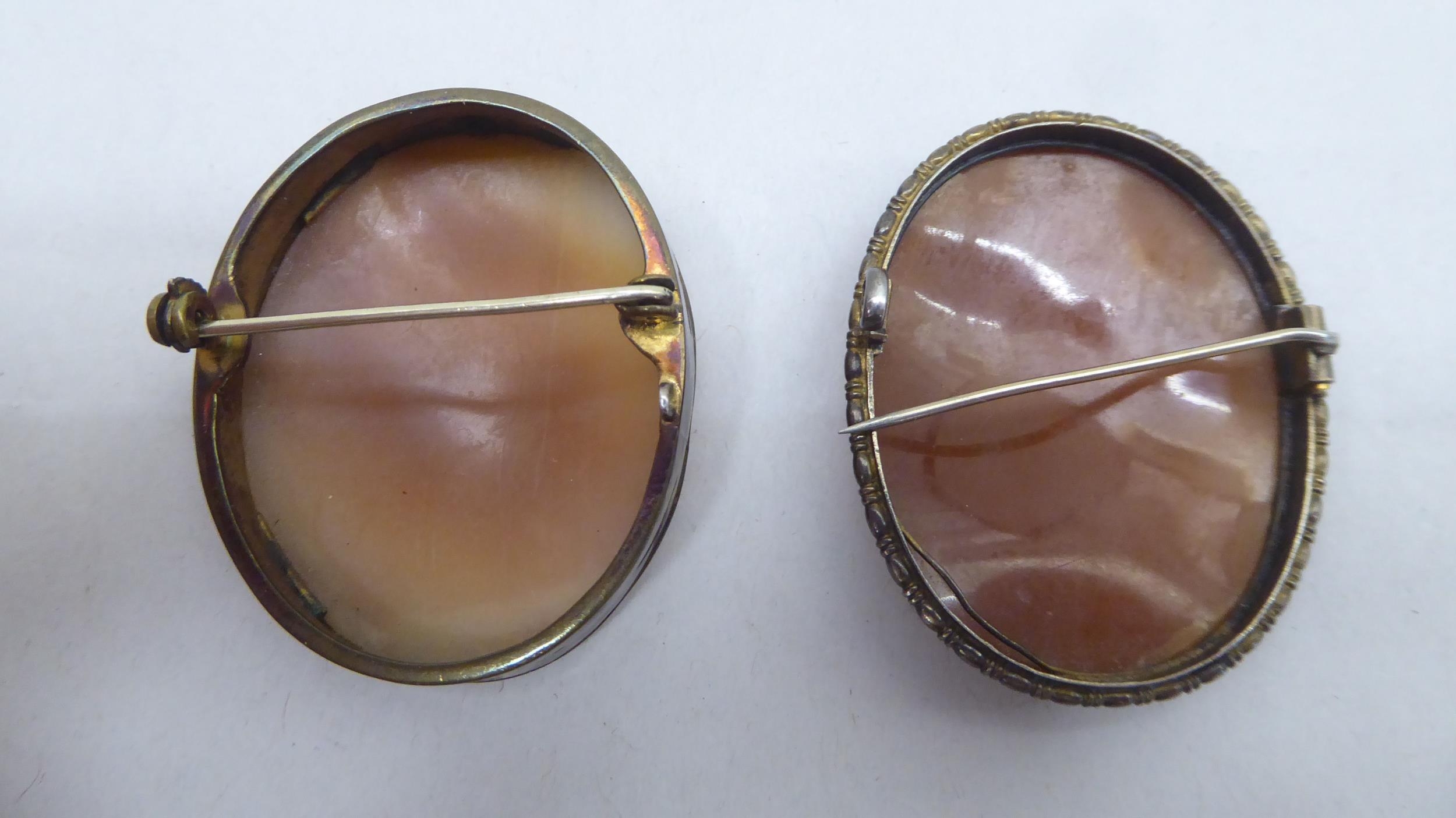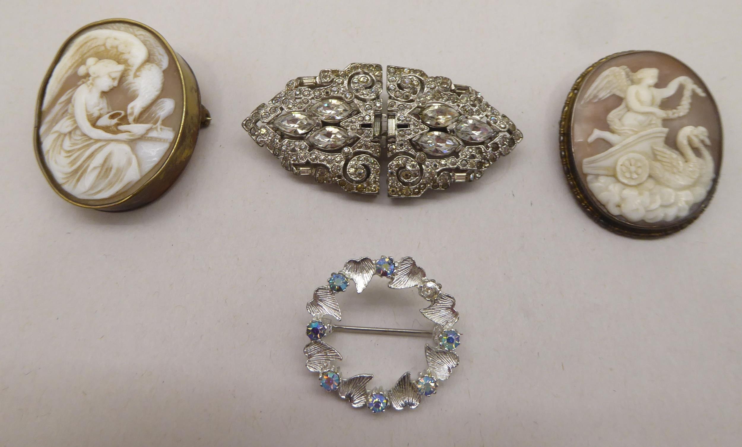 Two cameo brooches; a circular brooch; and a clasp brooch